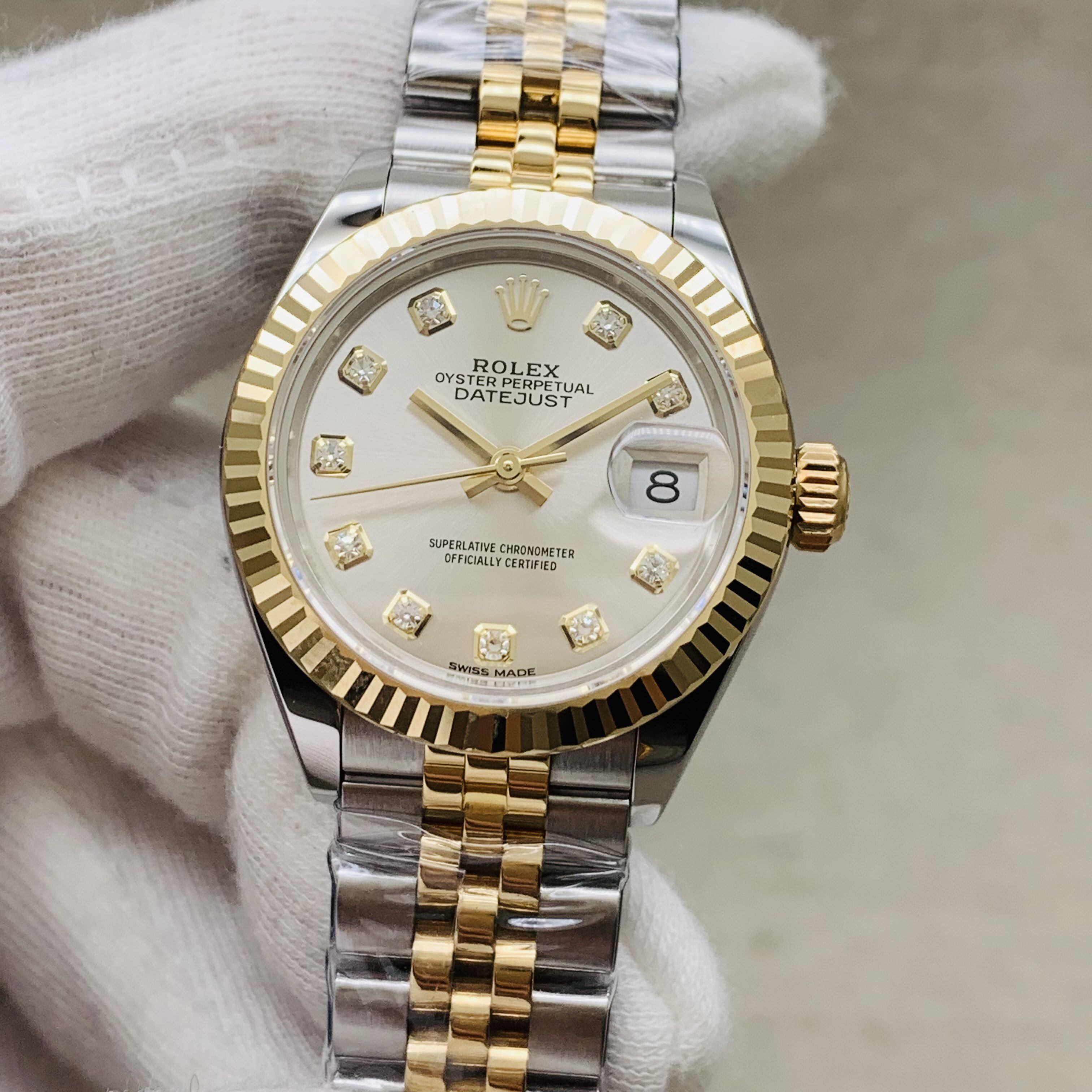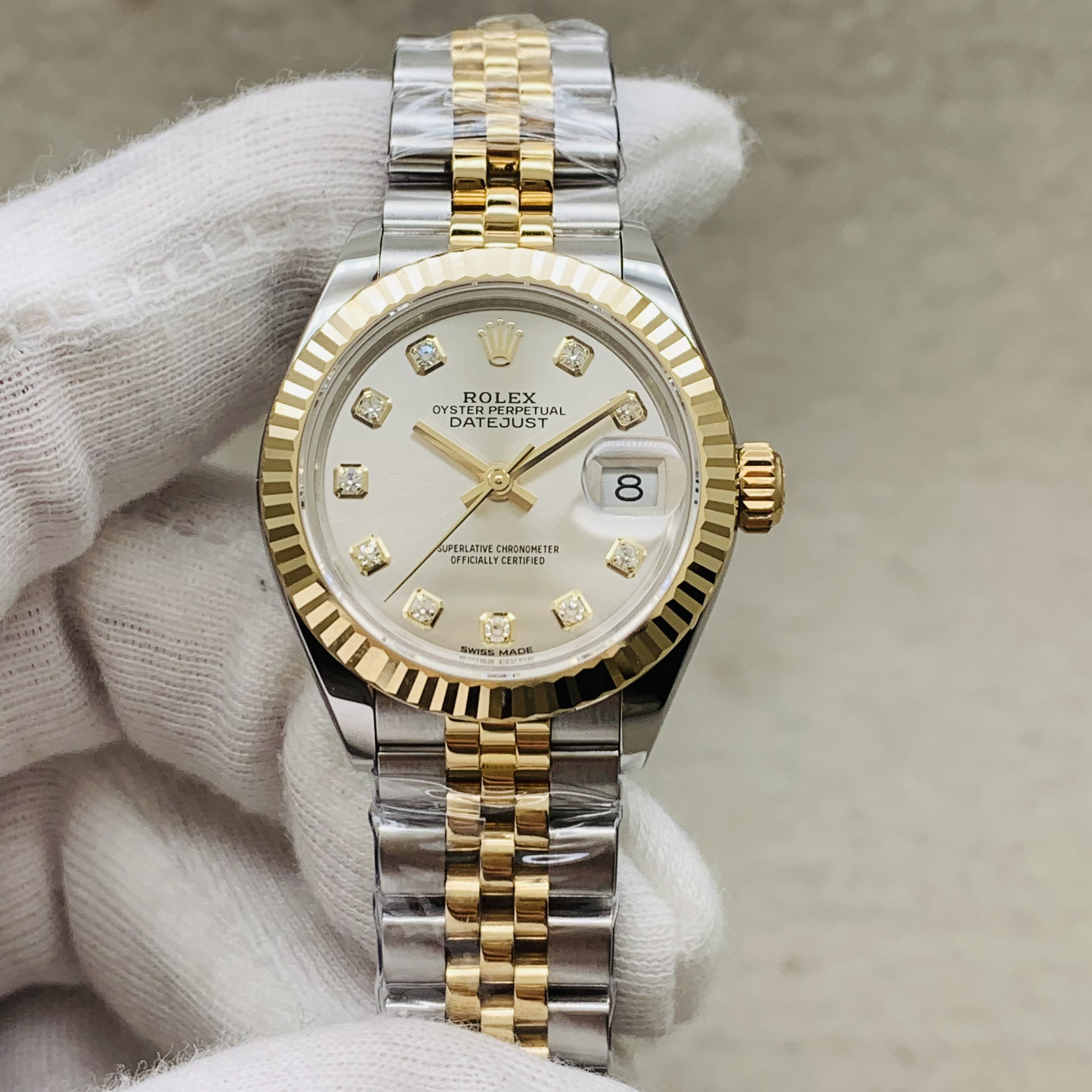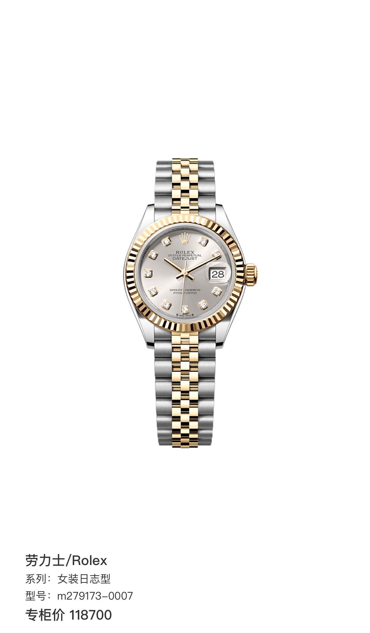 劳力士/女装日志型 m279173-0007 单表无附件 女士机械腕表 黄金外圈 间金表带 银盘带钻 表径28 专柜价118700 二手好价。