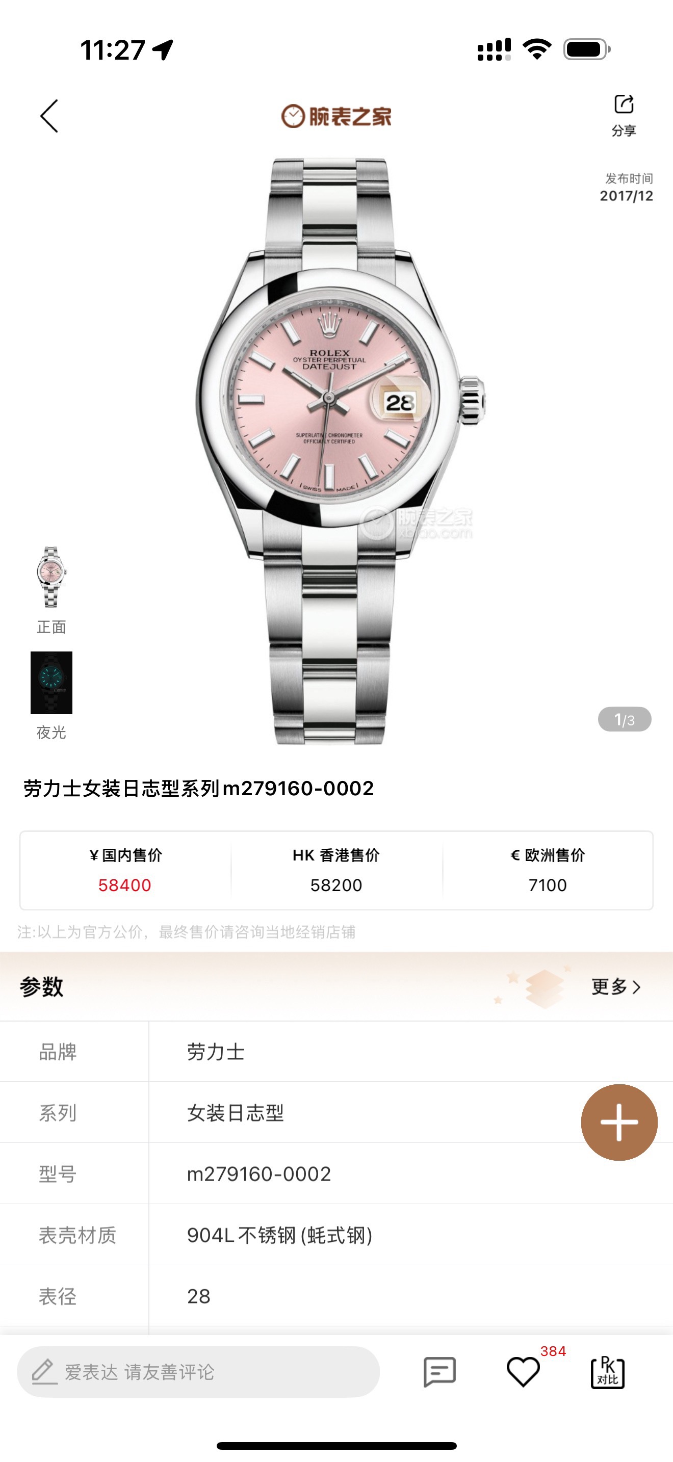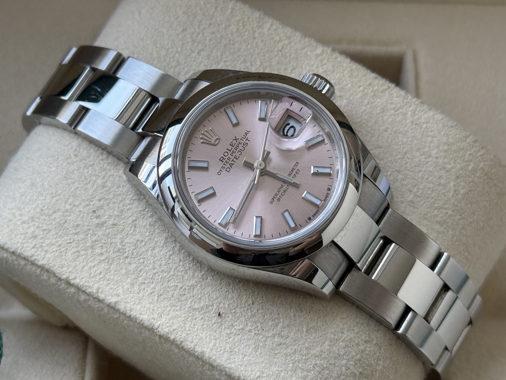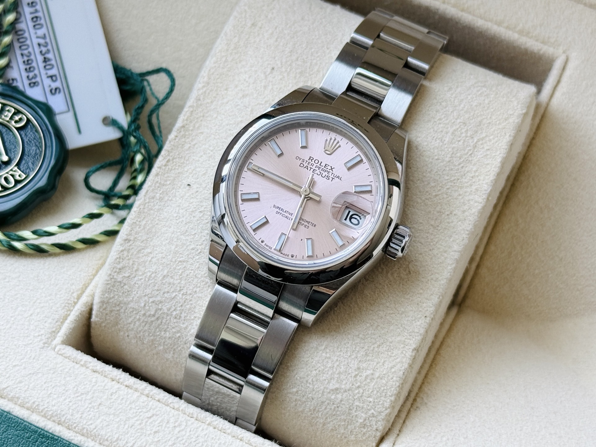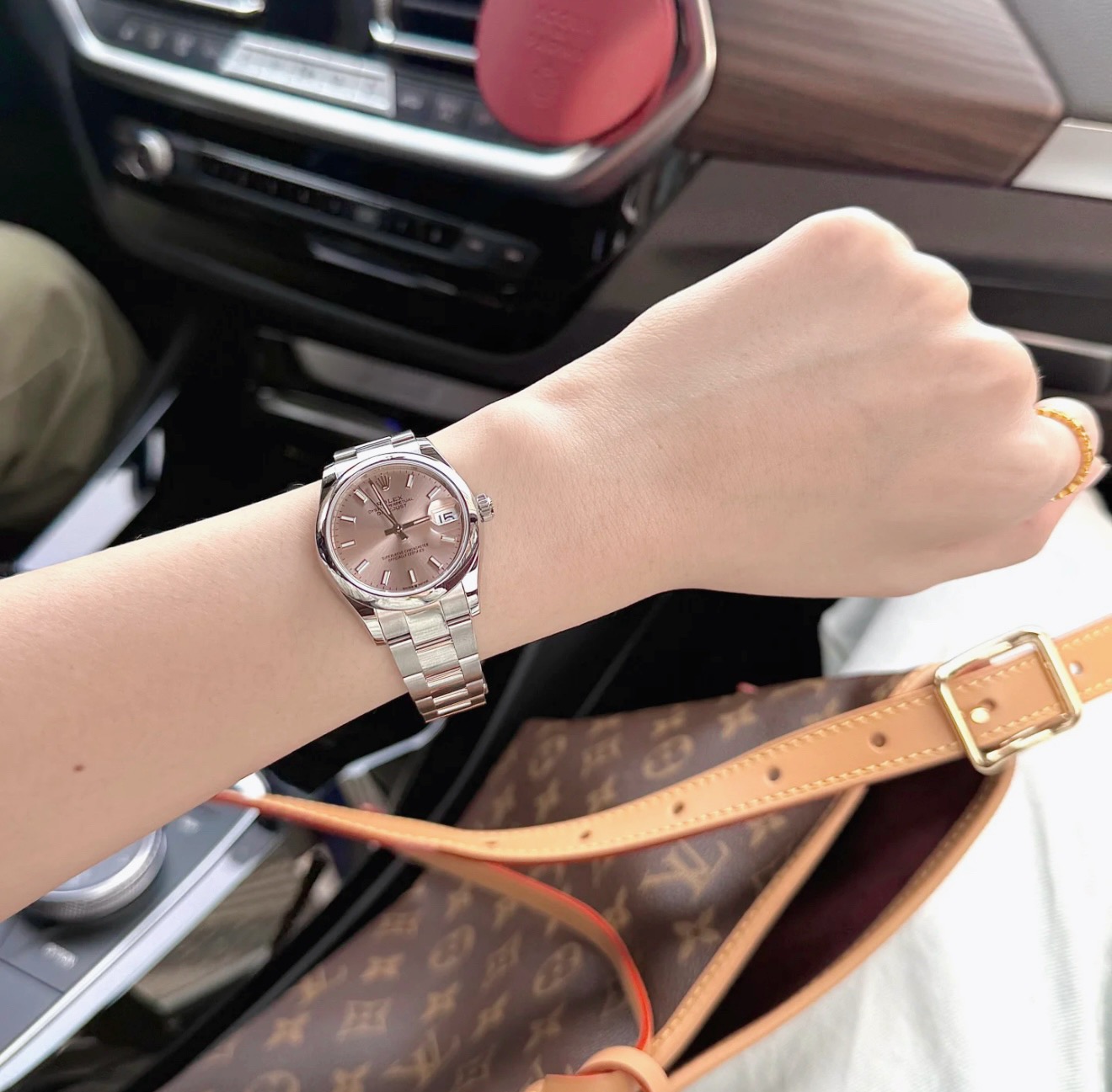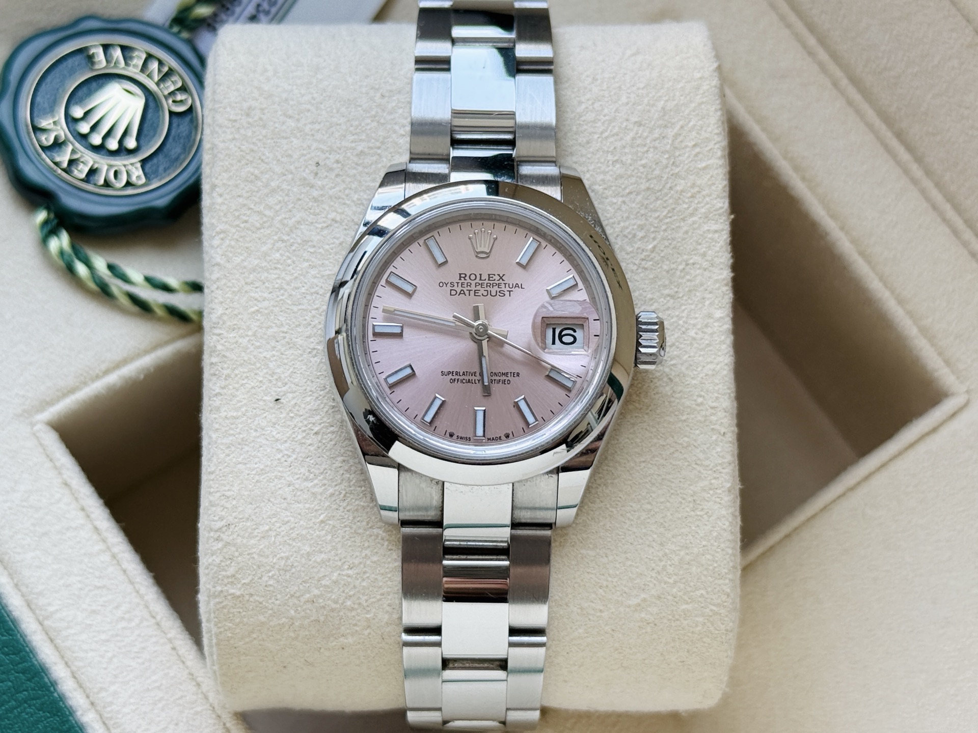 劳力士m279160-0002女装日志型,条刻樱花粉盘,表径28mm,全长少2节,全套附件如图带票,专柜公价:58400元,秒杀蓝气球