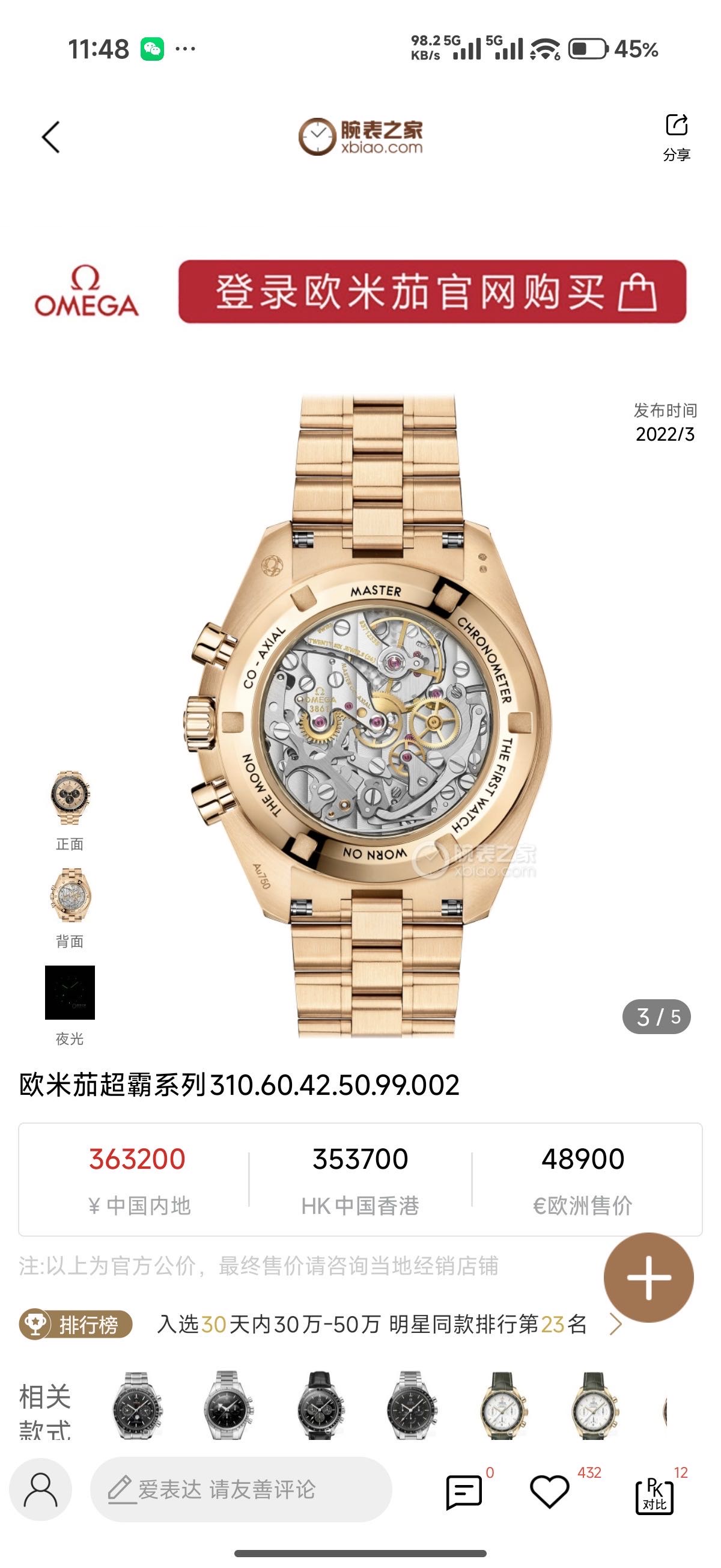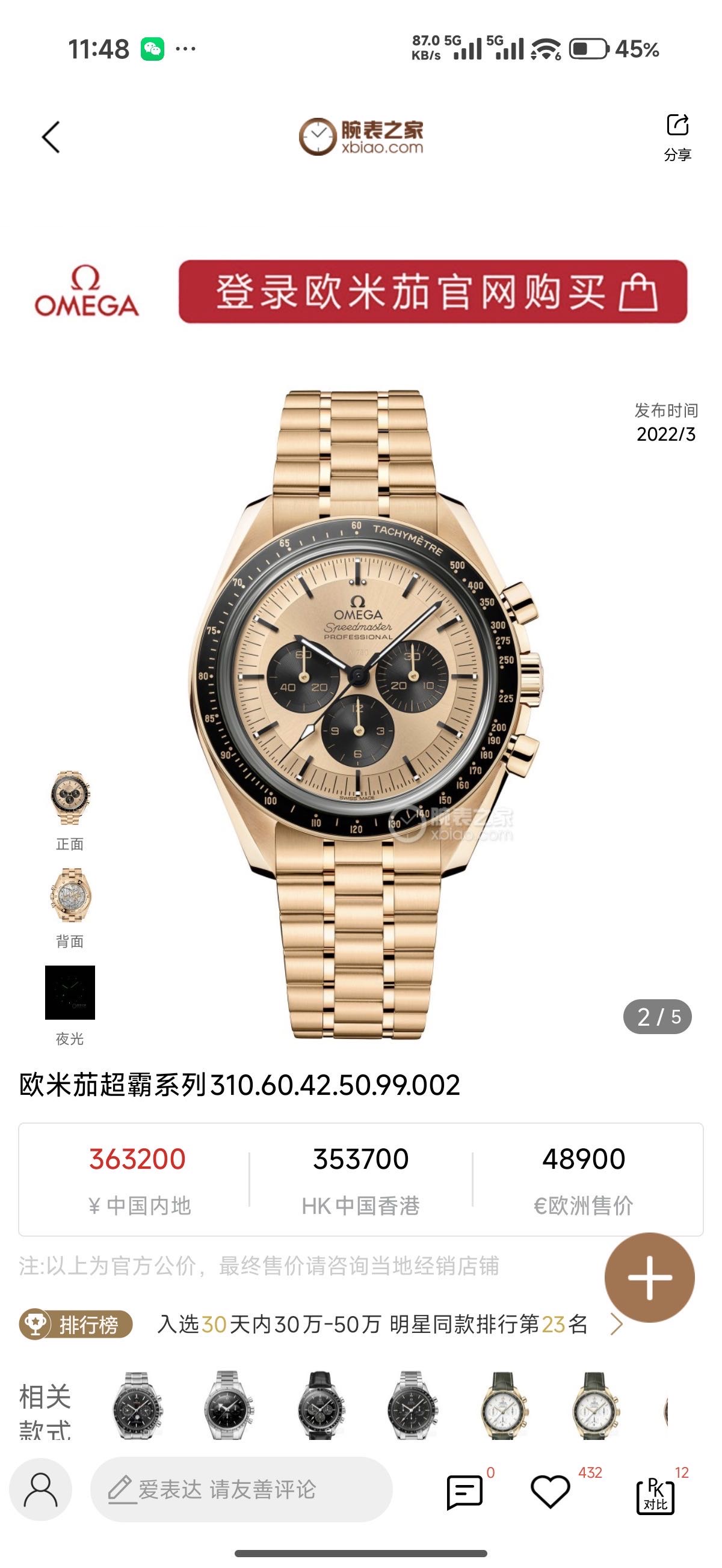 欧米茄/Omega 超霸系列 310.60.42.50.99.002 手动上链 Moonshine 18K金 42 专柜价363200