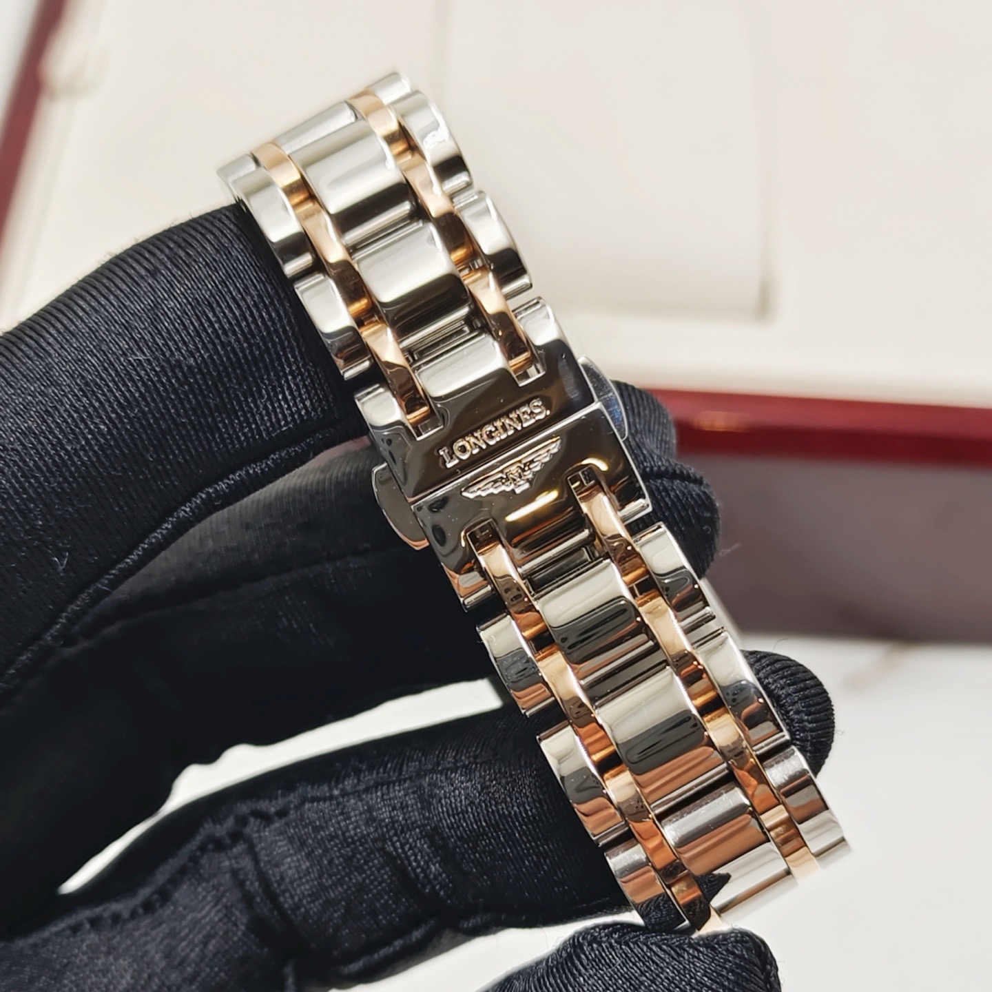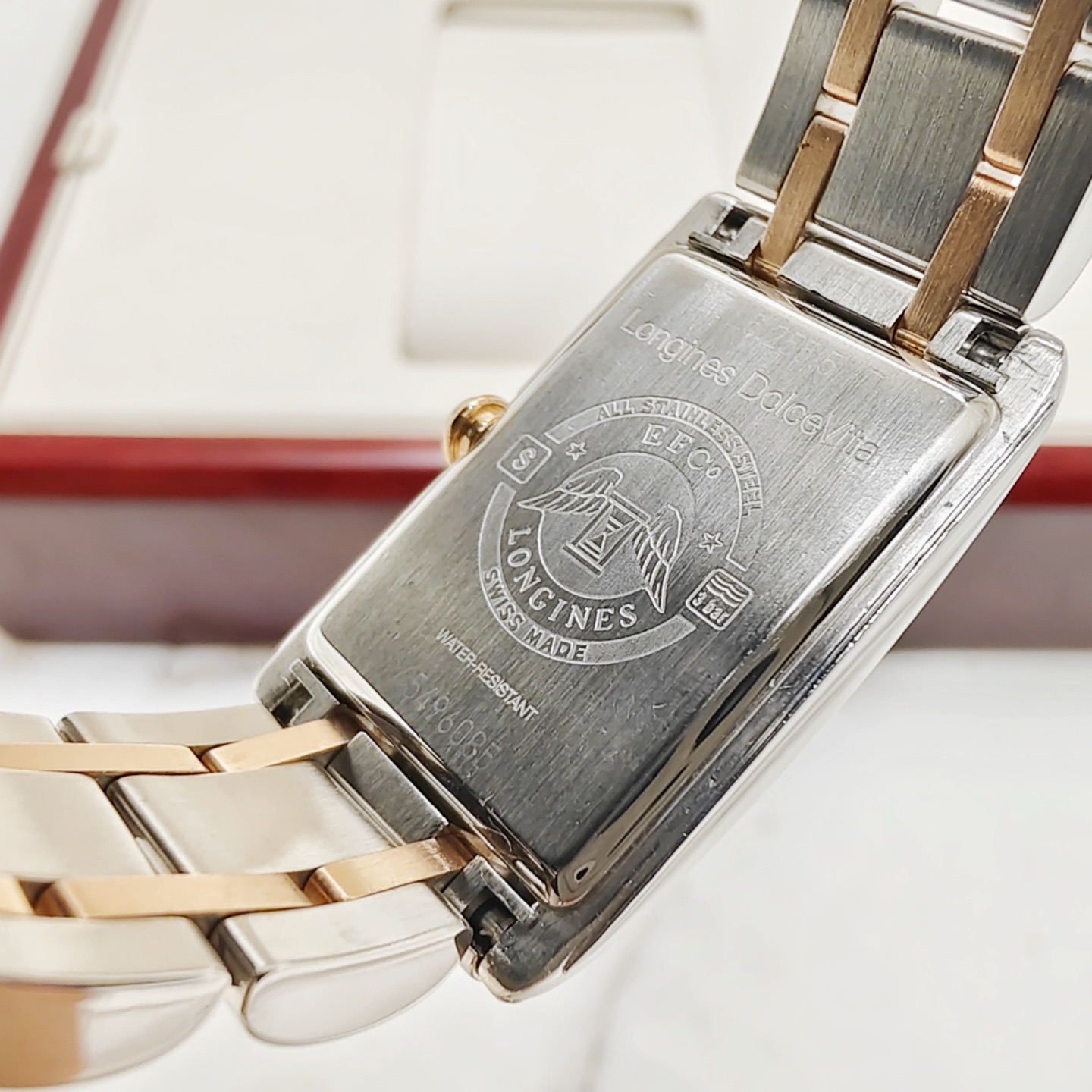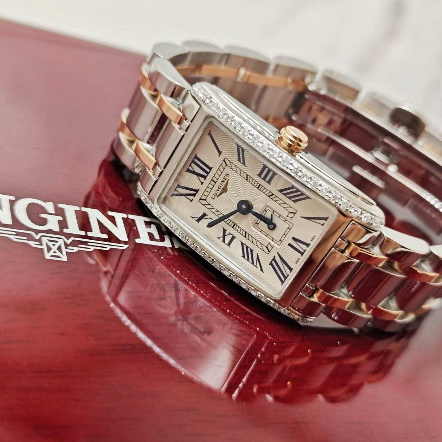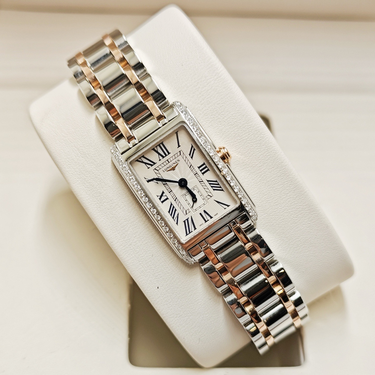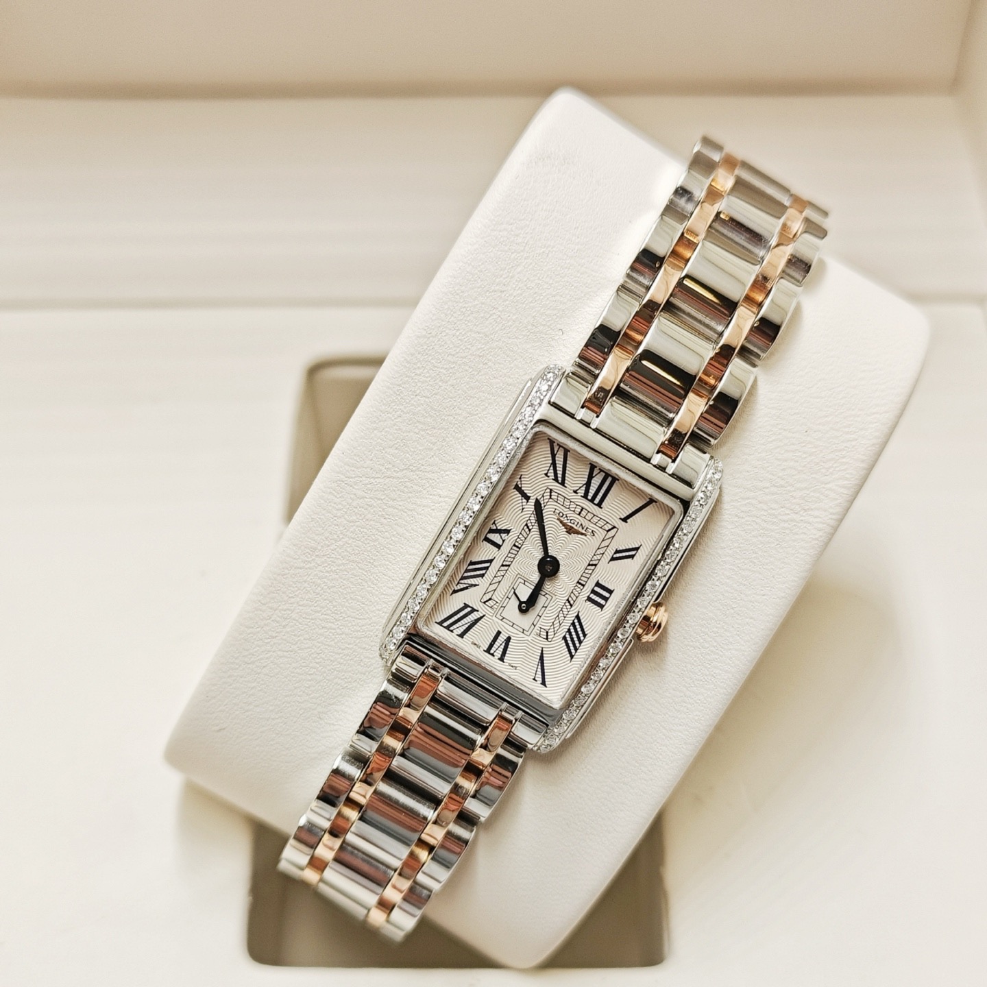 浪琴黛卓维纳系列L5.255.5.79.7后镶钻石英间金女表,20.80 x 32.00毫米,银色"flinqué"饰纹,漆绘罗马数字,蓝钢指针,原钻专柜34900