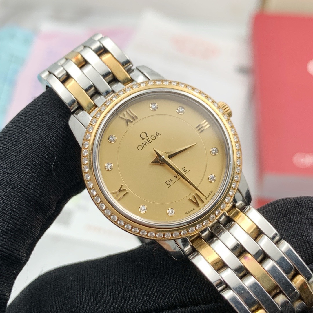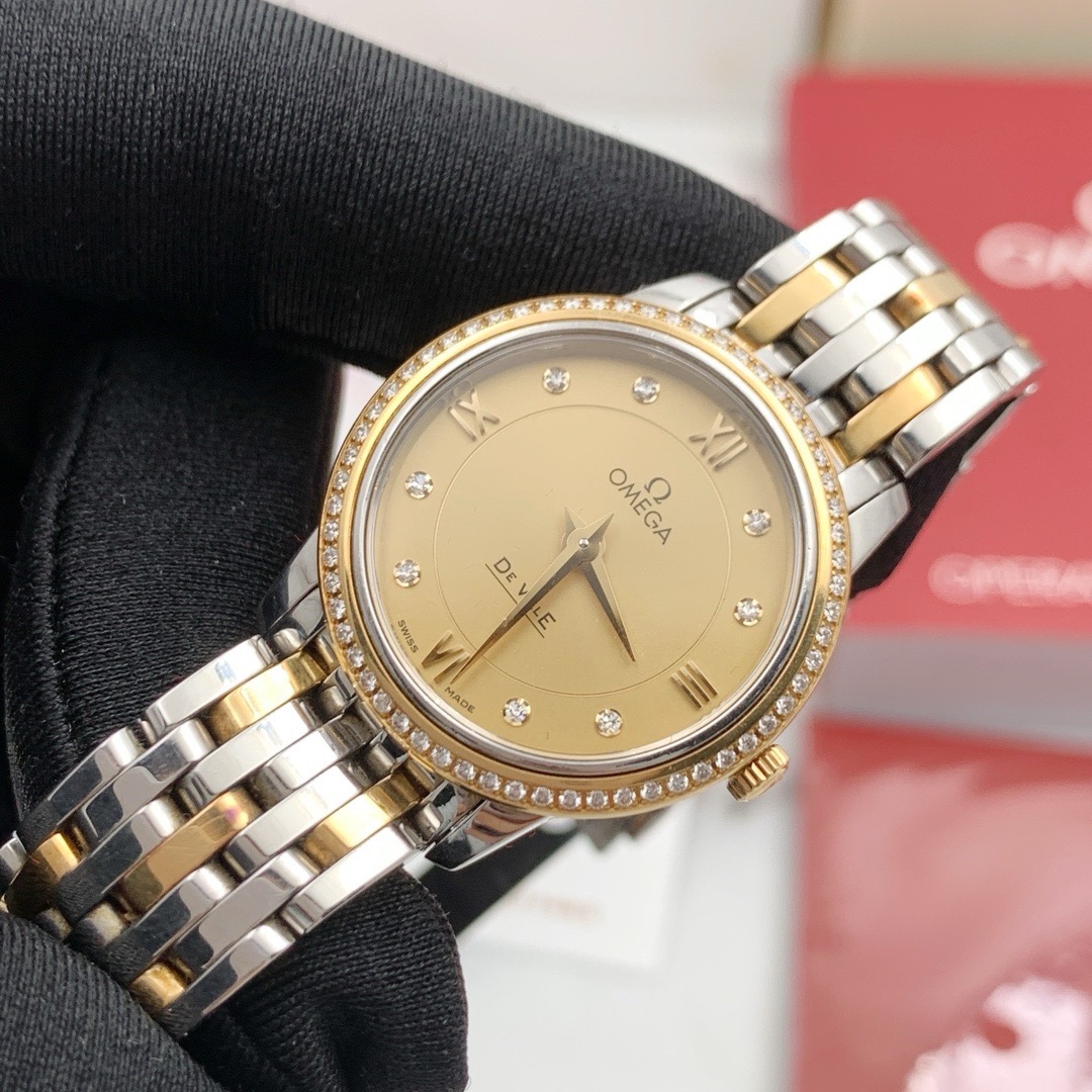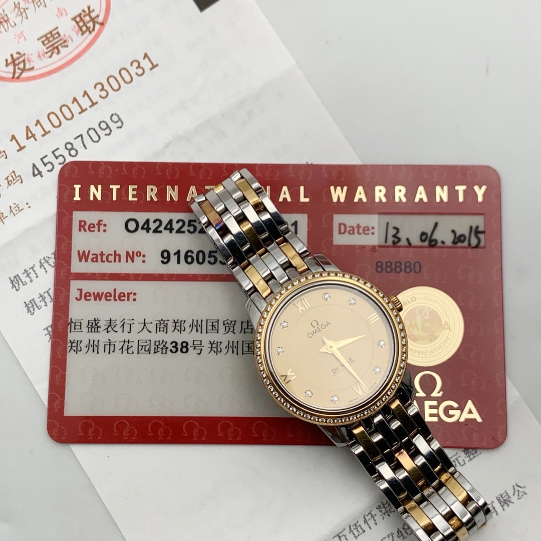 欧米茄碟飞系列、424.25.27.60.58.001、女士精准石英腕表、表径:27.4mm、材质:精钢/18k黄金、外圈加刻度原钻、间金表带、香槟色表盘、罗马数字钻石刻度、全套附件带发票、专柜售价92100