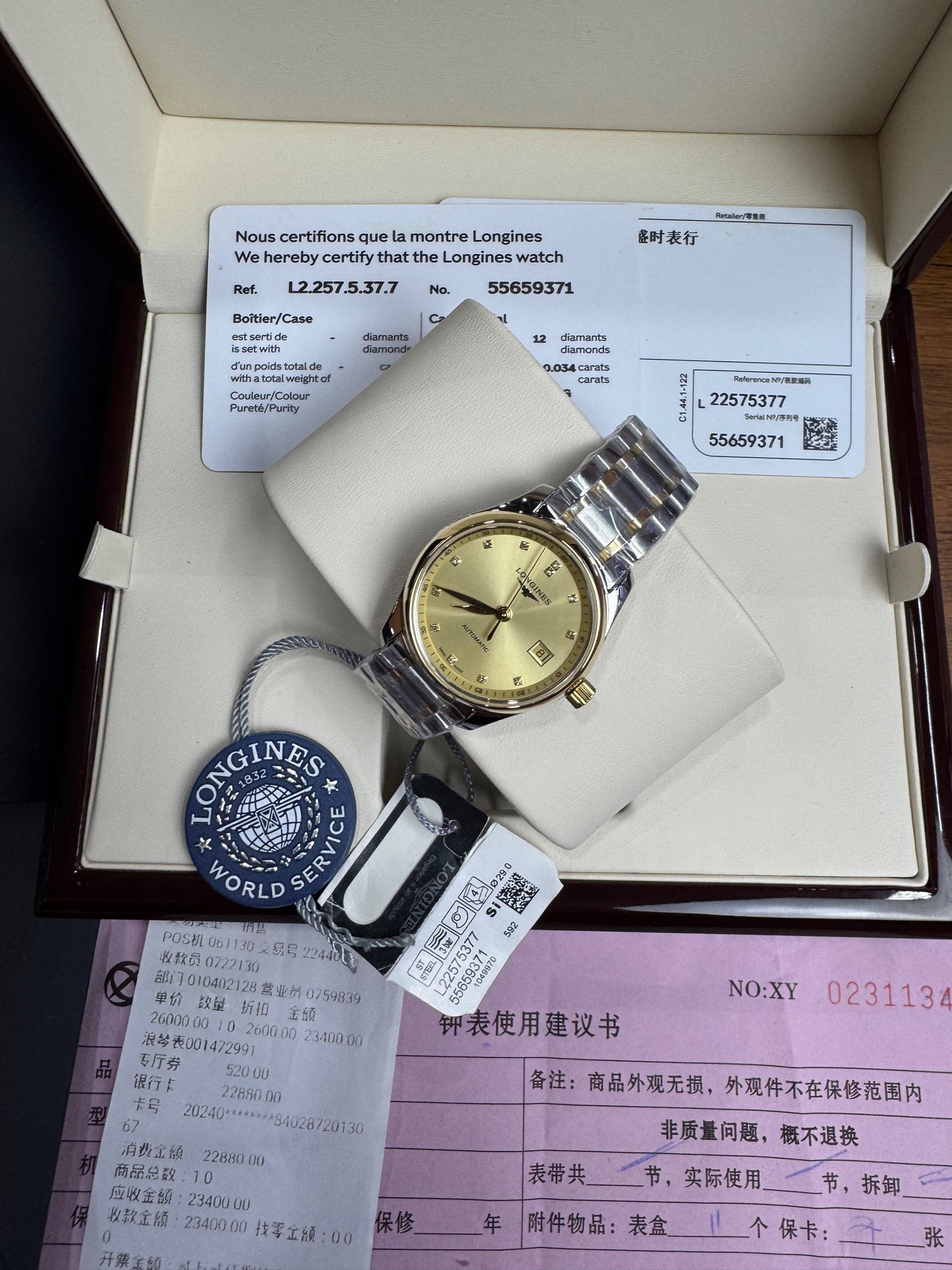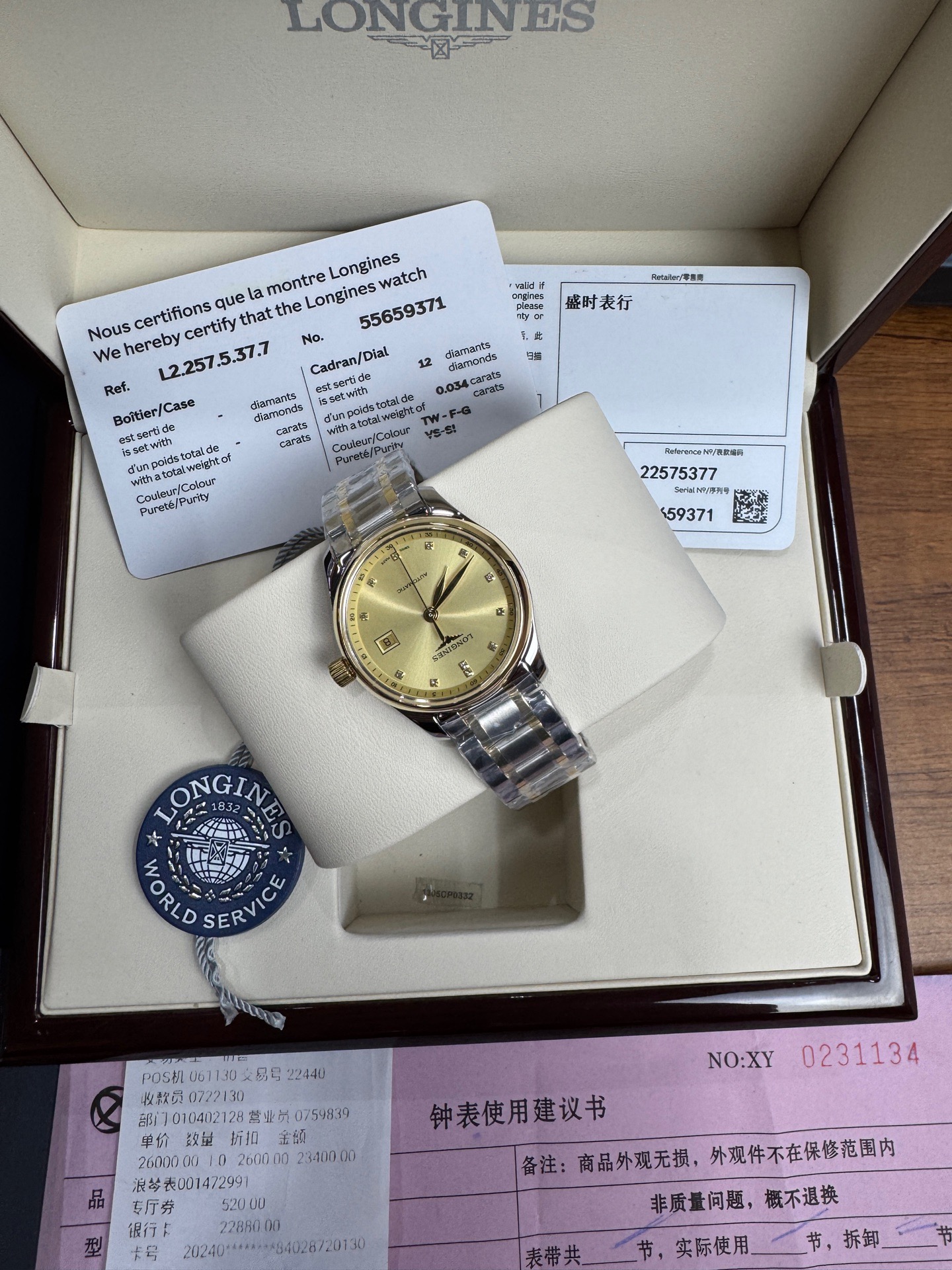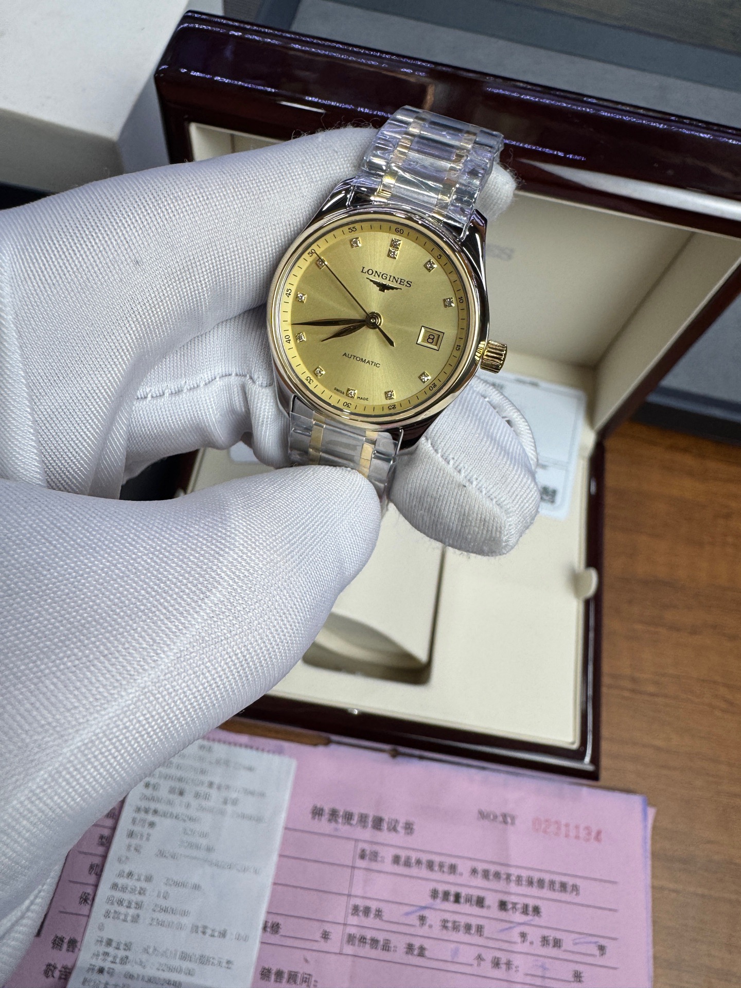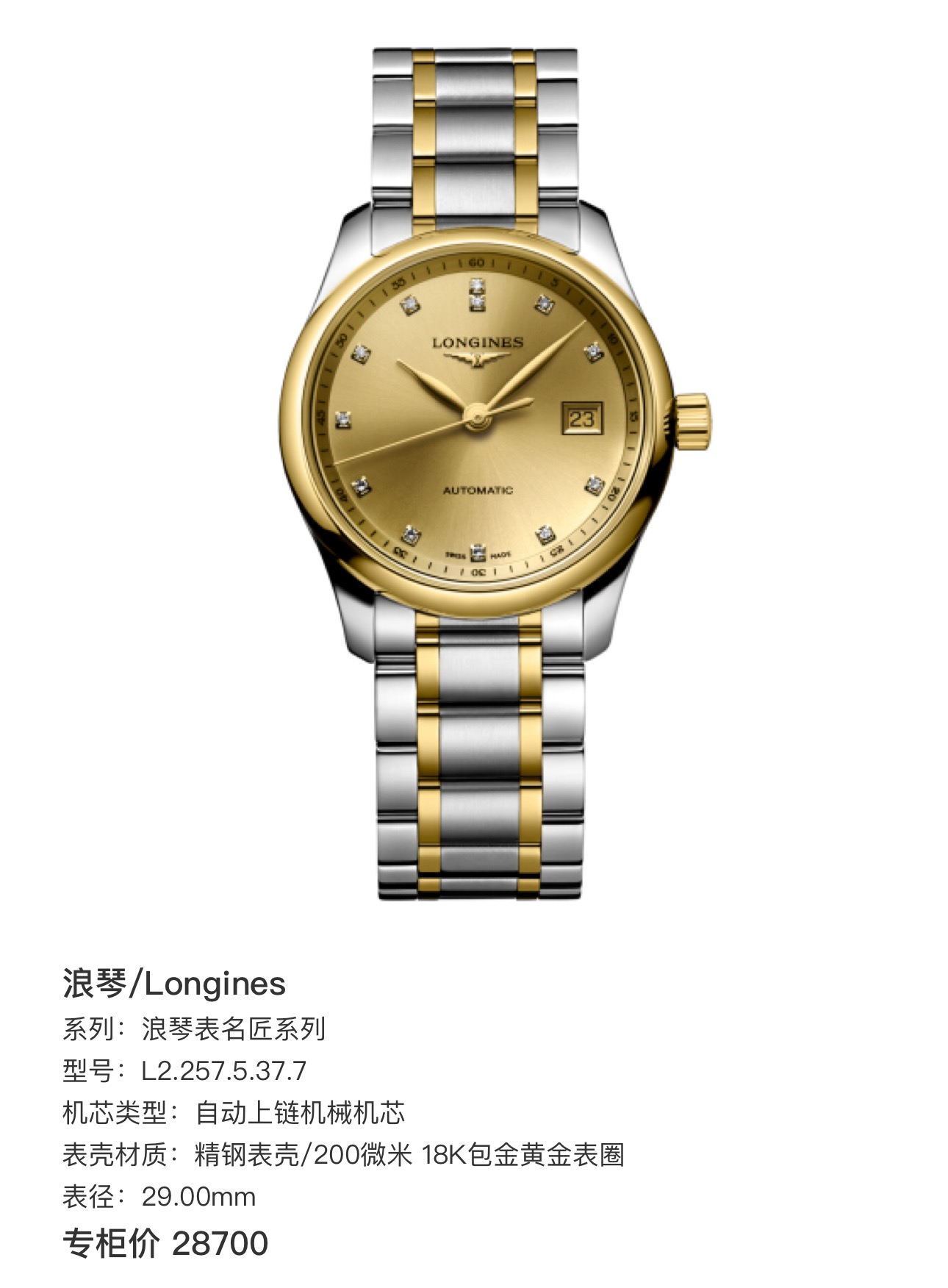 浪琴/Longines 浪琴表名匠系列 L2.257.5.37.7 自动上链机械机芯 精钢表壳/200微米 18K包金黄金表圈 29.00mm 专柜价28700