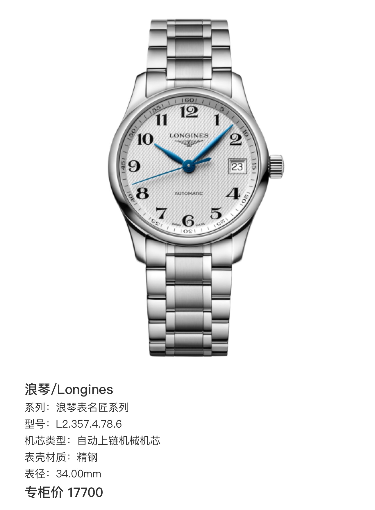自动上链机械机芯 精钢 34.00mm 专柜价17700
