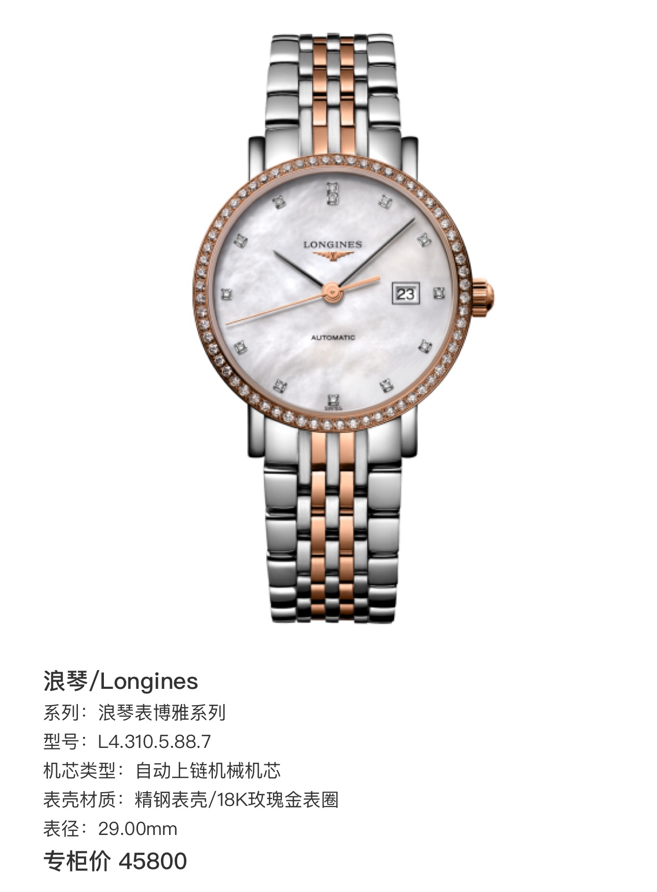 浪琴/Longines 浪琴表博雅系列 L4.310.5.88.7 自动上链机械机芯 精钢表壳/18K玫瑰金表圈 29.00mm 专柜价45800
