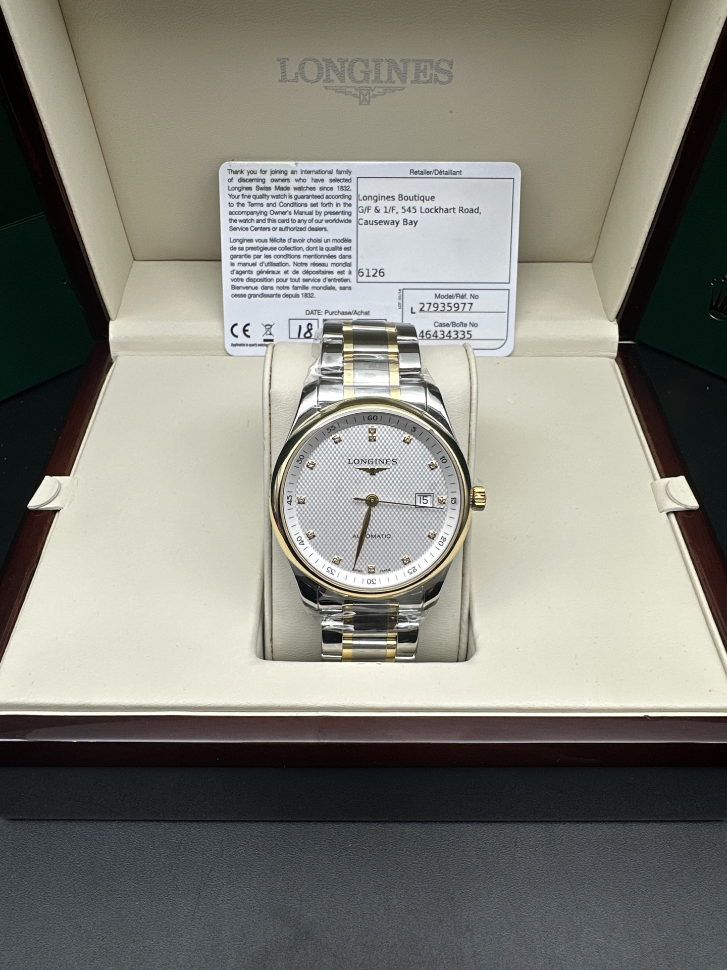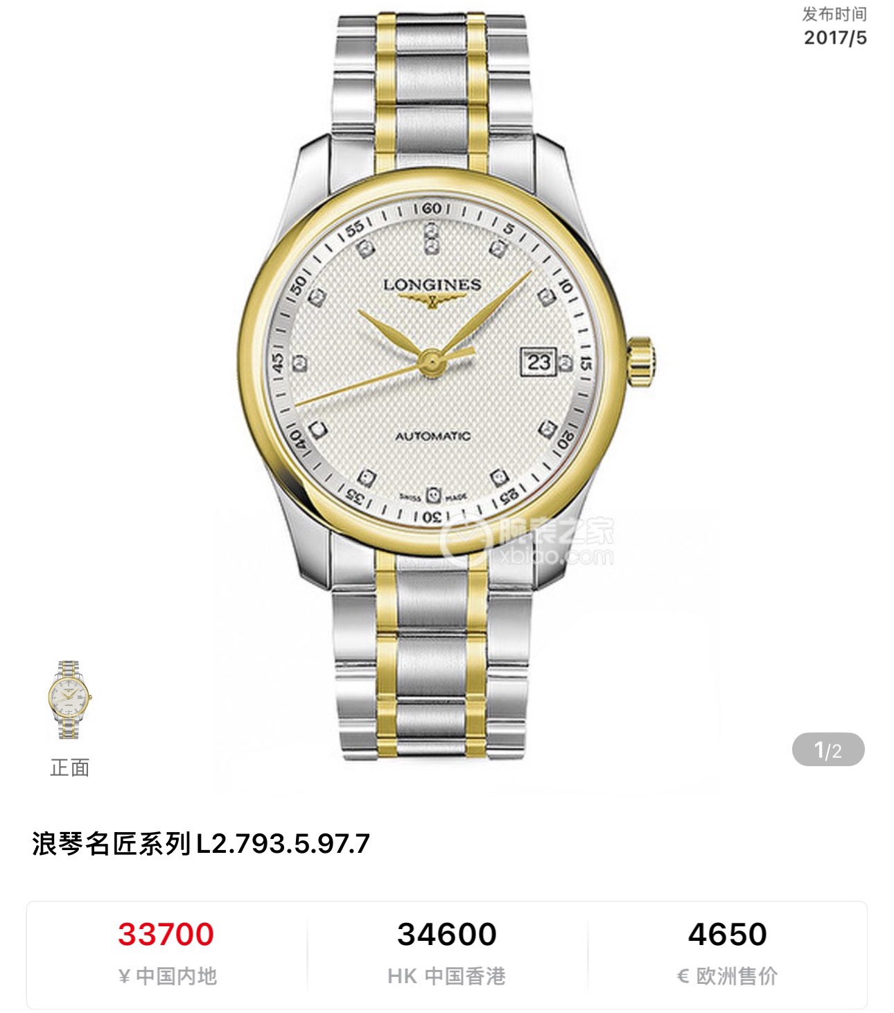 近新品浪琴名匠系列L2.793.5.97.7 男款自动机械腕表 表经40毫米 蓝宝石镜面 白色表盘 钻石刻度 日期显示 整表黄色为18K纯金材质 2025年11月18日收购 近新品状态 专柜售价33700 现货好价