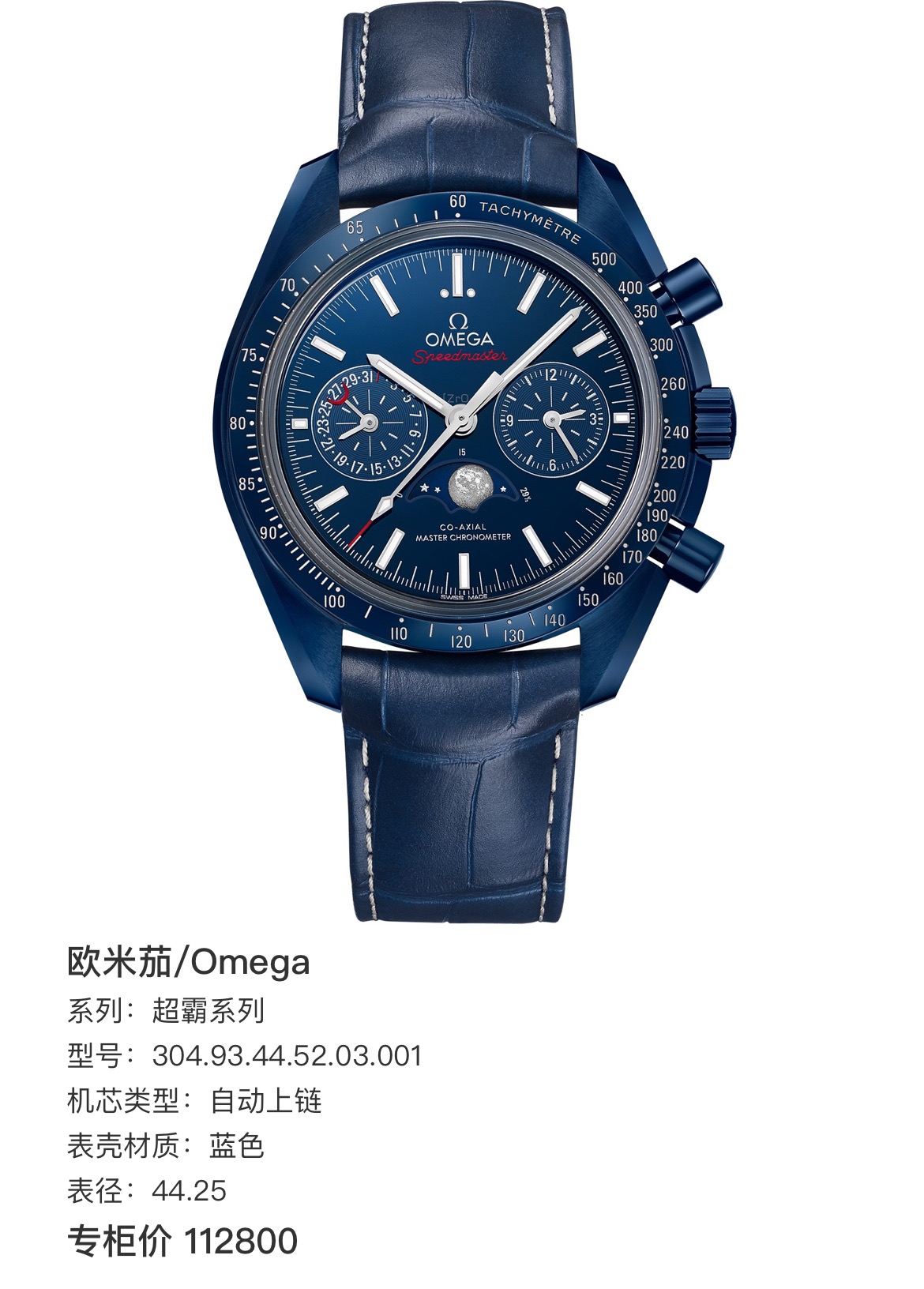 欧米茄/Omega 超霸系列304.93.44.52.03.001,月之幽蓝,自动上链,蓝色,表径44.25毫米,专柜价112800,未使用