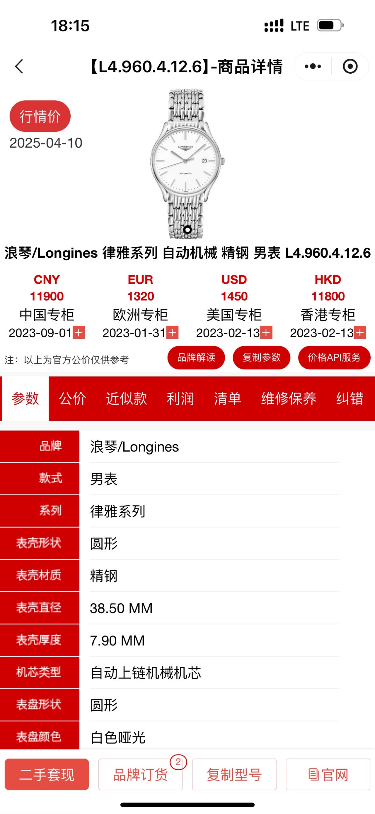浪琴律雅L4.960.4.12.6机械男性