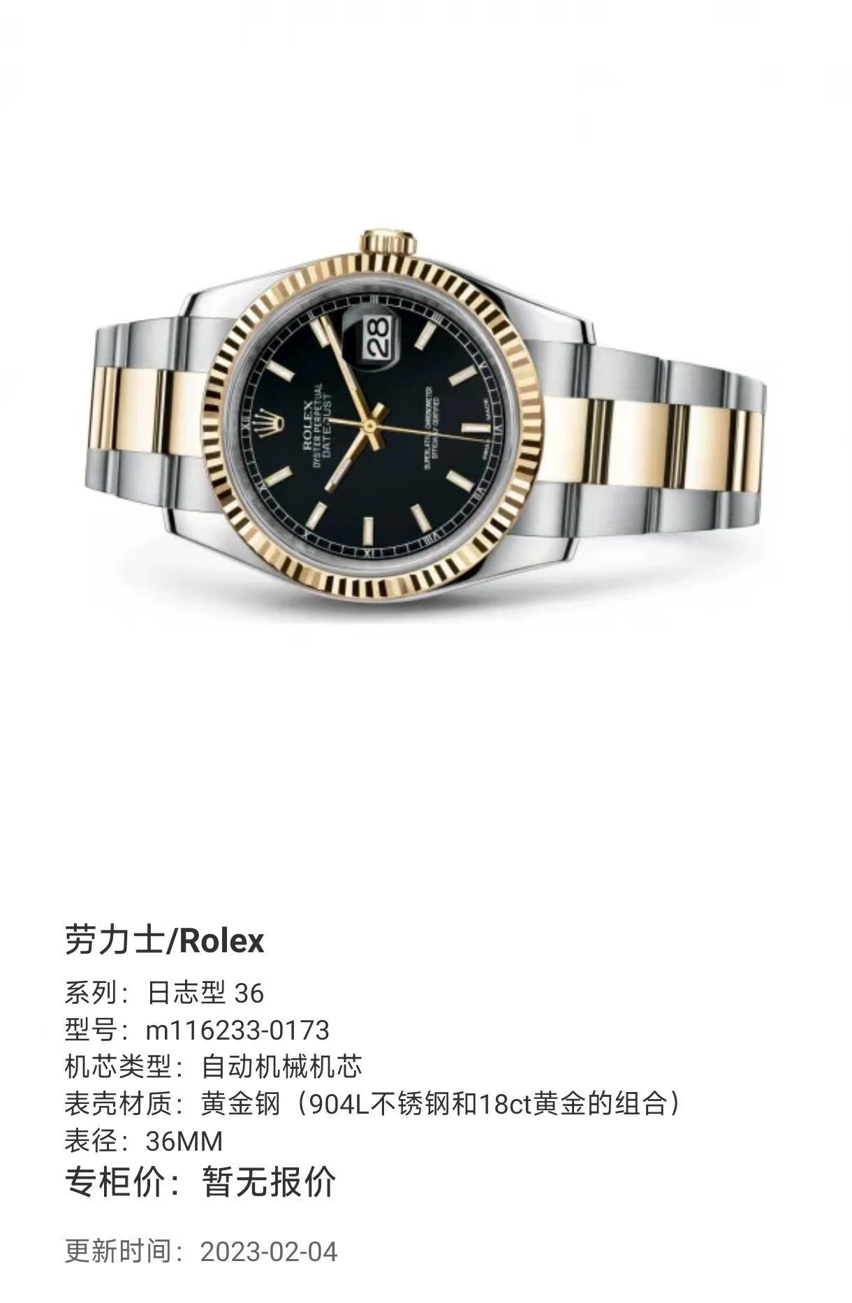 劳力士/Rolex 36日志型m116233-0173 自动机械机芯 黄金钢(904L不锈钢和18ct黄金的组合) 36MM 专柜价88500 现好价