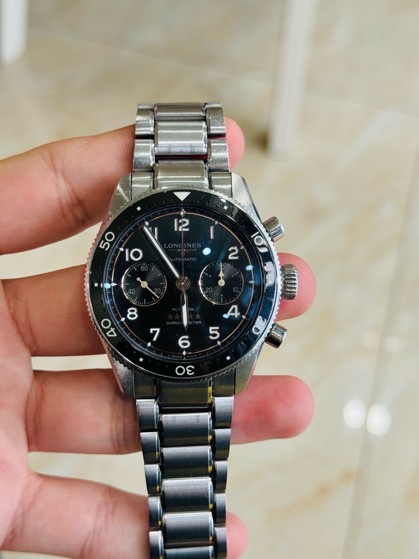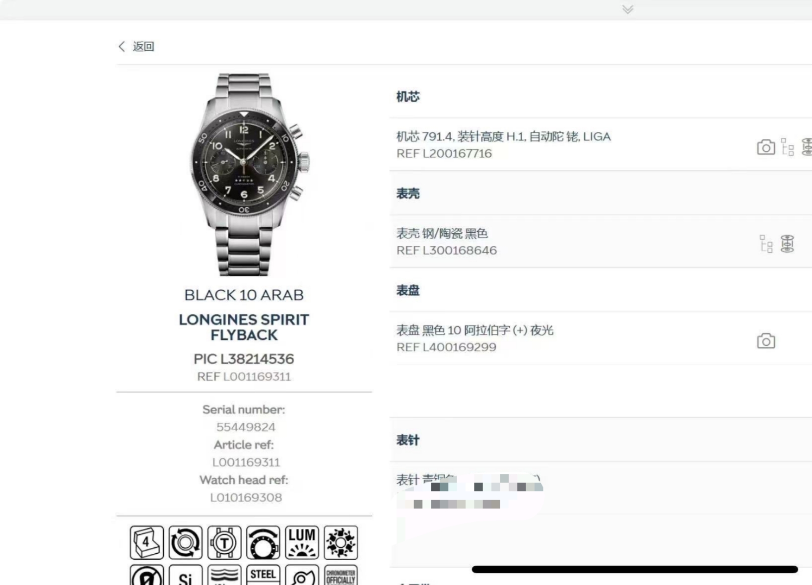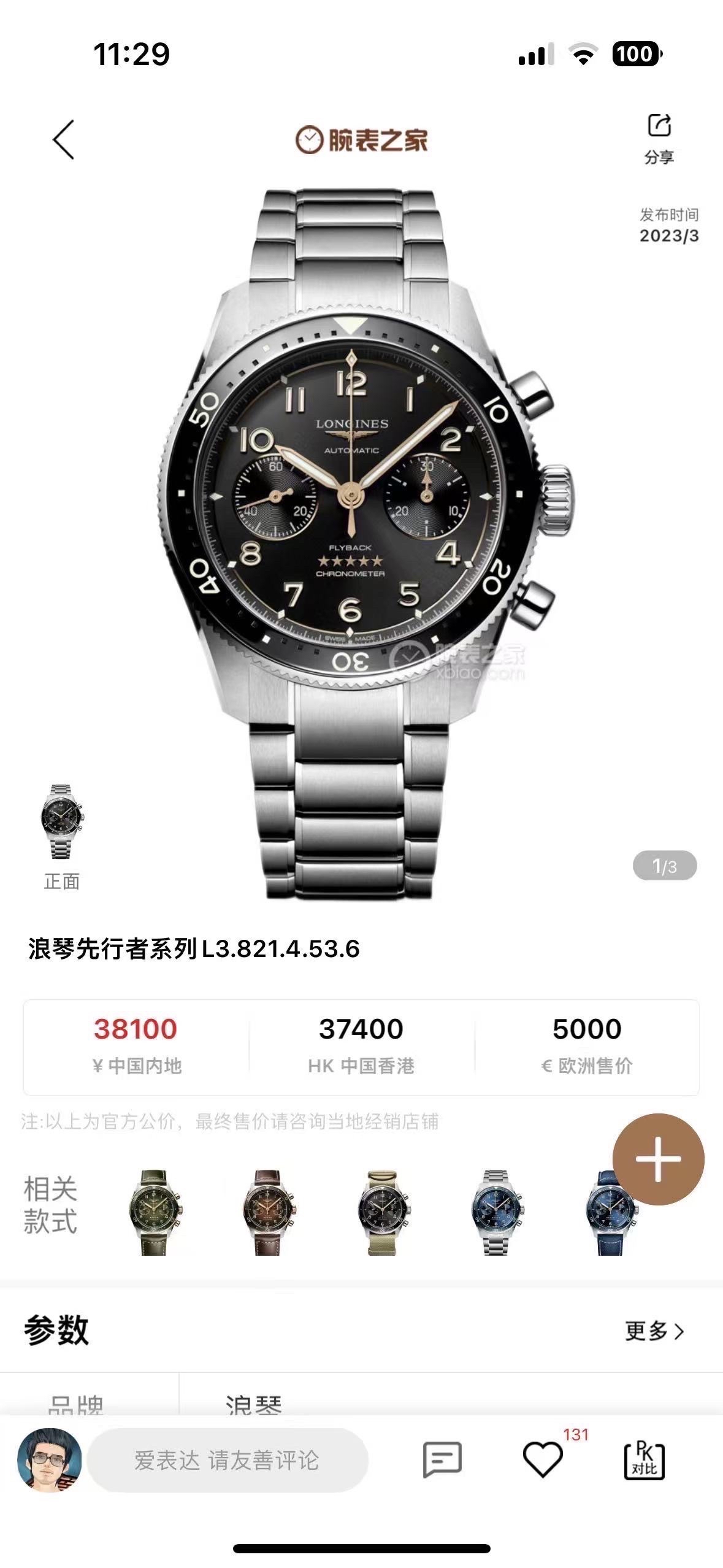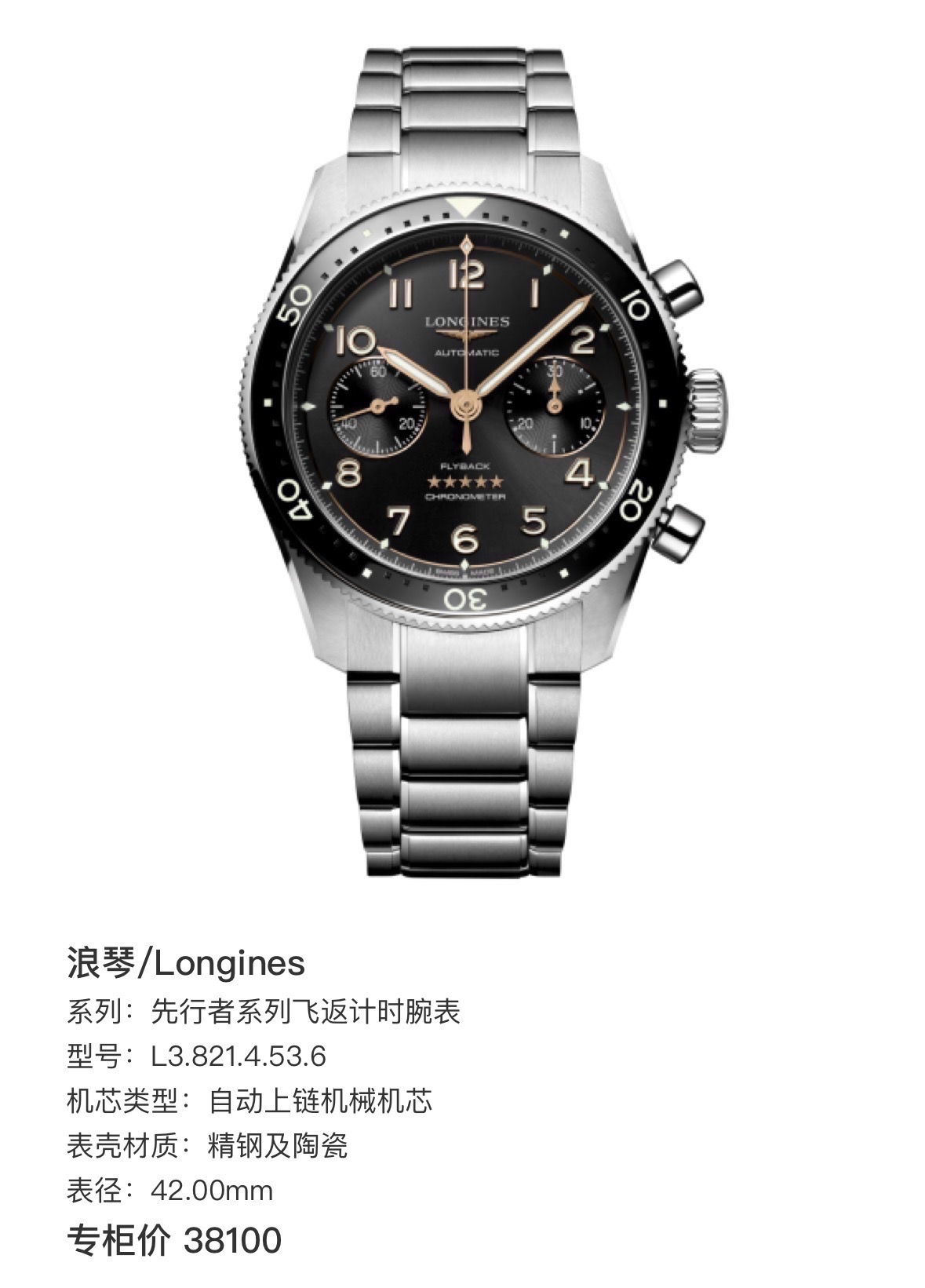 浪琴/Longines 先行者系列飞返计时腕表 L3.821.4.53.6 自动上链机械机芯 精钢及陶瓷 42.00mm 专柜价38100。