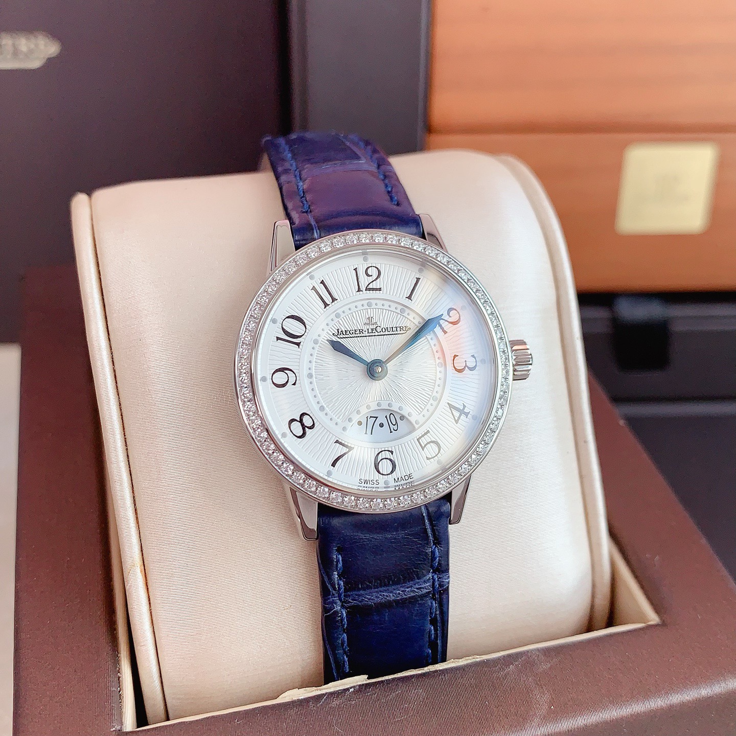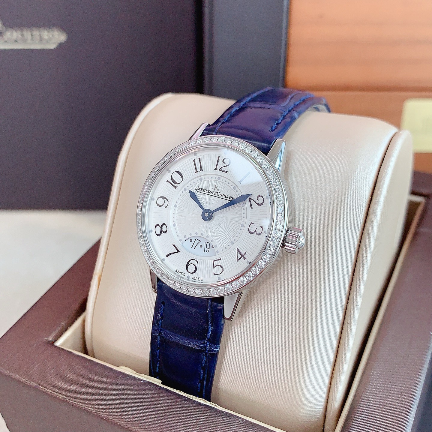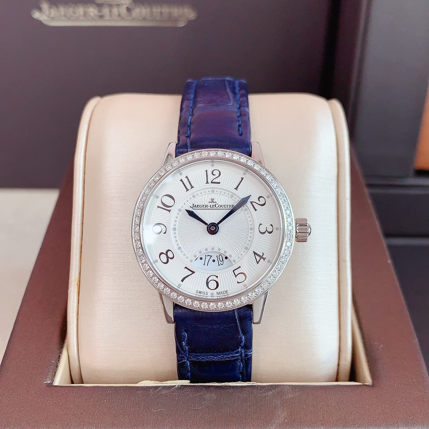 全套积家约会3408531,石英机芯,表径:29mm,表壳厚度:7.57mm精钢表壳,镶嵌60颗钻石,总重0.42克拉,蓝宝石水晶玻璃镜面,扭索纹饰,黑色移印数字,6点位带有日期显示,闲置品未使用柜柜价73000。