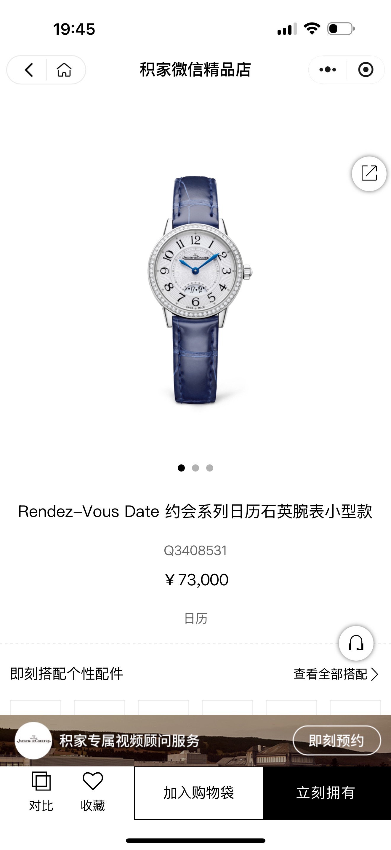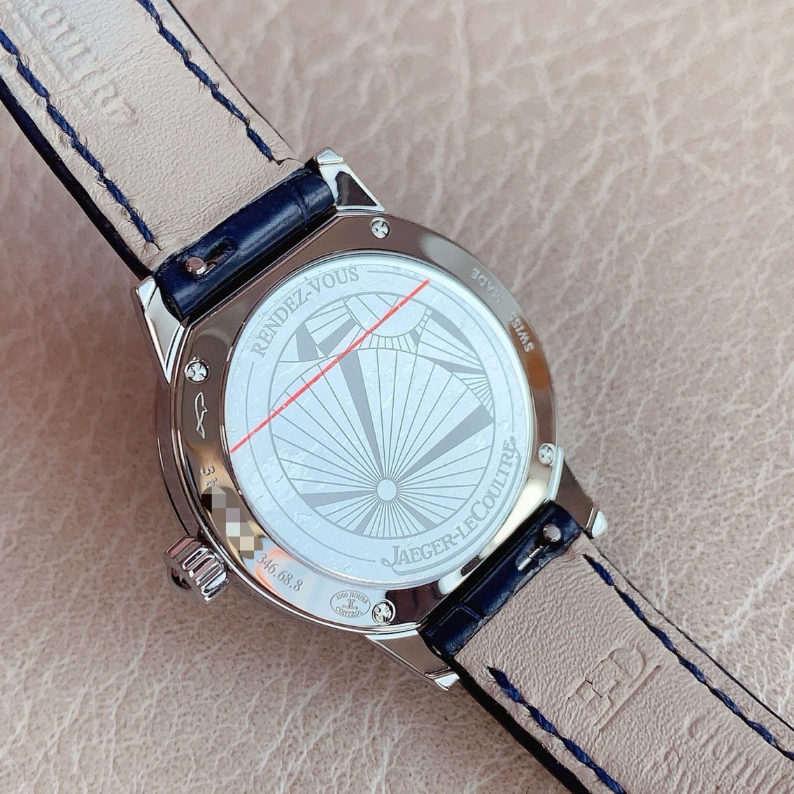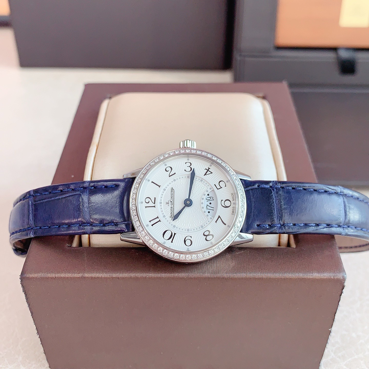 全套积家约会3408531,石英机芯,表径:29mm,表壳厚度:7.57mm精钢表壳,镶嵌60颗钻石,总重0.42克拉,蓝宝石水晶玻璃镜面,扭索纹饰,黑色移印数字,6点位带有日期显示,闲置品未使用柜柜价73000。