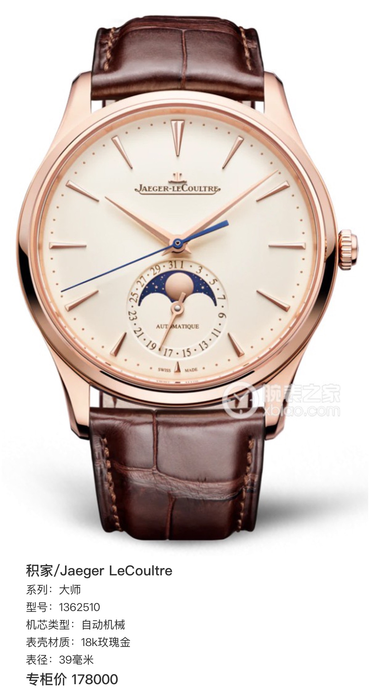 积家/Jaeger LeCoultre 大师Q1362510/自动机械Cal.925/动储70/表径39毫米/专柜价178000