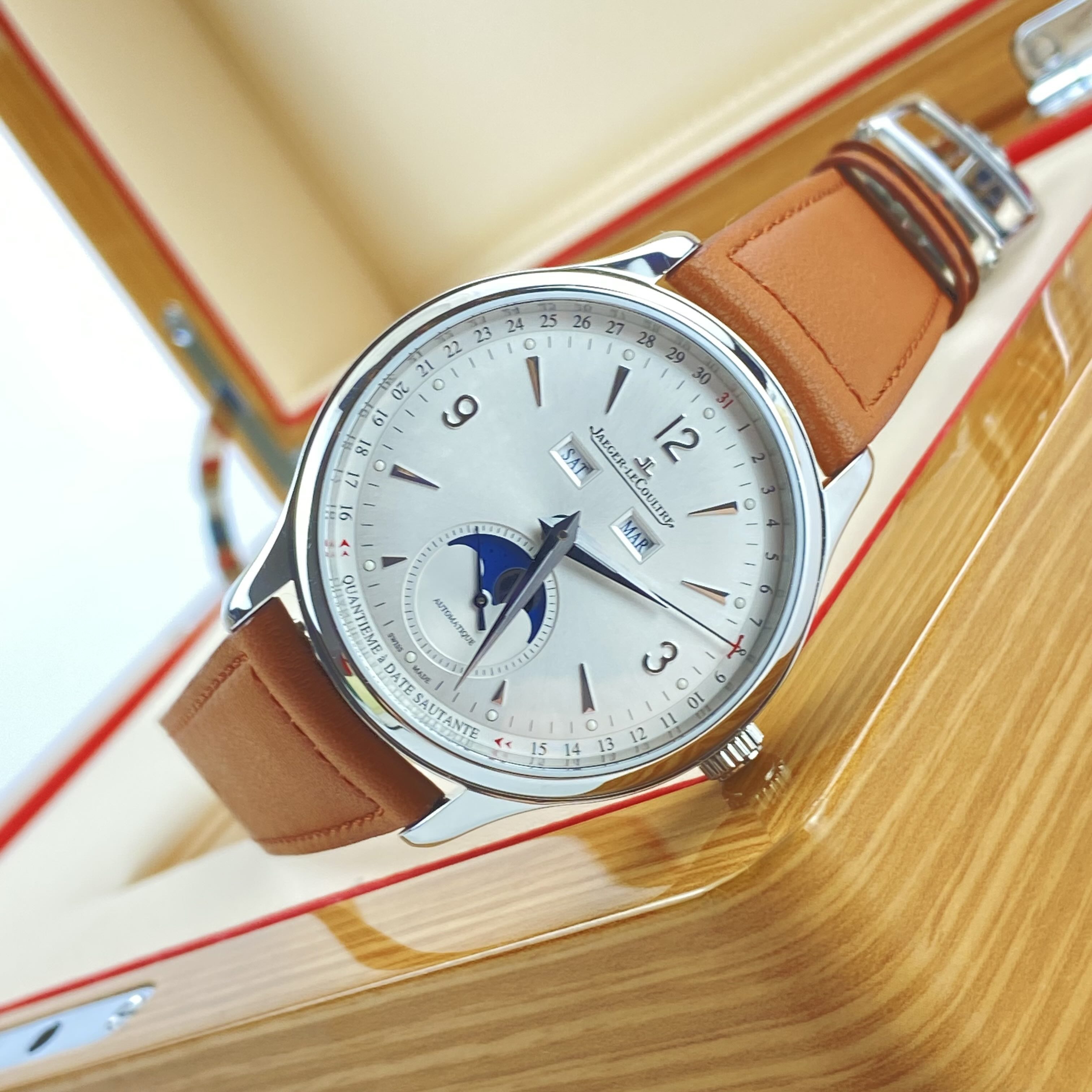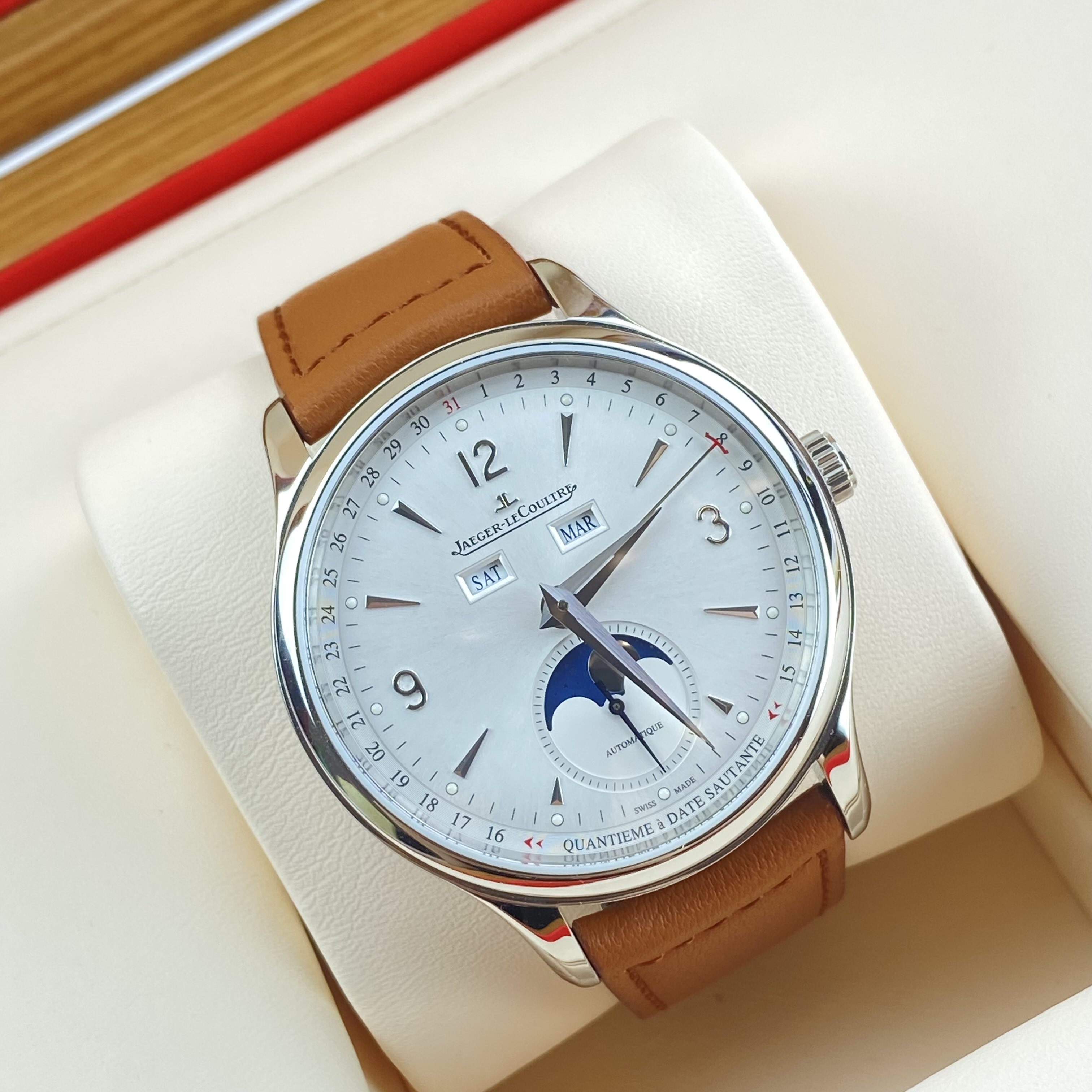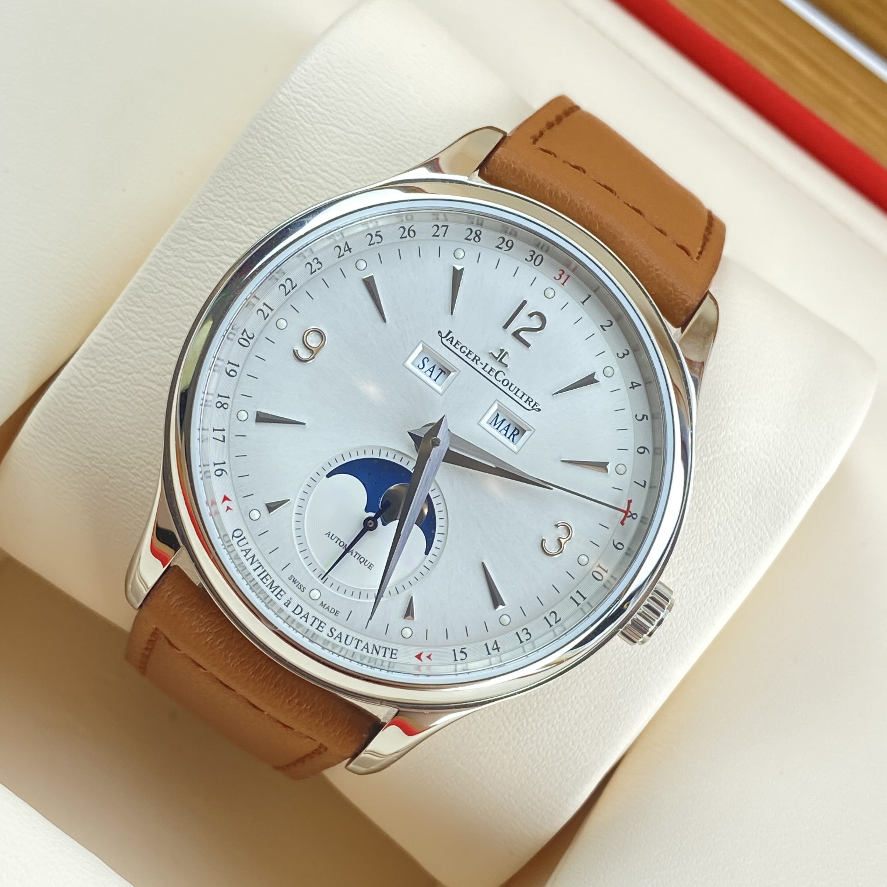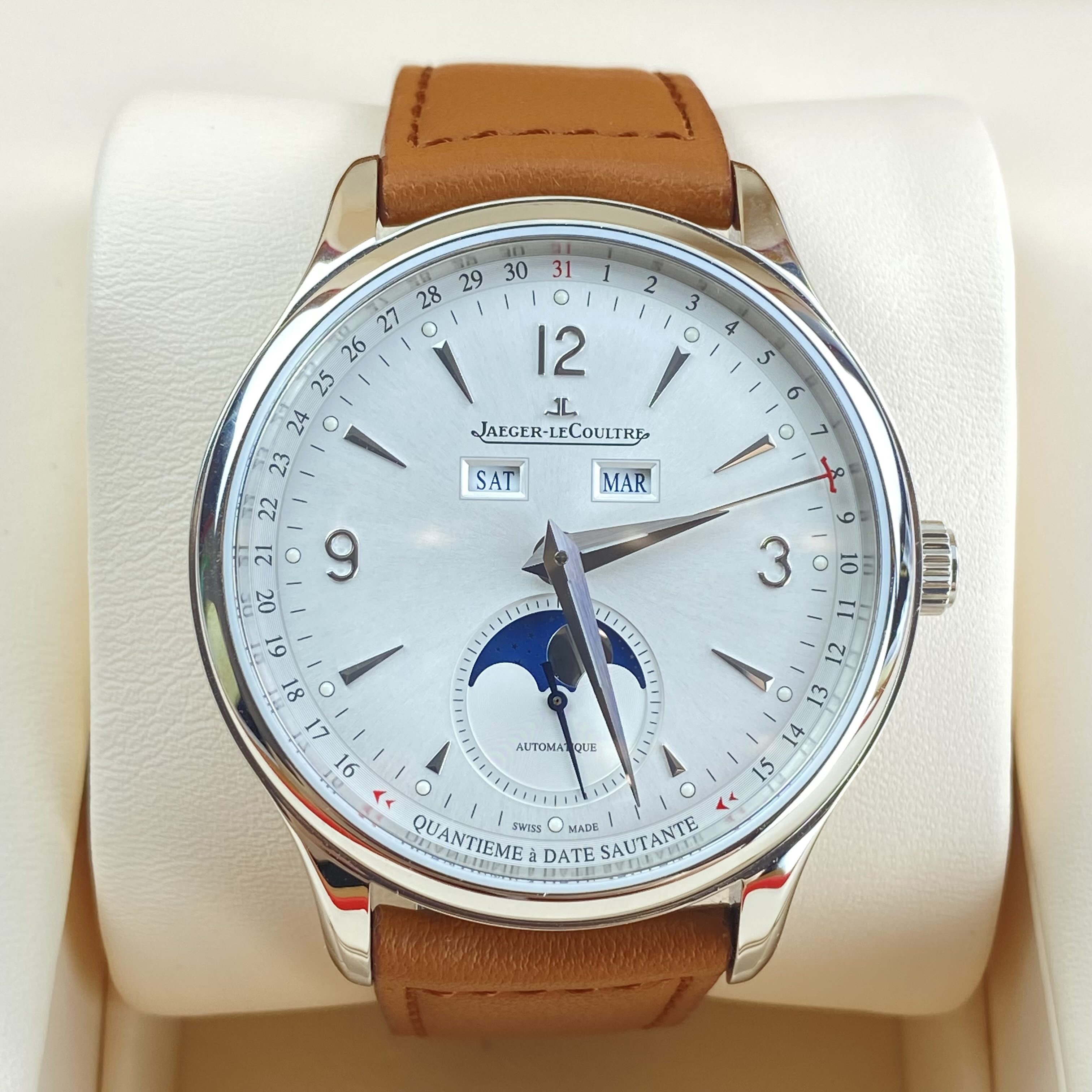 积家大师系列男士自动机械腕表 4148420型号 40毫米表径 银色表盘 数字刻度 日期 星期 月份 月相等功能显示 精钢表壳 极品成色 2022年购入 附件齐全 专柜113000