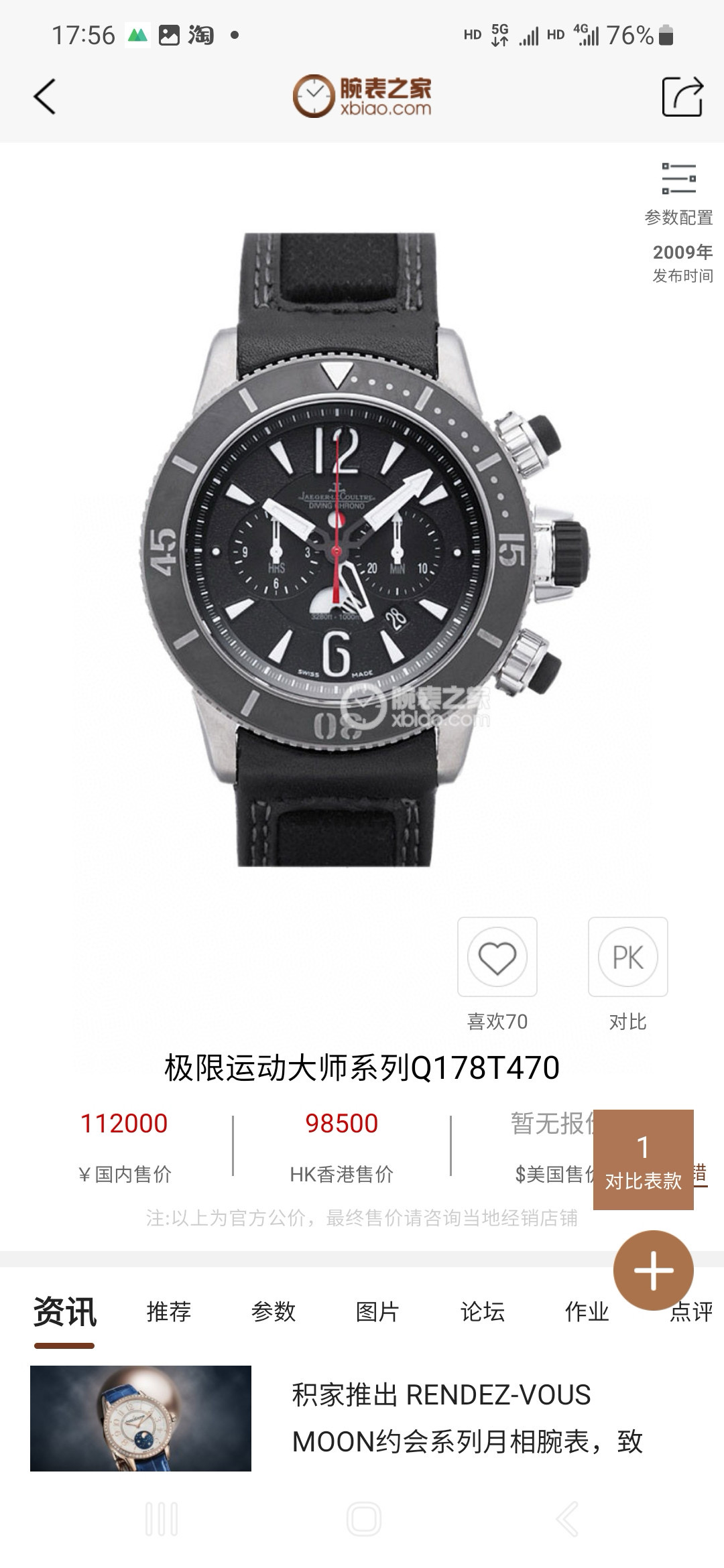 积家Q178T470极限运动大师系列,计时功能,日历显示,双时区,昼/夜指示,螺旋带锁表冠,防水1000米,表壳采用5级钛金属,表径46.3毫米,公价112000,好价