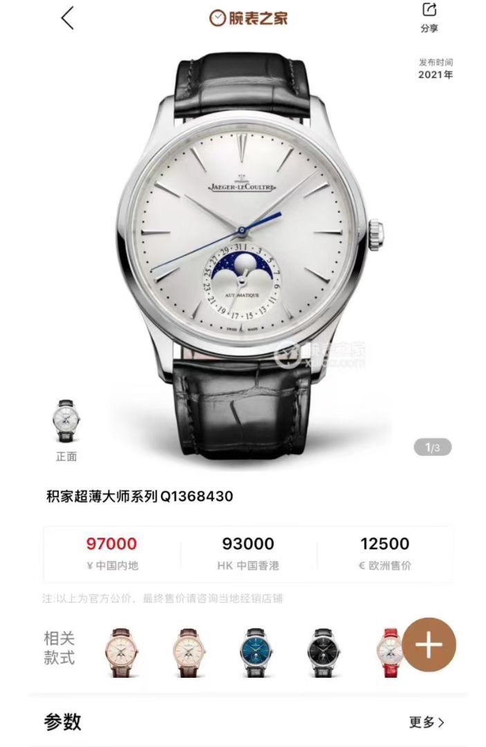 积家大师系列1368430男士机械腕表,最新款月相,白面满天星月相,大热门款原价97000