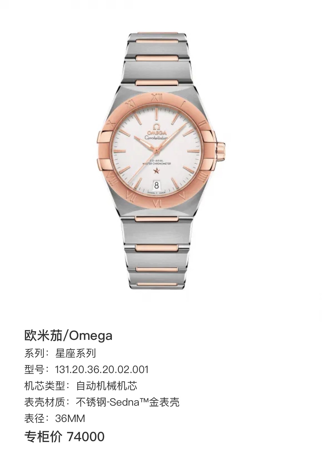 欧米茄/Omega 星座系列 131.20.36.20.02.001 自动机械机芯 不锈钢‑Sedna™金表壳 36MM 专柜价74000~