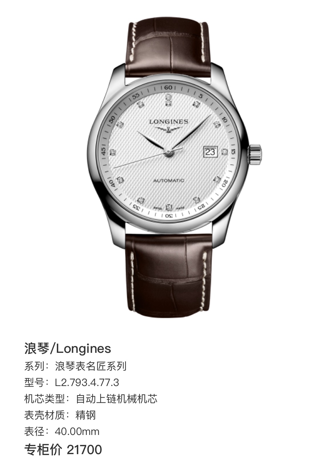 浪琴/Longines 浪琴表名匠系列 L2.793.4.77.3 自动上链机械机芯 精钢 40.00mm表径 单表 专柜价21700
