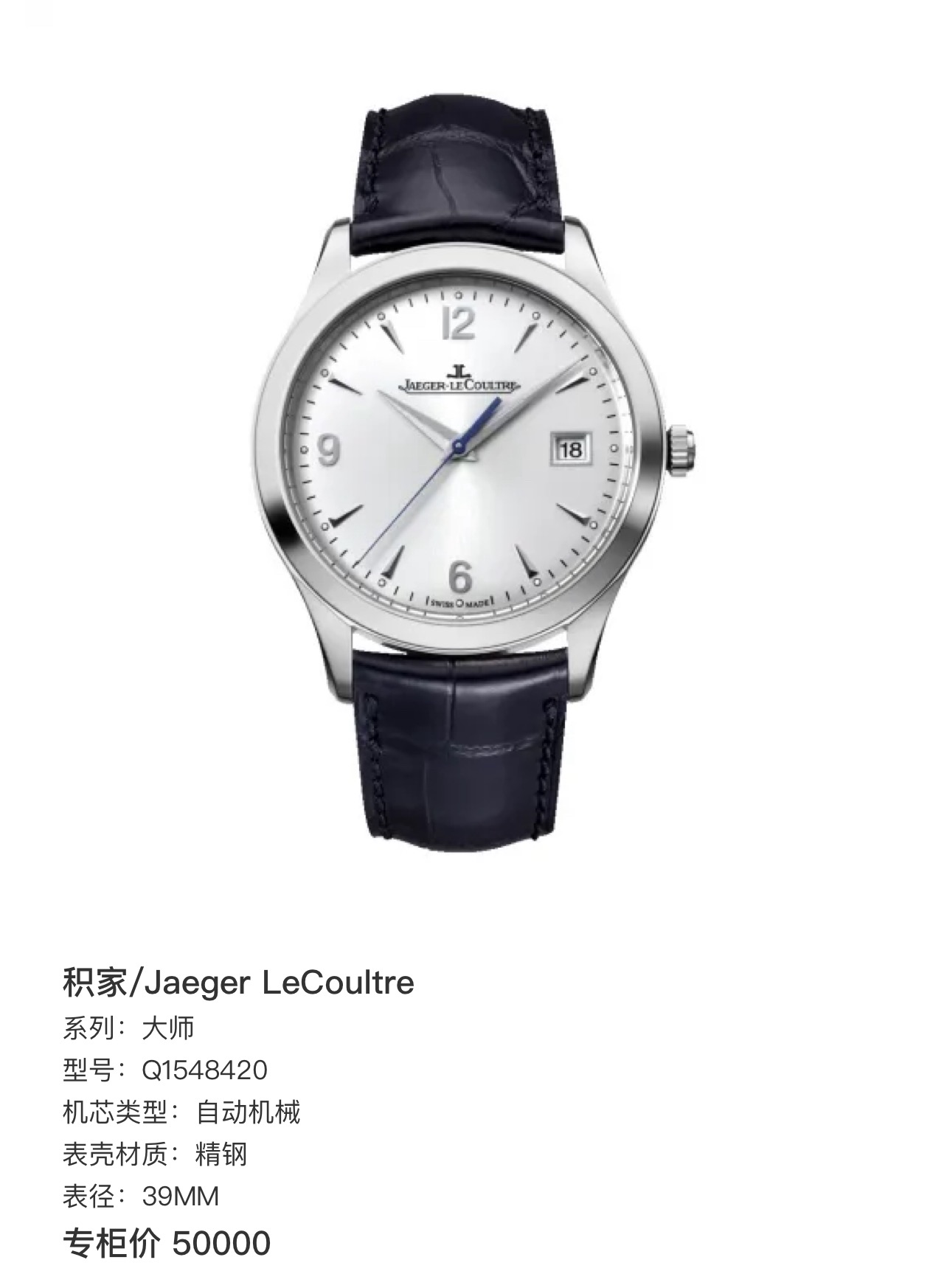 积家大师系列Q1548420男士自动机械表,表径39mm,银面钢款,全套 公价49000