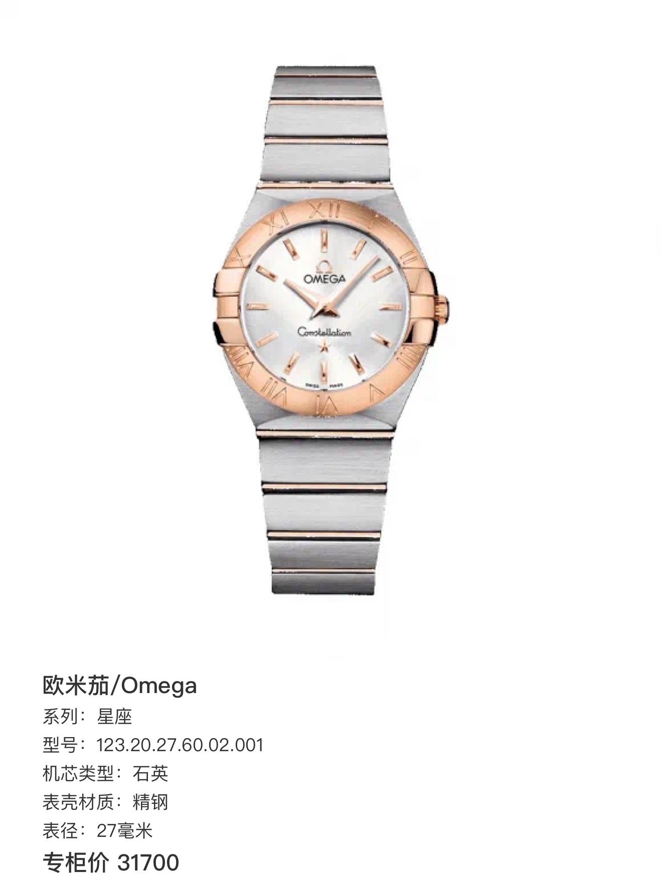 欧米茄/Omega 星座 123.20.27.60.02.001 石英 精钢 27毫米 专柜价31700