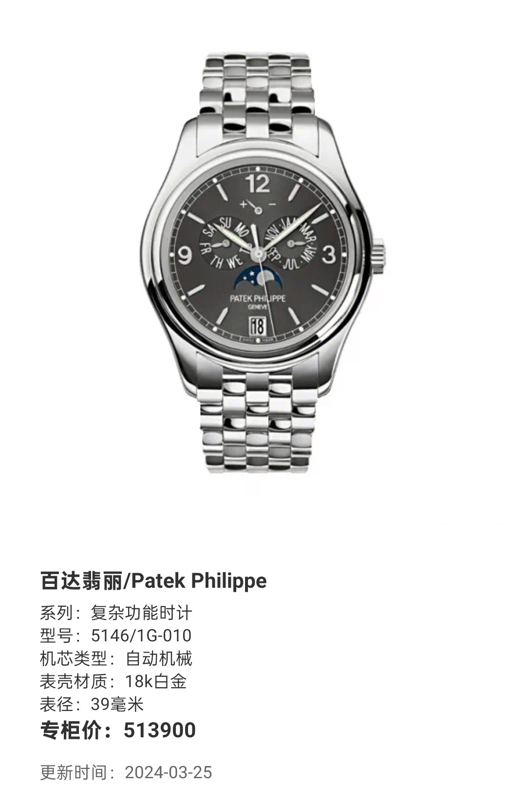 百达翡丽 复杂功能时计 5146/1G-010 18k白金 39毫米 附件 极品单表