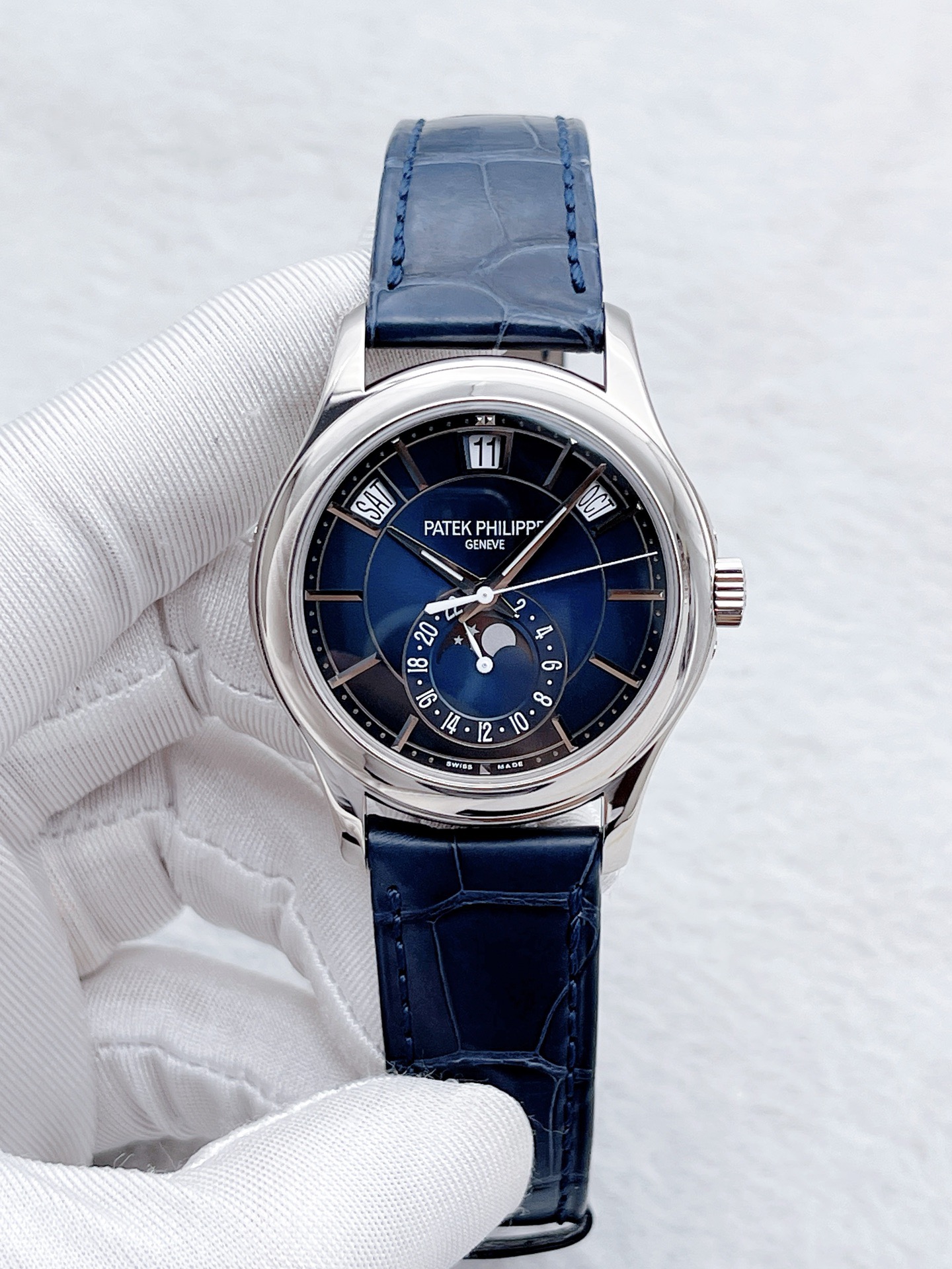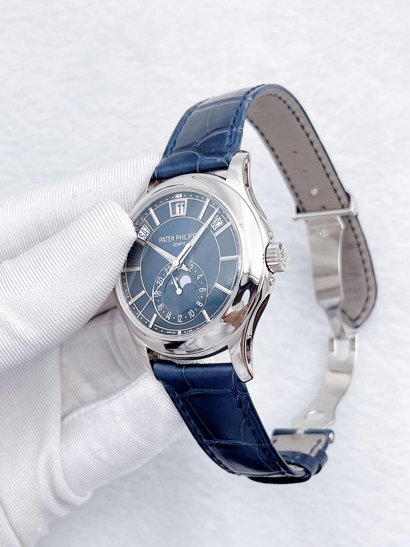 表径40mm 18K白金材质 自动机械 星期、月份、日期、月相显示等功能 侧耳镂空