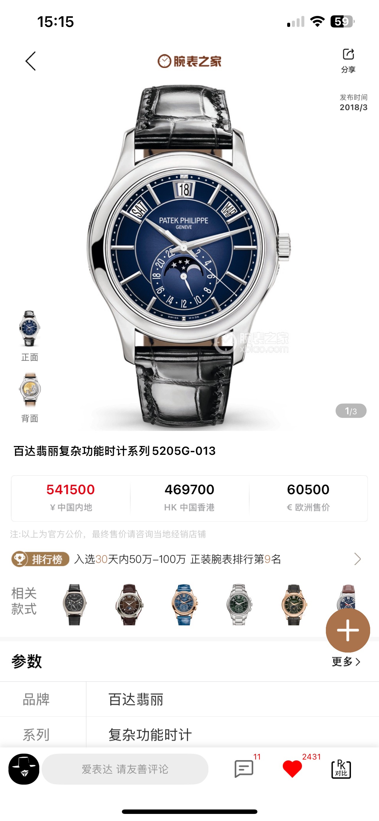 20年极品全套,百达翡丽复杂功能计时5205G-013蓝盘