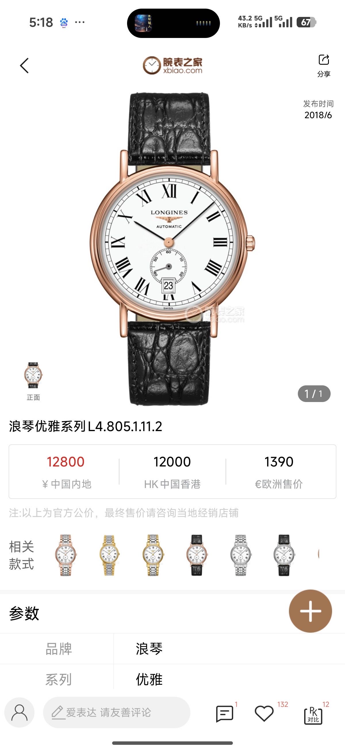 浪琴/Longines 浪琴表时尚系列 L4.805.1.11.2 自动上链机械机芯 精钢与红色PVD镀金 38.50mm 专柜价12800全新全套国行特价