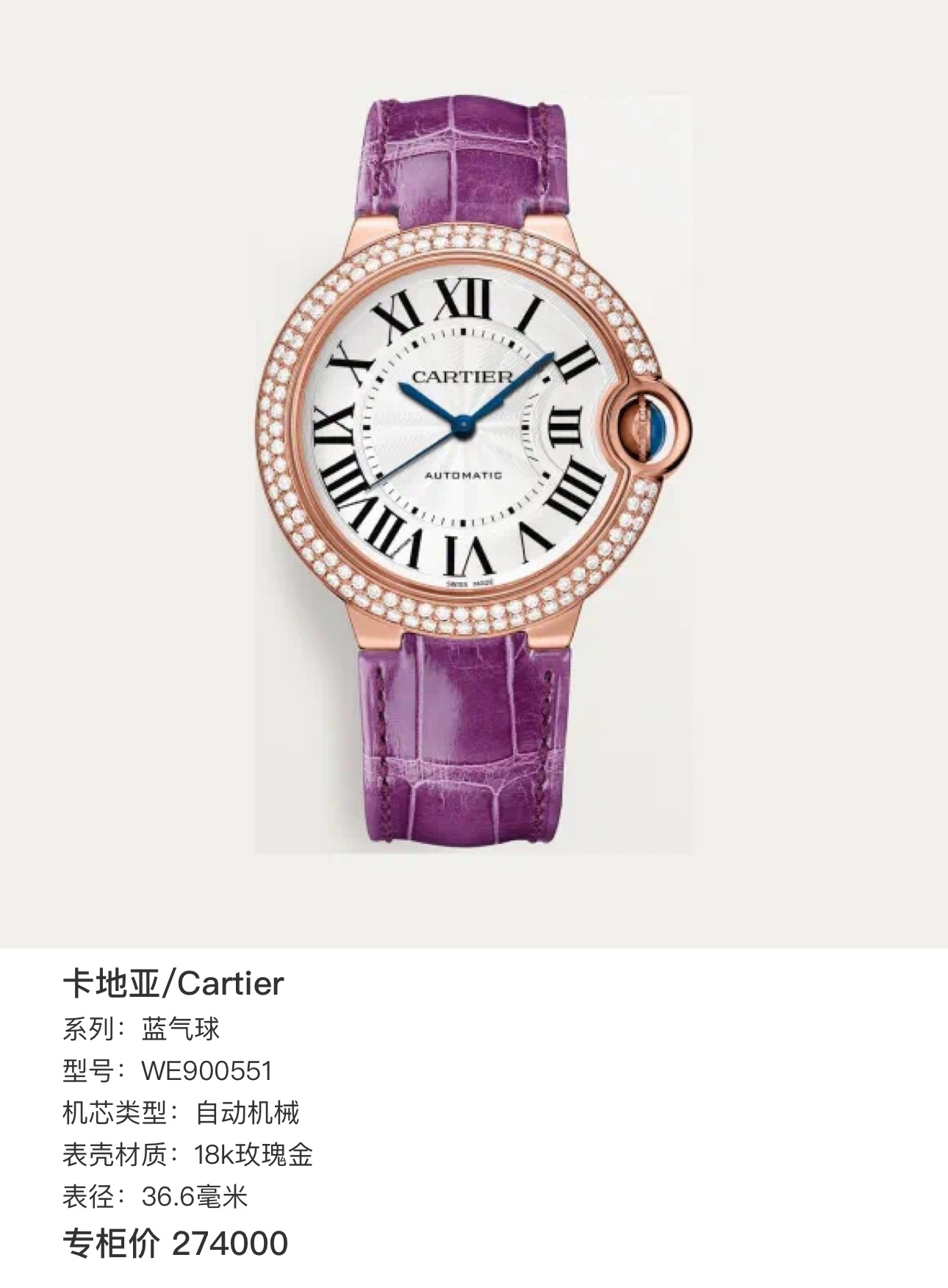 卡地亚/Cartier 蓝气球 WE900551 自动机械 18k玫瑰金 36.6毫米 专柜价274000 金重59.79克 原钻单表好价