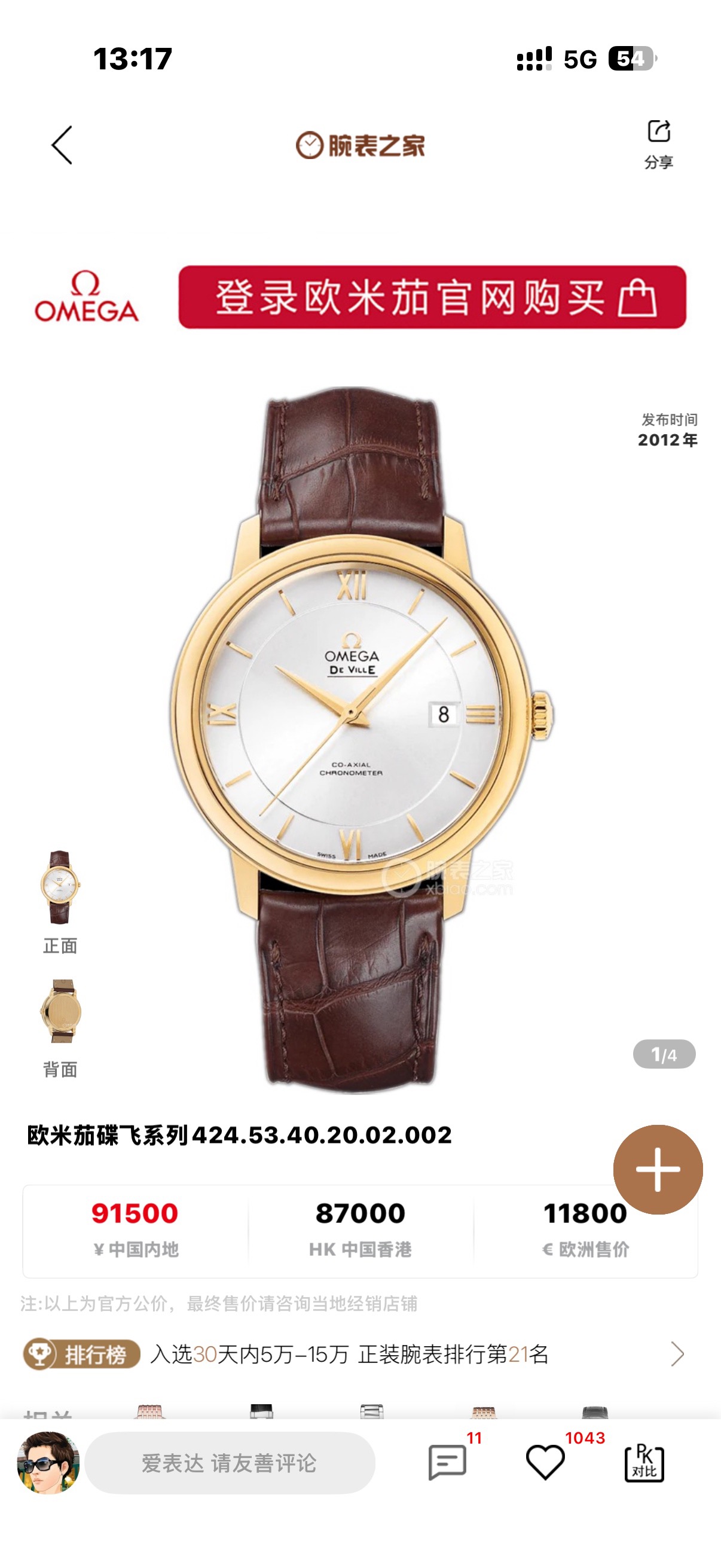 欧米茄/Omega 碟飞系列 424.53.40.20.02.002 专柜价91500,尺寸39.5直径,国行当天卡,全新闲置未使用!