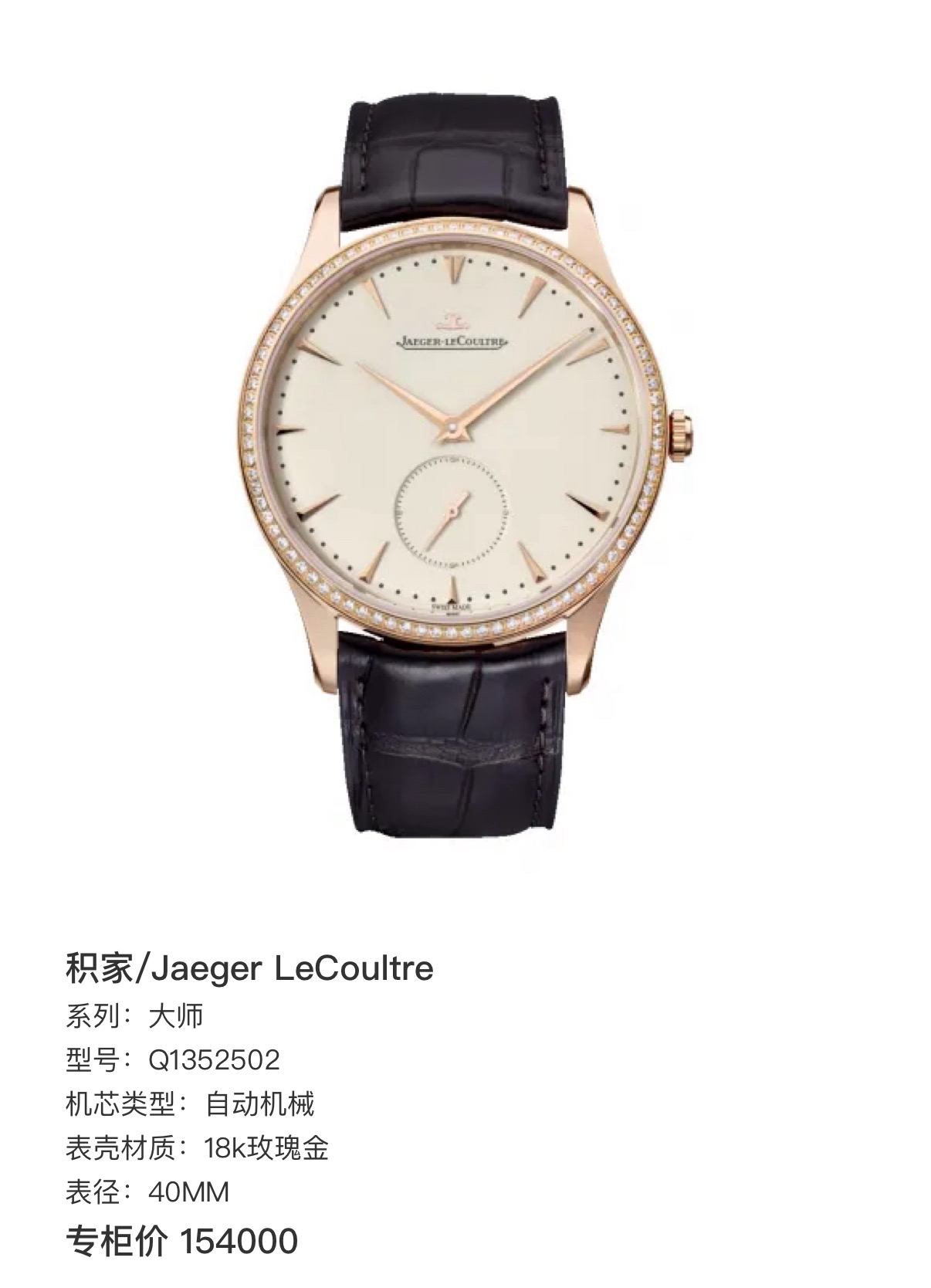 积家/Jaeger LeCoultre 大师 Q1352502 自动机械 18k玫瑰金 40MM 专柜价154000积家/Jaeger LeCoultre 大师 Q1352502 自动机械 18k玫瑰金 40MM 专柜价154000。