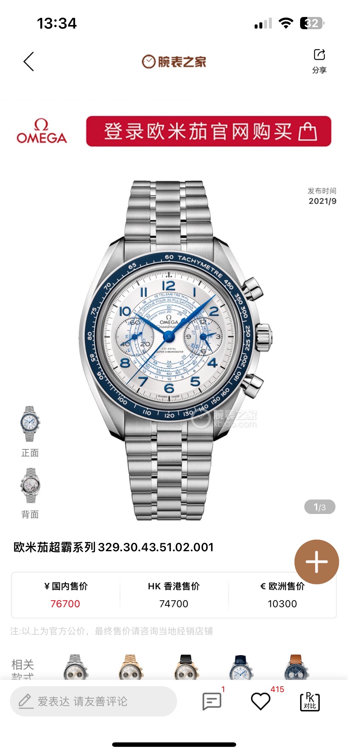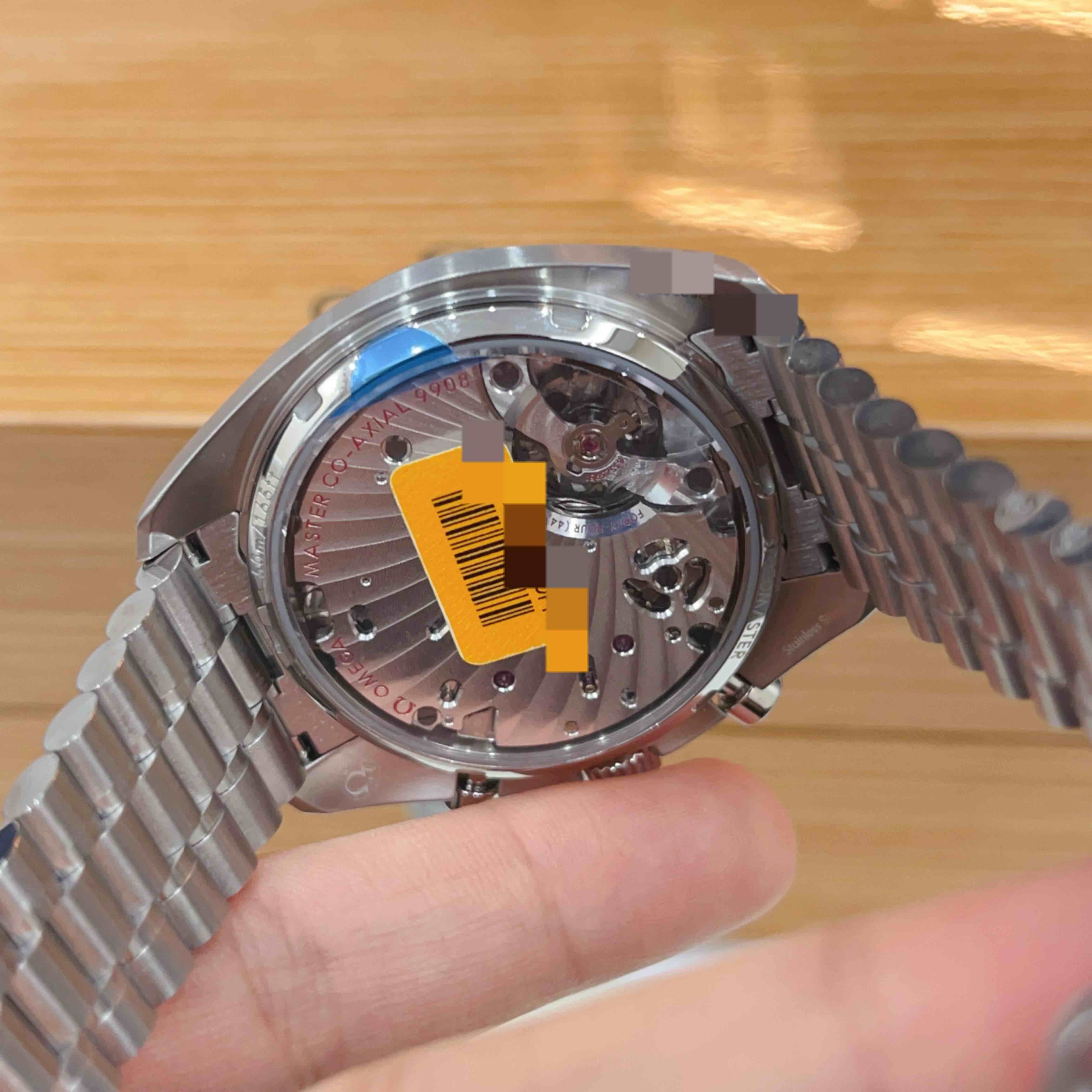 未使用国行当天卡全膜~欧米茄329.30.43.51.02.001白盘复古超霸,43㎜经典医生表,白熊猫双小盘,表径是43mm,双小盘计时码表功能,表盘刻“脉搏计”刻度指示,烤蓝指针,蓝色固定式测速表圈。公价76700