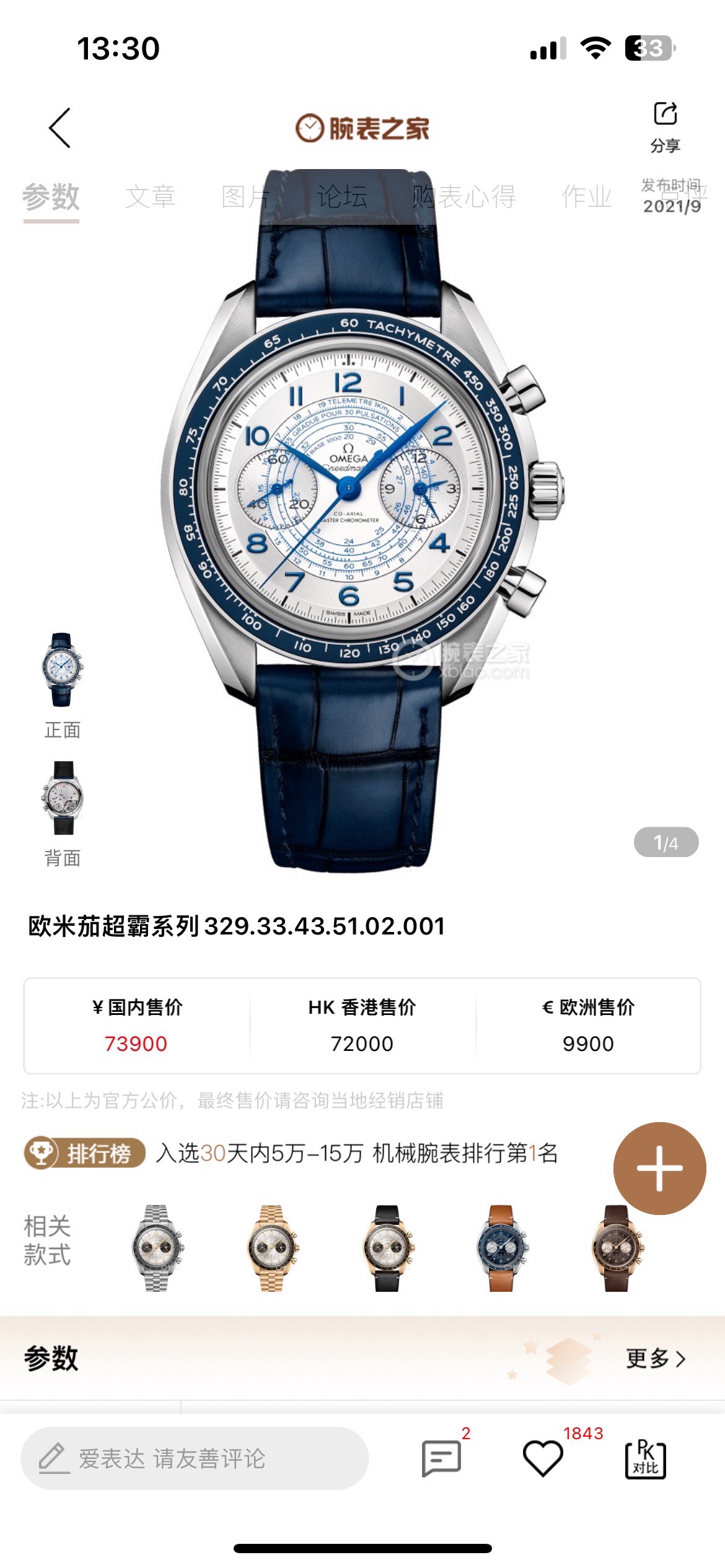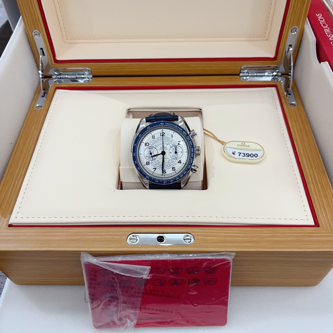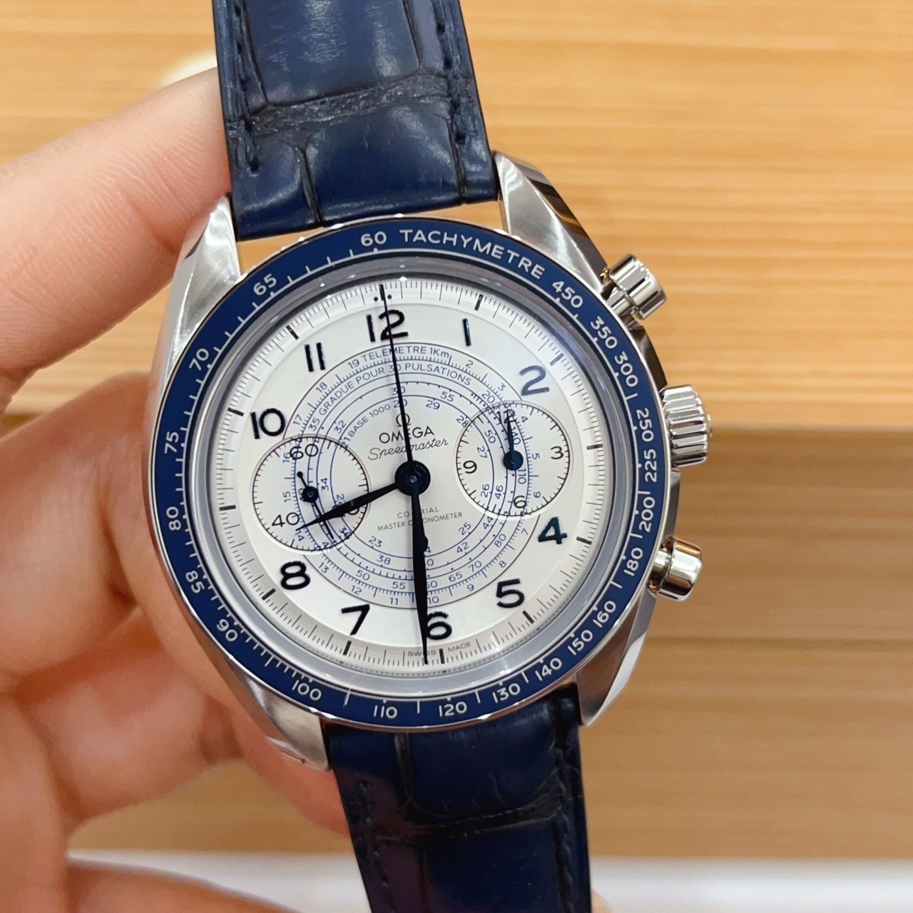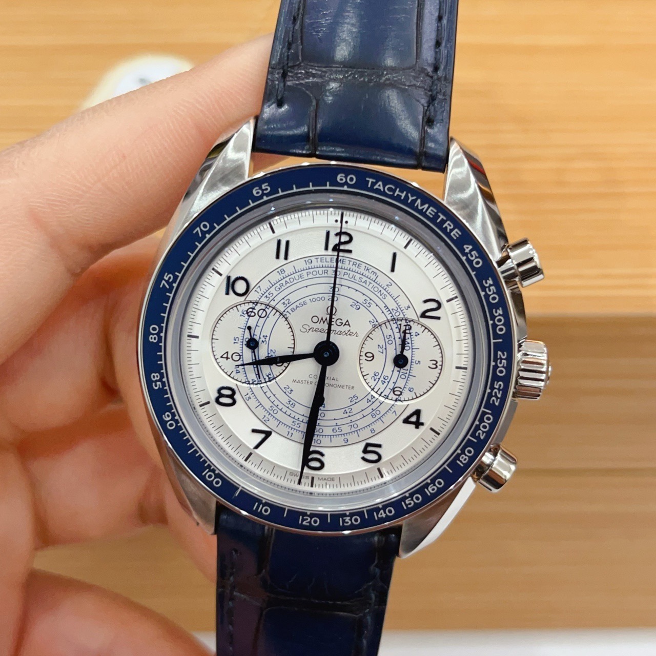 未使用国行近期卡 全膜~欧米茄超霸系列 329.33.43.51.02.001 新款超霸计时“蜗牛”Chronoscope型,43mm白色表盘,双小盘计时码表功能,蓝色刻度指针,表盘内有种刻度,分别为脉搏计刻度、测距刻度,蓝色固定式测速表圈,拉丝精钢打造,搭载背透自产新款9908至臻天文台手动机芯,通勤好表