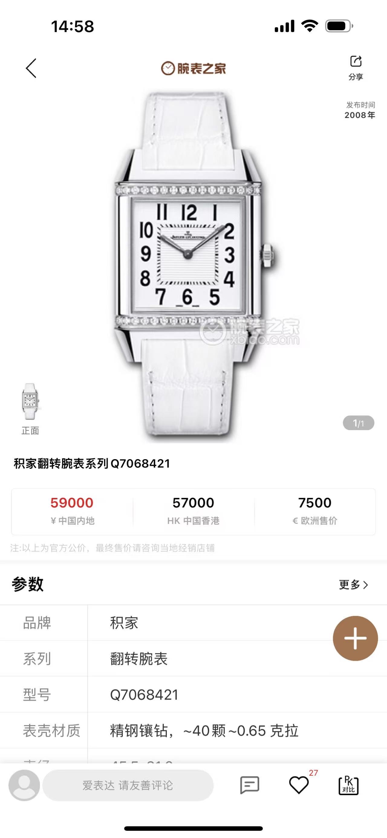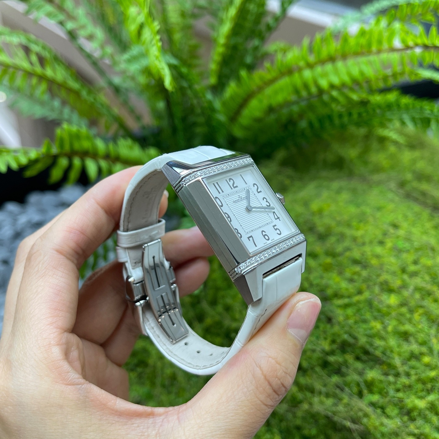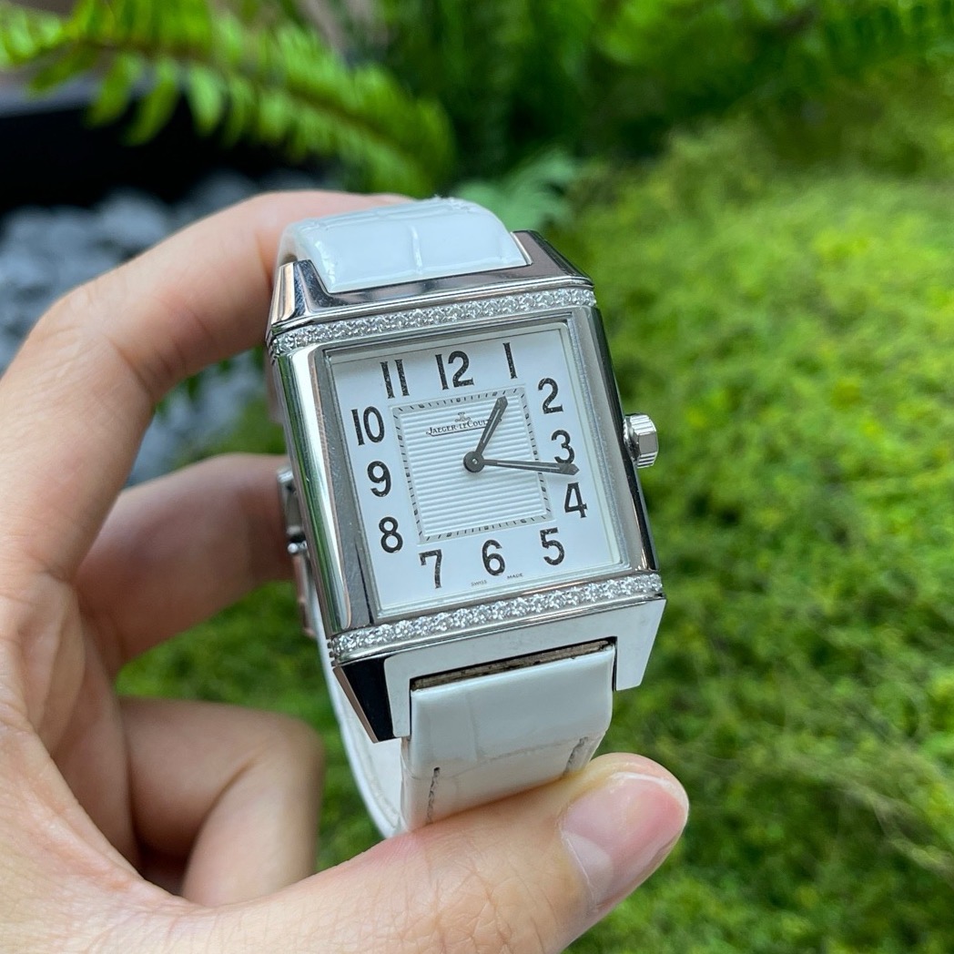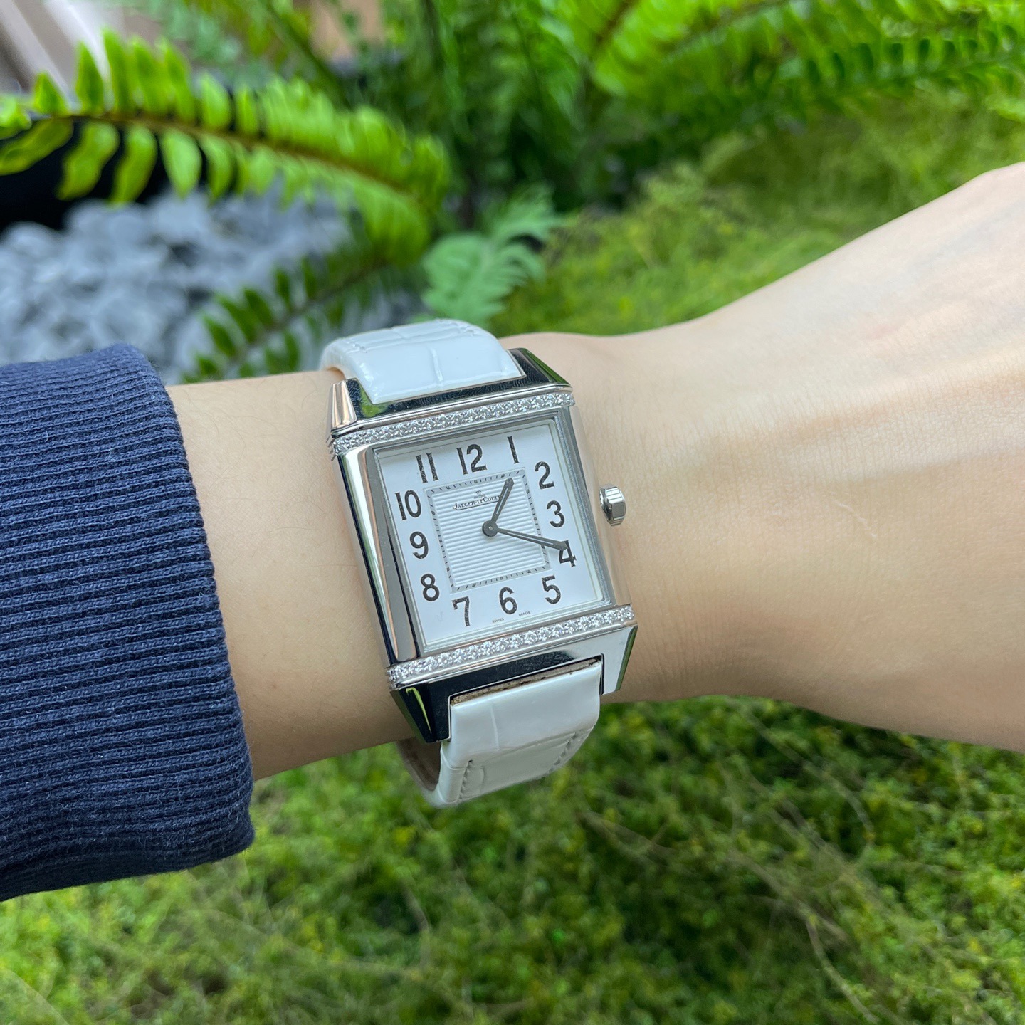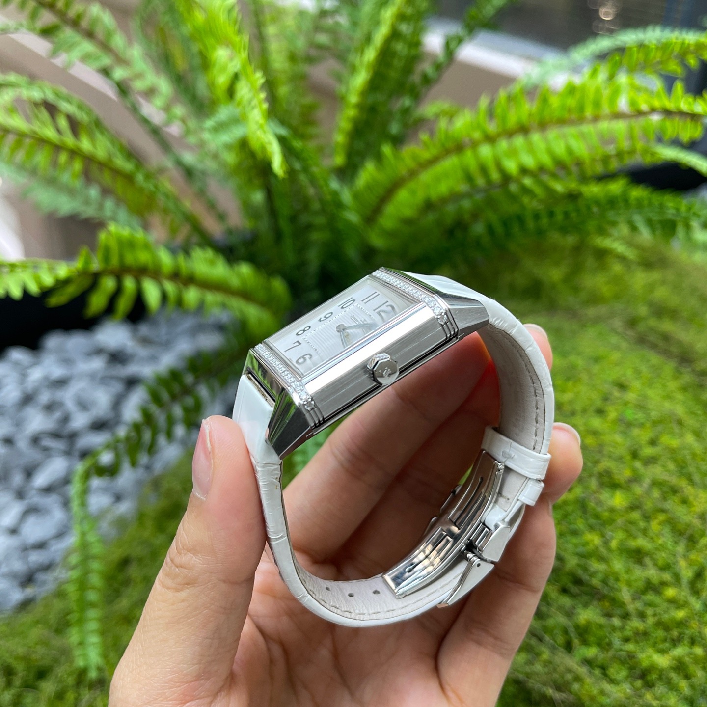 积家 型号:Q7068421 系列:翻转腕表 材质:精钢镶钻~40颗~0.65克拉 表径:45.5×31.2 机芯类型:石英 附件:单表。