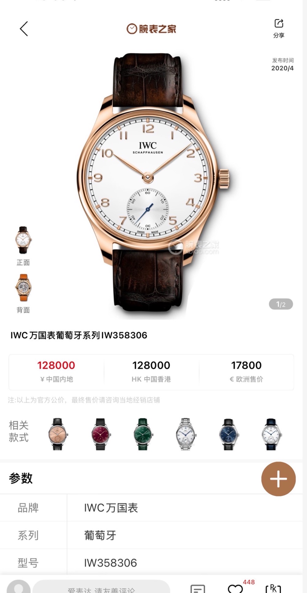 万国/IWC IWC葡萄牙系列 IW358306 自动上链 18K红金 40.4 专柜价128000 万国IW358306葡萄牙系列男士自动机械表,18k玫瑰金,表径40.4mm,