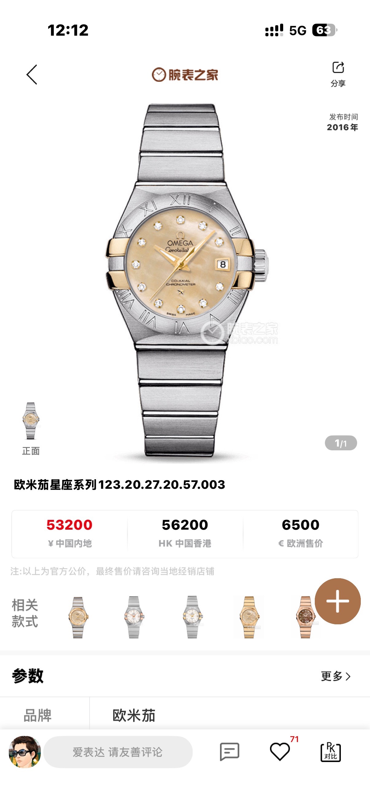 欧米茄/Omega 星座 123.20.27.20.57.003 自动机械 精钢-黃金 尺寸27毫米,专柜价53200,国行当天卡,闲置全新未使用
