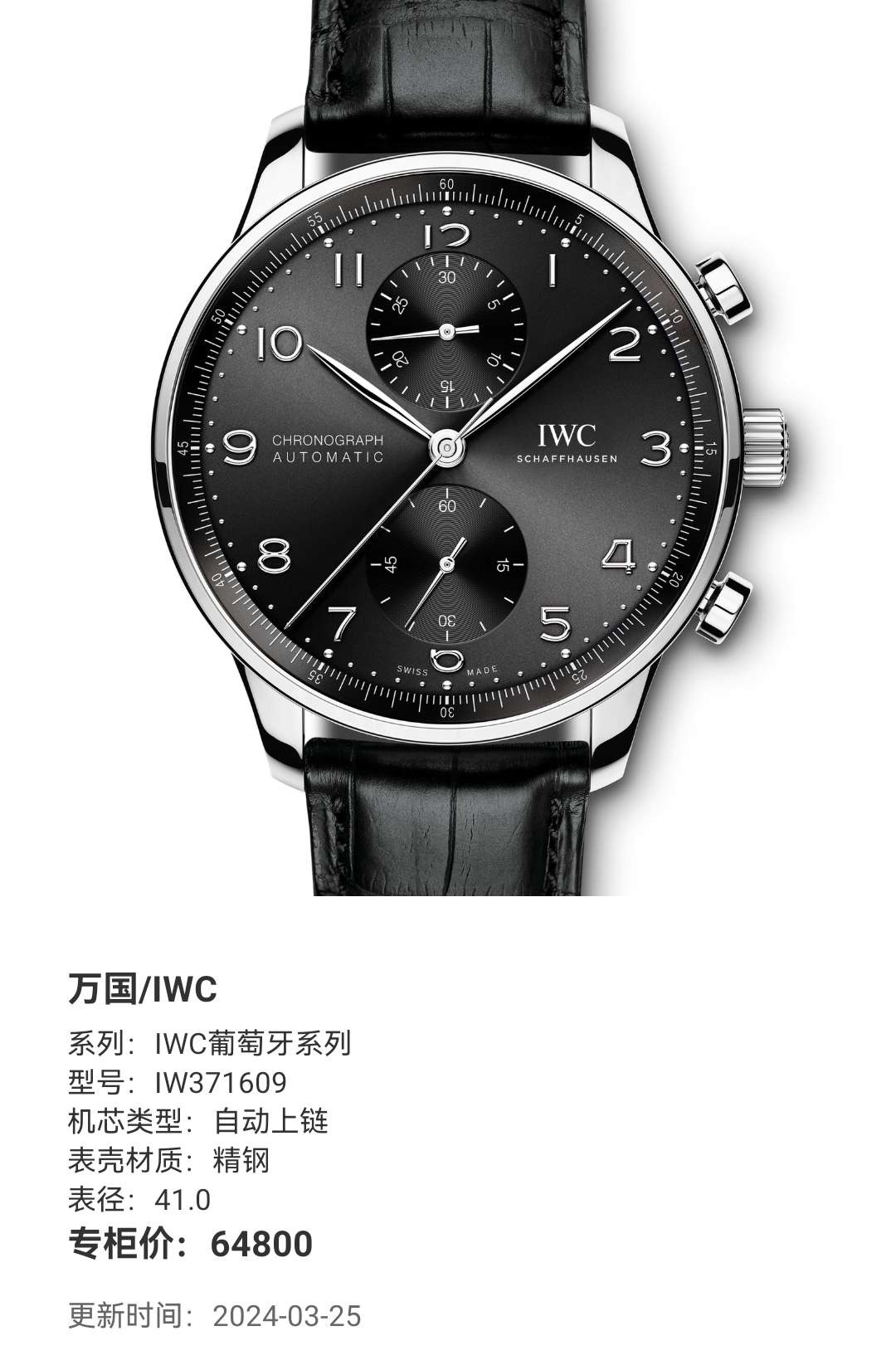 万国/IWC IWC葡萄牙系列 葡计 IW371609 自动上链 精钢 41.0毫米表径专柜价64800