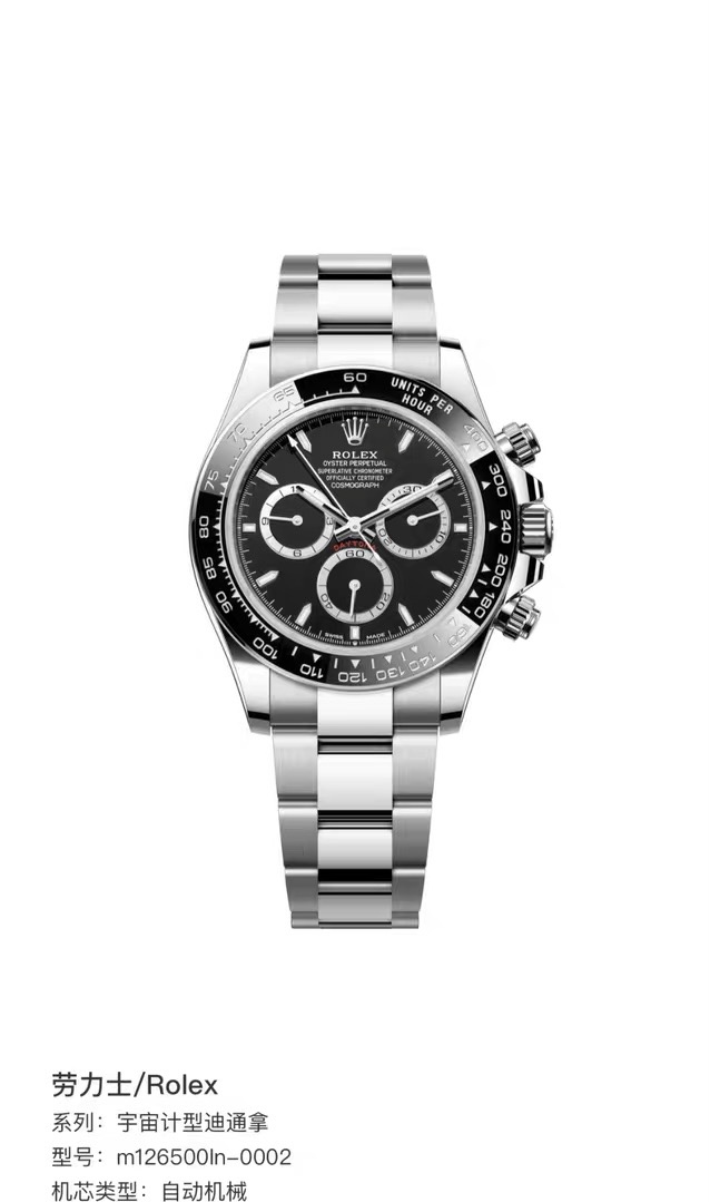 劳力士 宇宙计型迪通拿系列m126500ln-0002自动机械男表,40mm表径,蚝式钢材质,计时功能