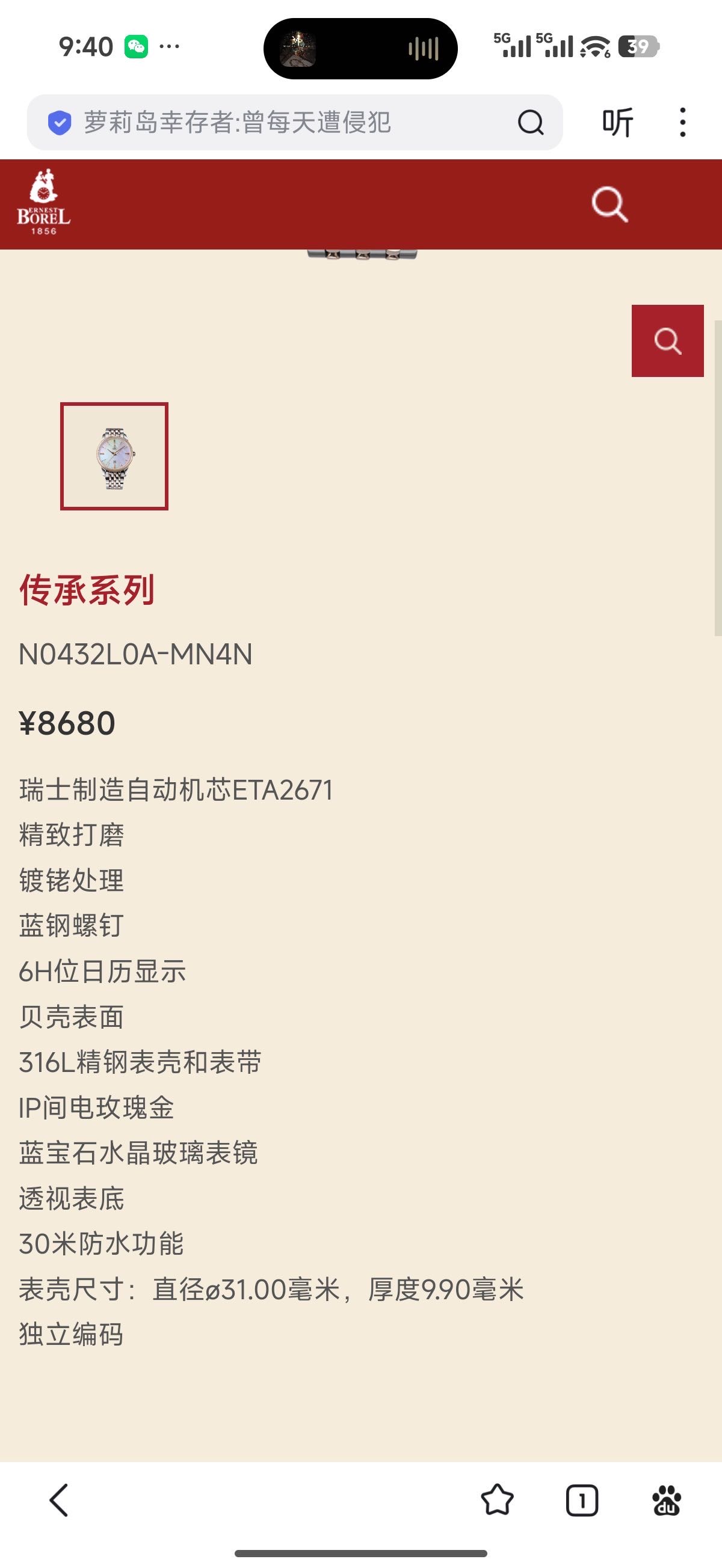 表壳尺寸:直径ø31.00毫米,厚度9.90毫米