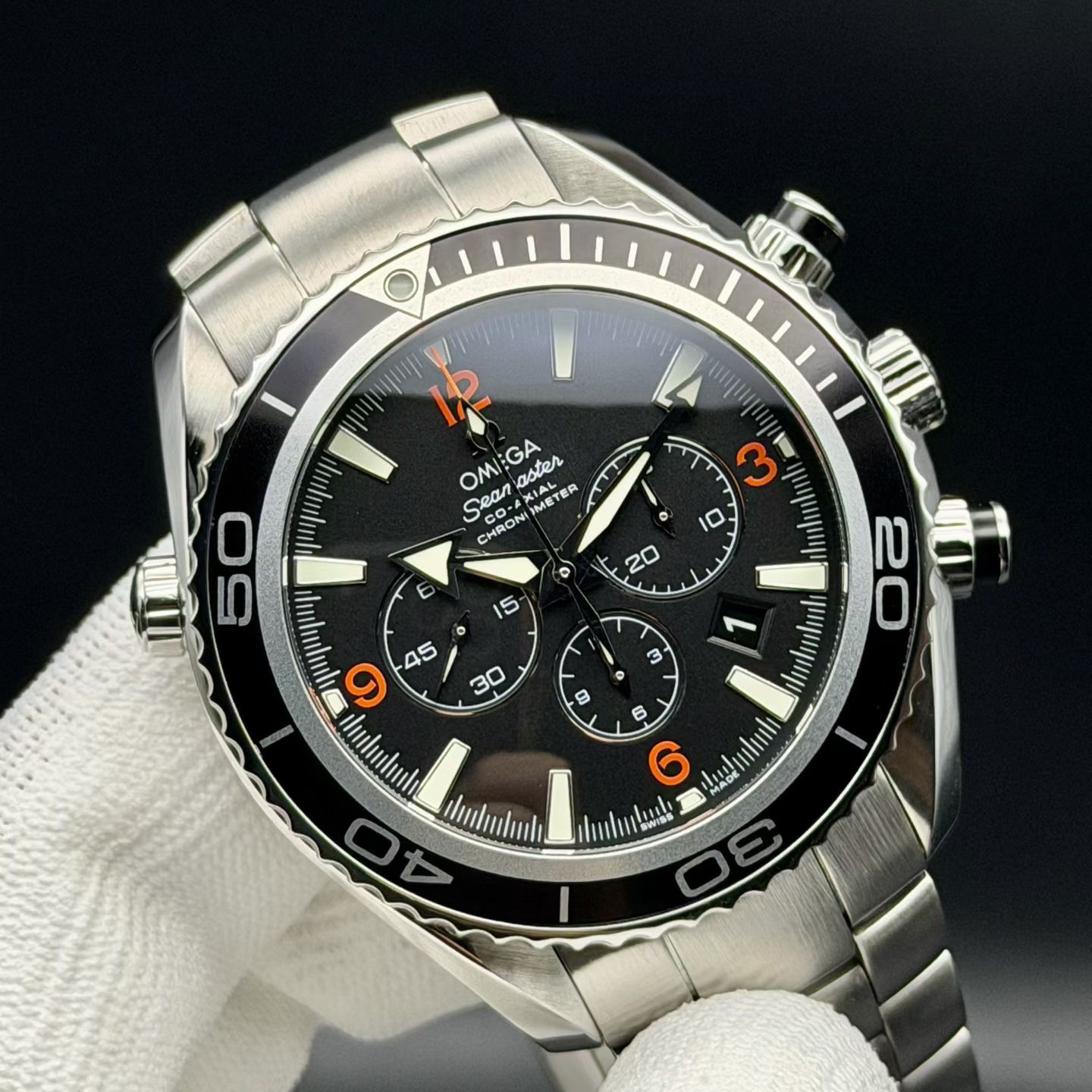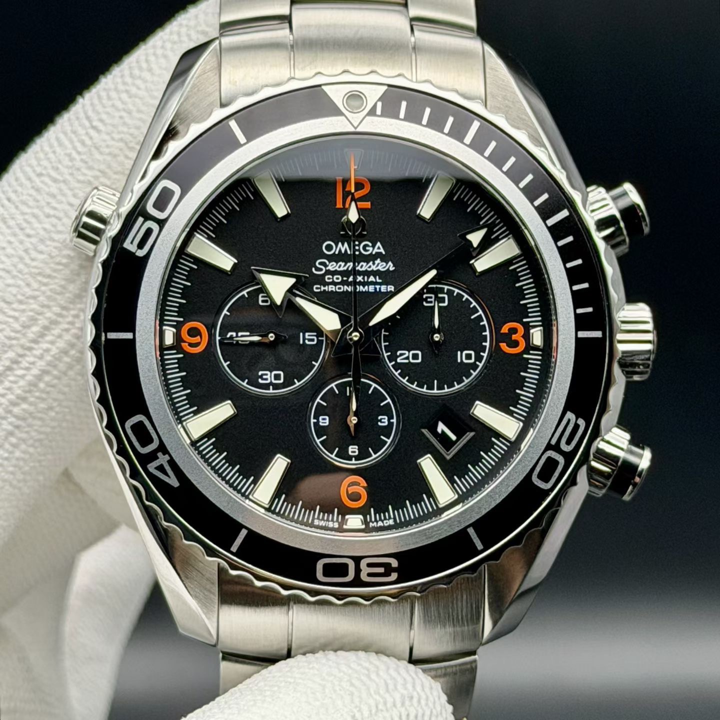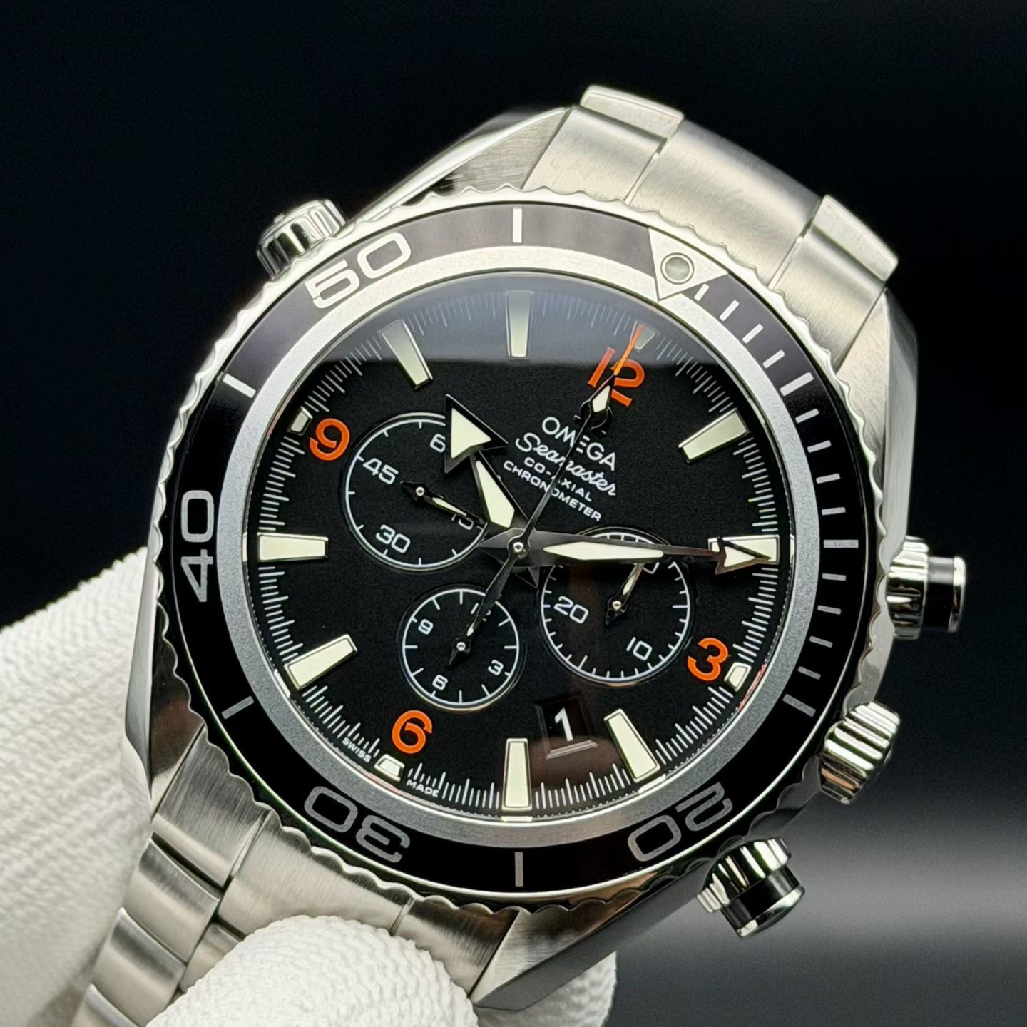 欧米茄海马系列2210.51.00,表径45.5mm,可旋转铝制潜水外圈,三眼计时带日历设计,橙色数字刻度以点睛之笔,搭载自产3313机芯,走时精准稳定,防水深度600m,夜光犀利,公价53200,现货极品成色单表。