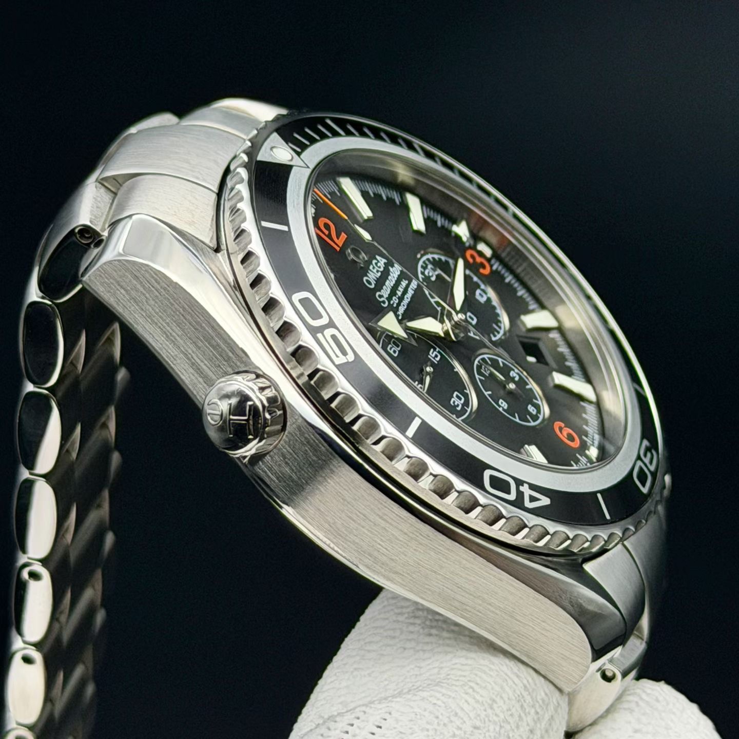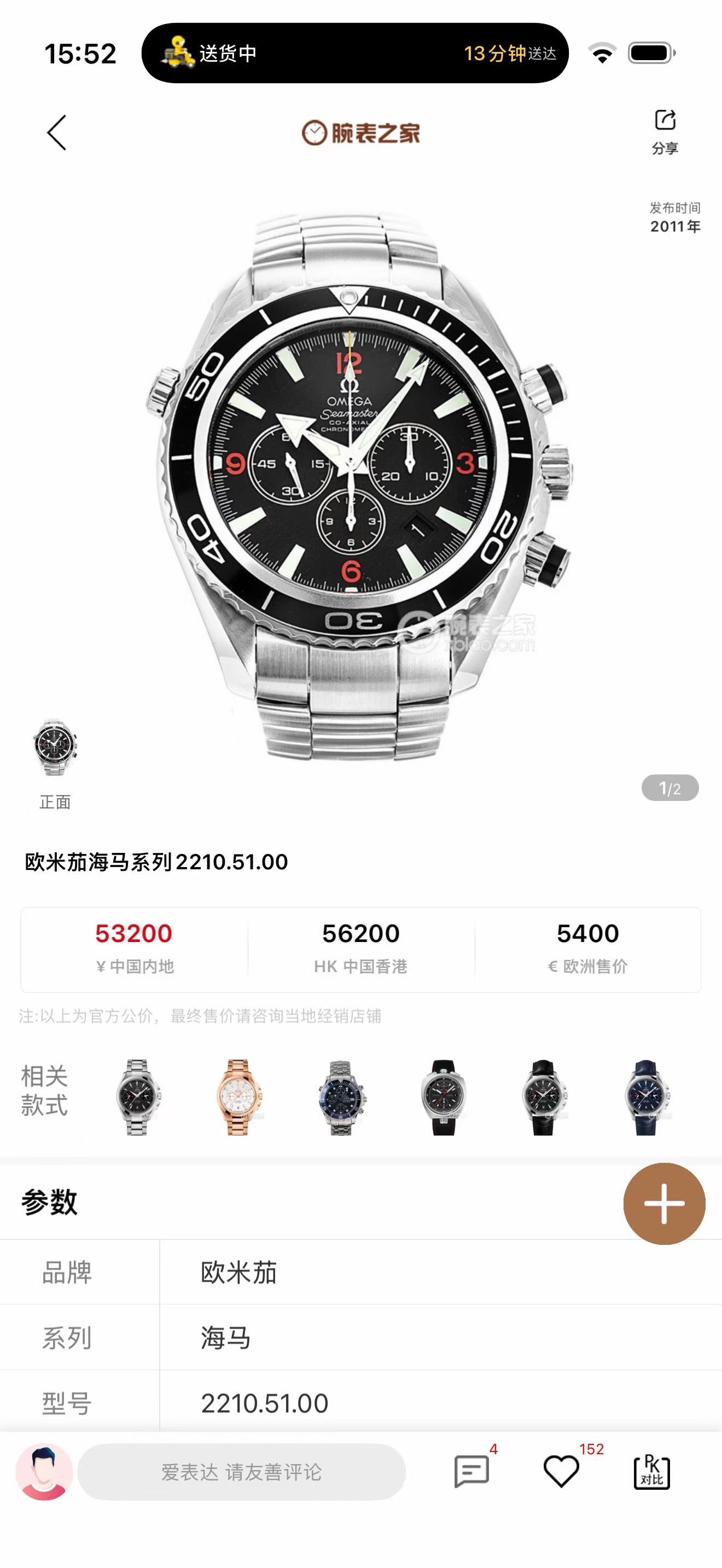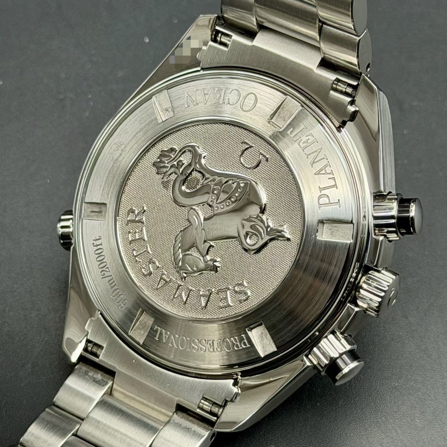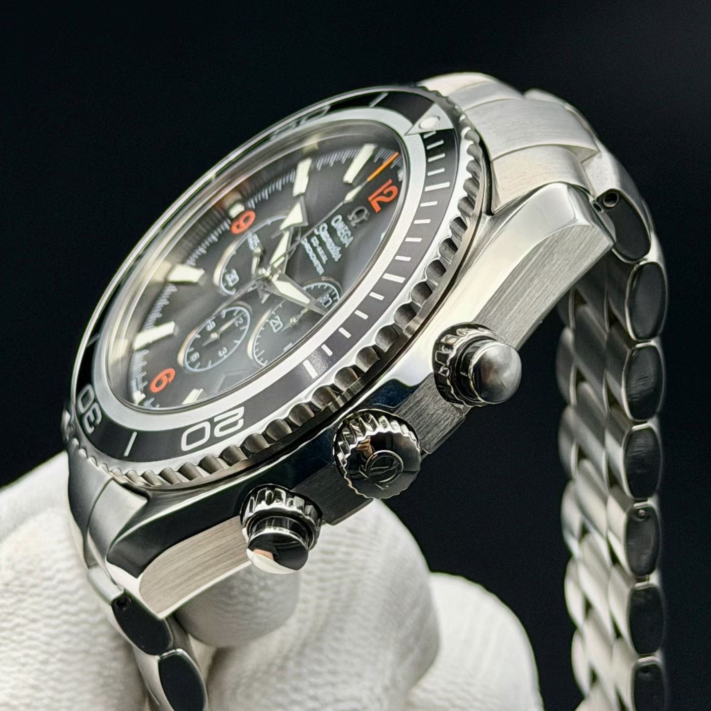 欧米茄海马系列2210.51.00,表径45.5mm,可旋转铝制潜水外圈,三眼计时带日历设计,橙色数字刻度以点睛之笔,搭载自产3313机芯,走时精准稳定,防水深度600m,夜光犀利,公价53200,现货极品成色单表。