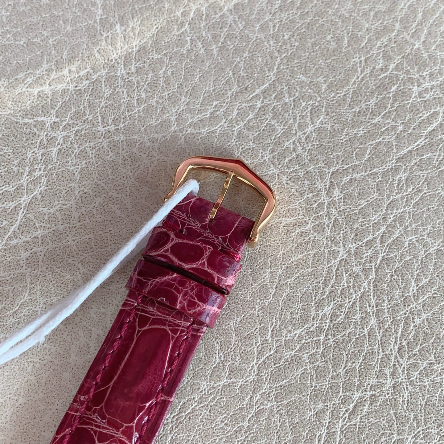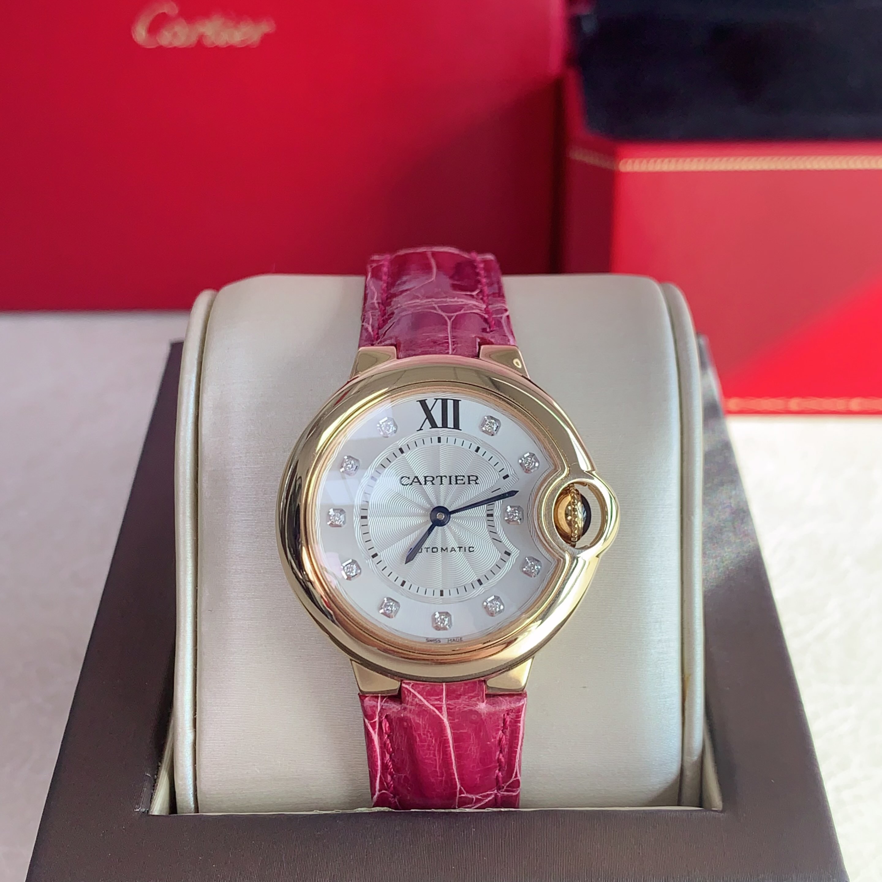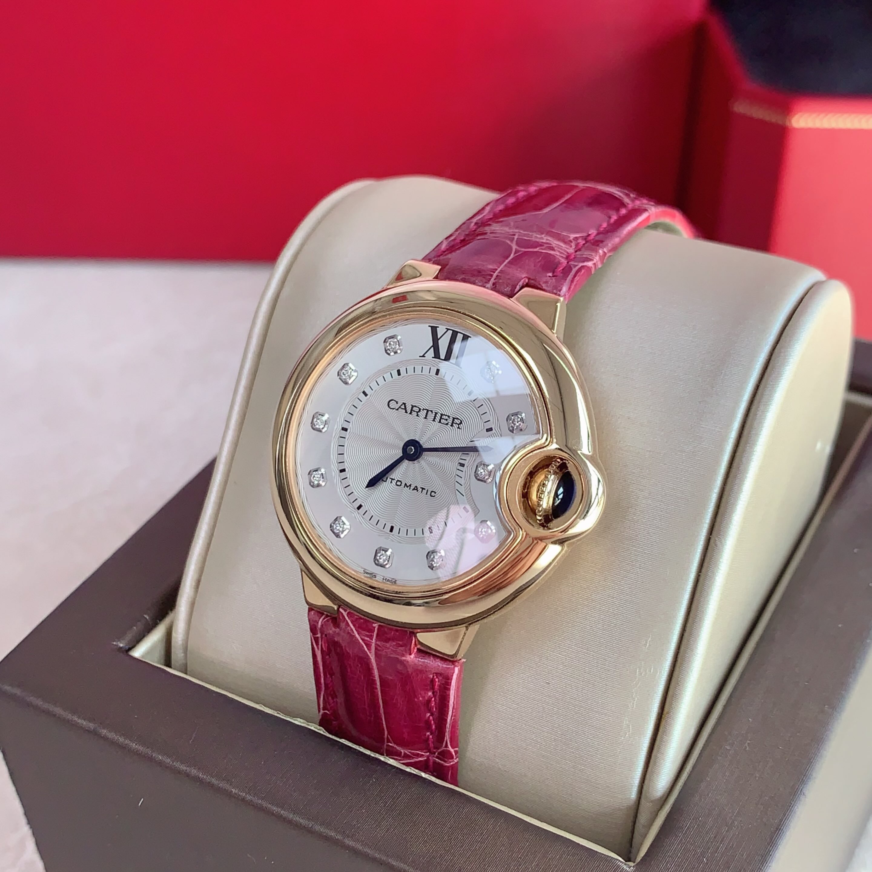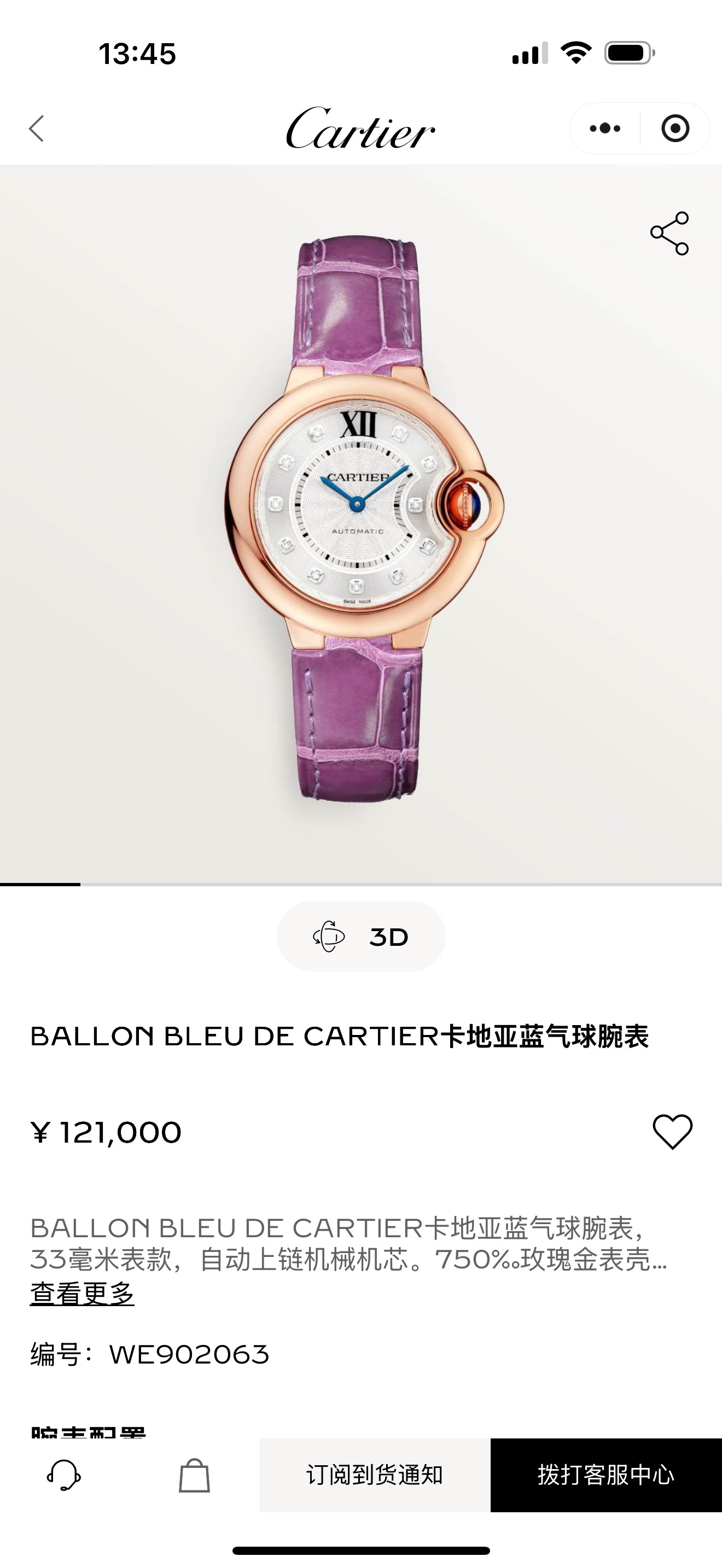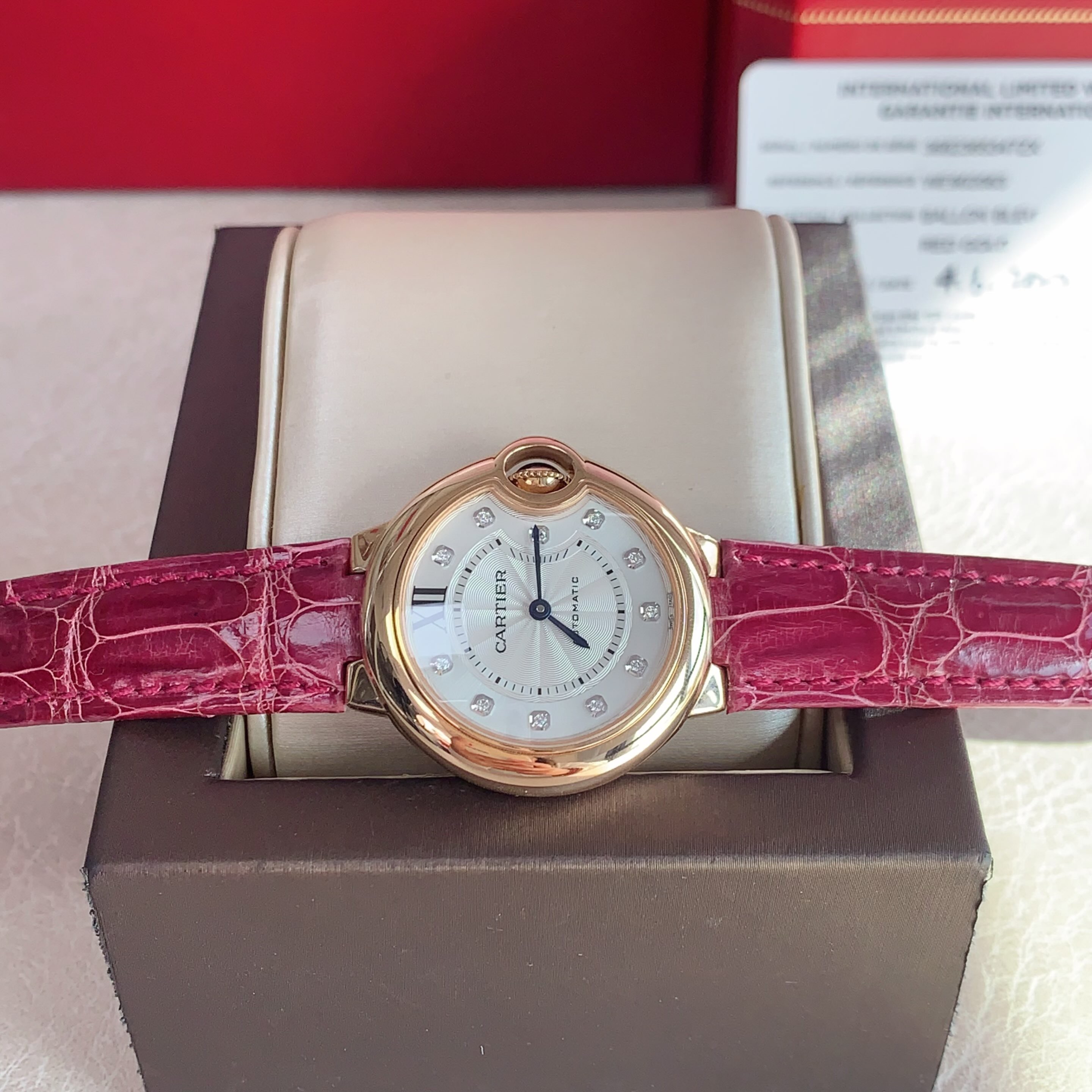 卡地亚蓝气球WE902063,自动上链机械机芯,表径:33mm表壳厚度:10.16mm,玫瑰金表壳,凹槽式表冠,镶嵌一颗凸圆形蓝宝石。镀银雕纹阳光射线纹饰漆面表盘,镶嵌11颗钻石,总重0.05克拉。剑形蓝钢指针。蓝宝石水晶镜面。亮紫色鳄鱼皮表带,14毫米750%玫瑰金针扣式表扣柜柜价121000。