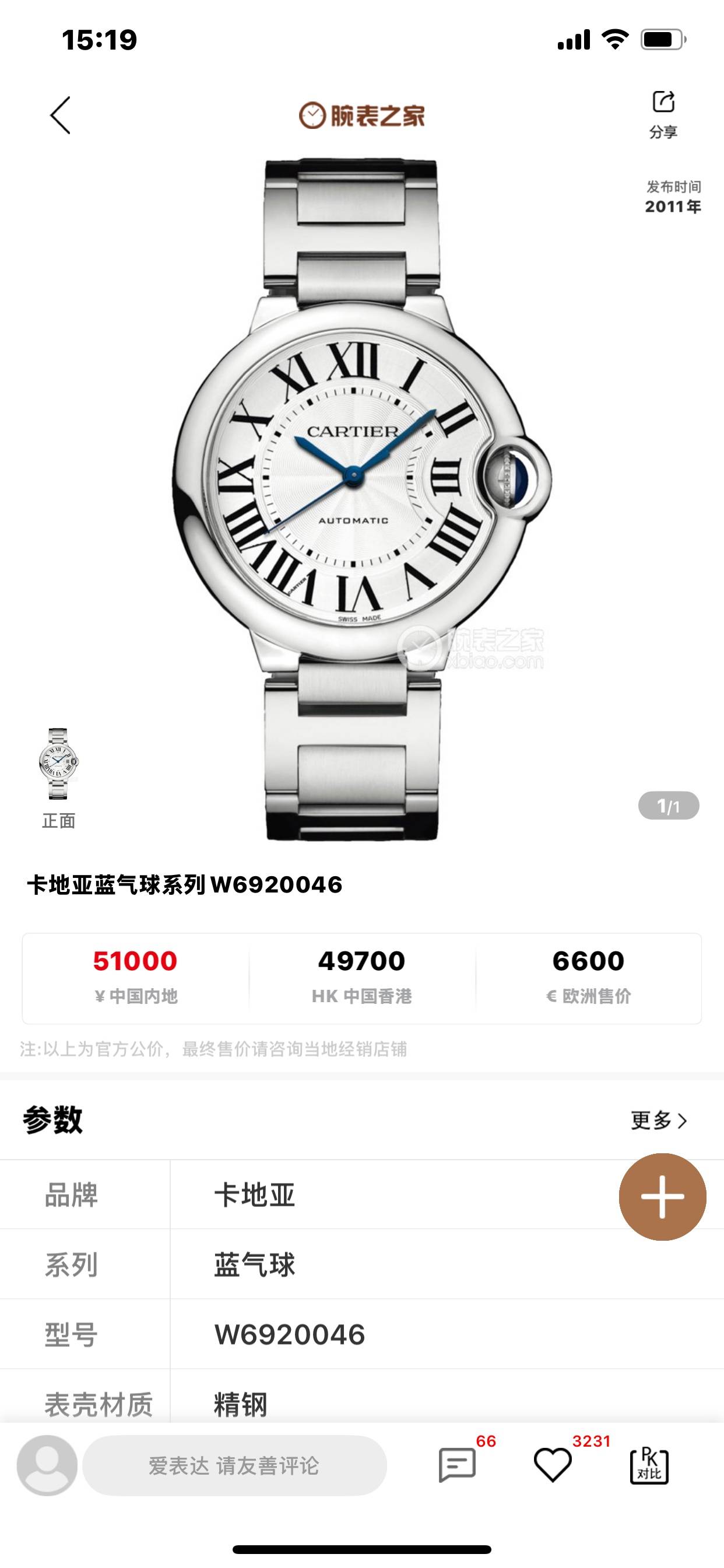 卡地亚蓝气球BALLON BLANCW6920046机械中性