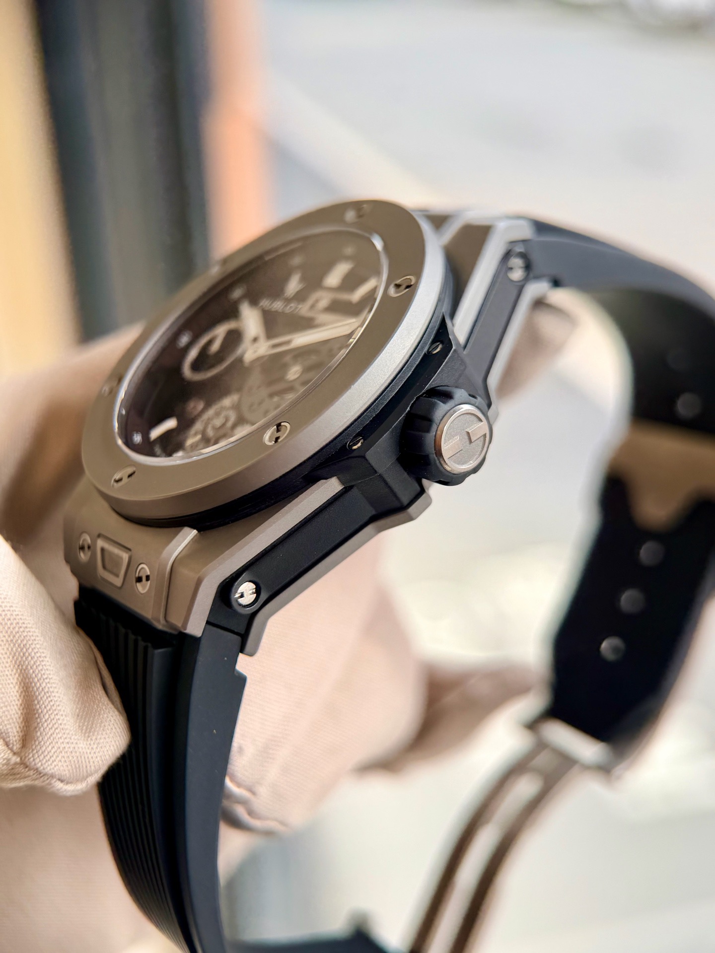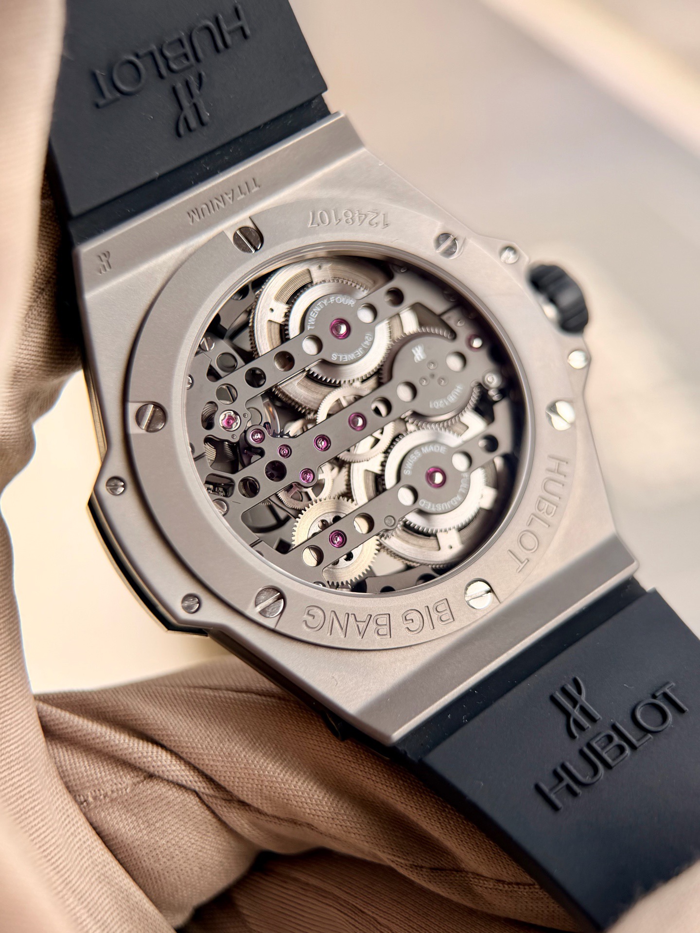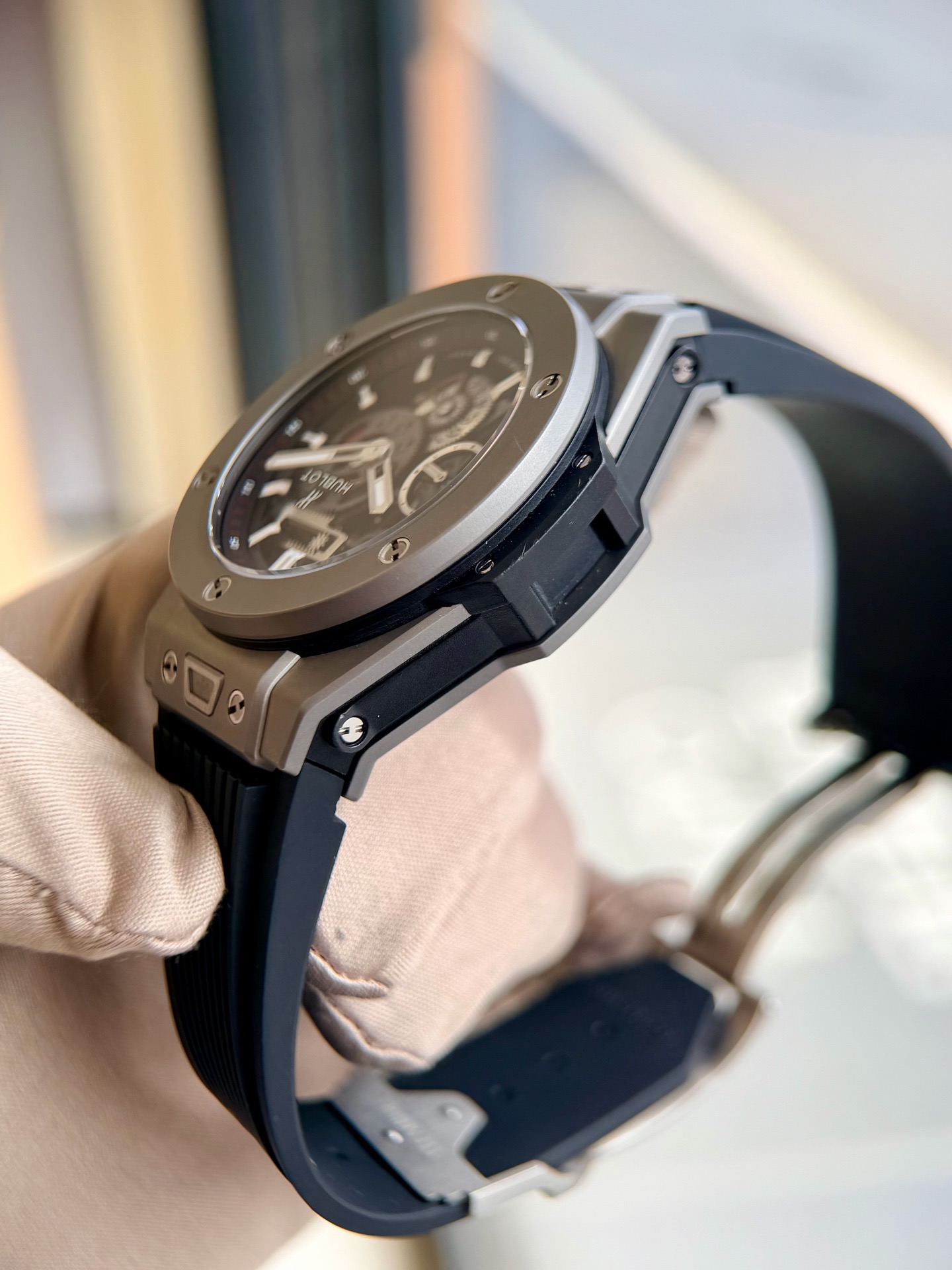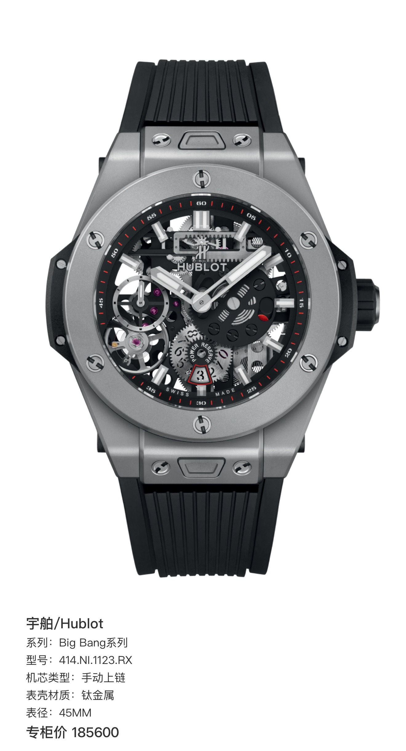 宇舶Big Bang系列414.NI1123十日链,44mm表径 钛金属材质 自产HUB1201全镂空机芯,正面三个动储设计(滑尺 储能数字盘 储能颜色盘)机芯骨架结构设计 看得到的机械层次美感 十天动力储存防水深度100米,可适配任意颜色表带 店内现货好价