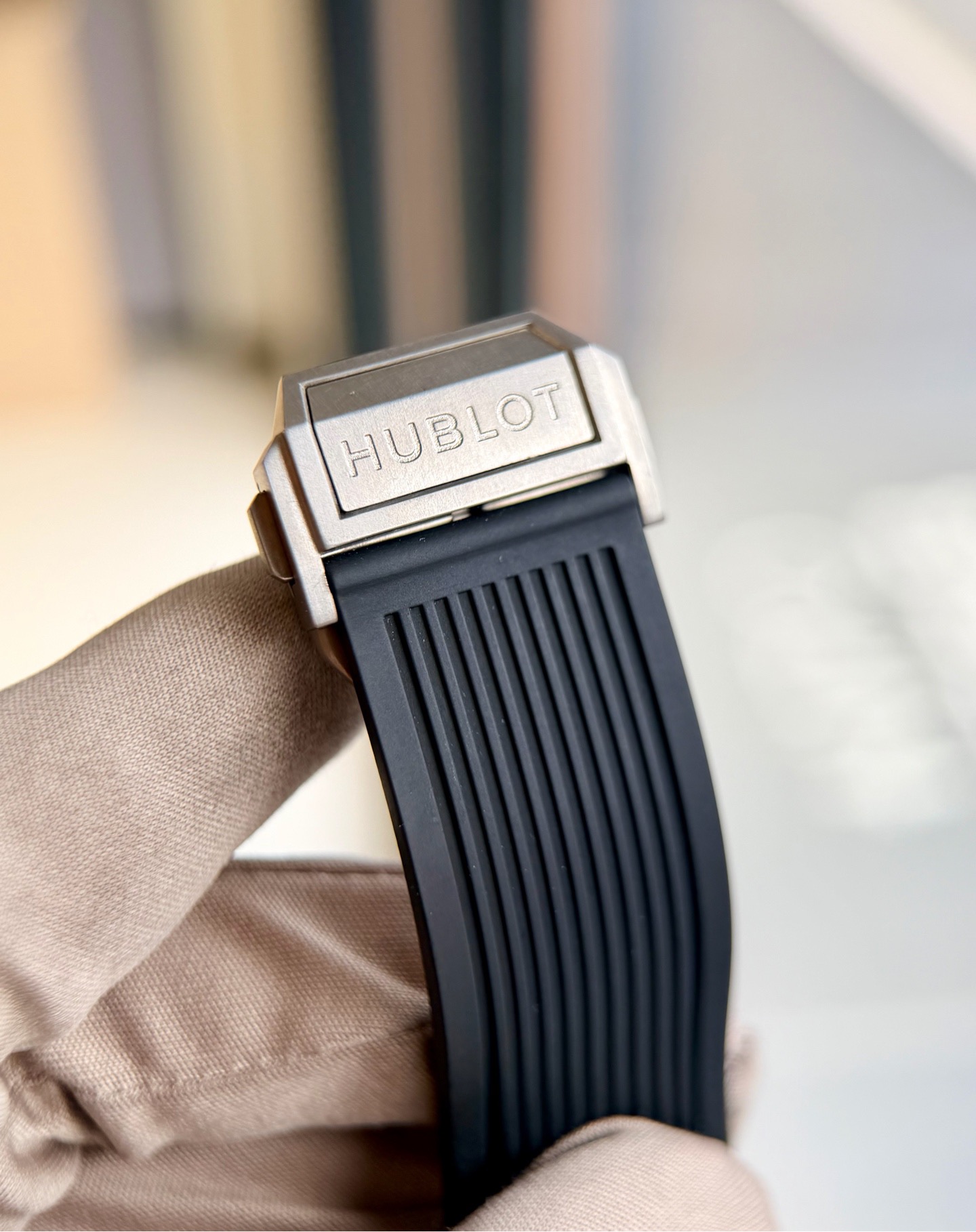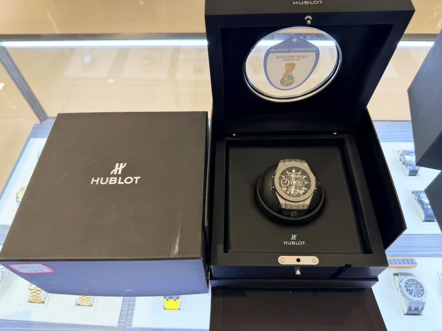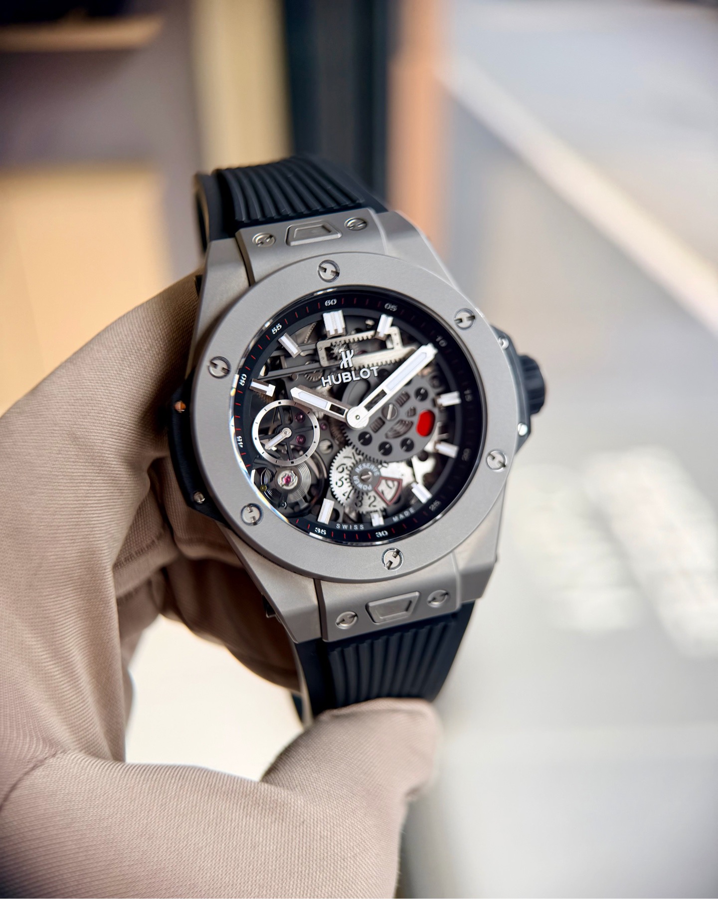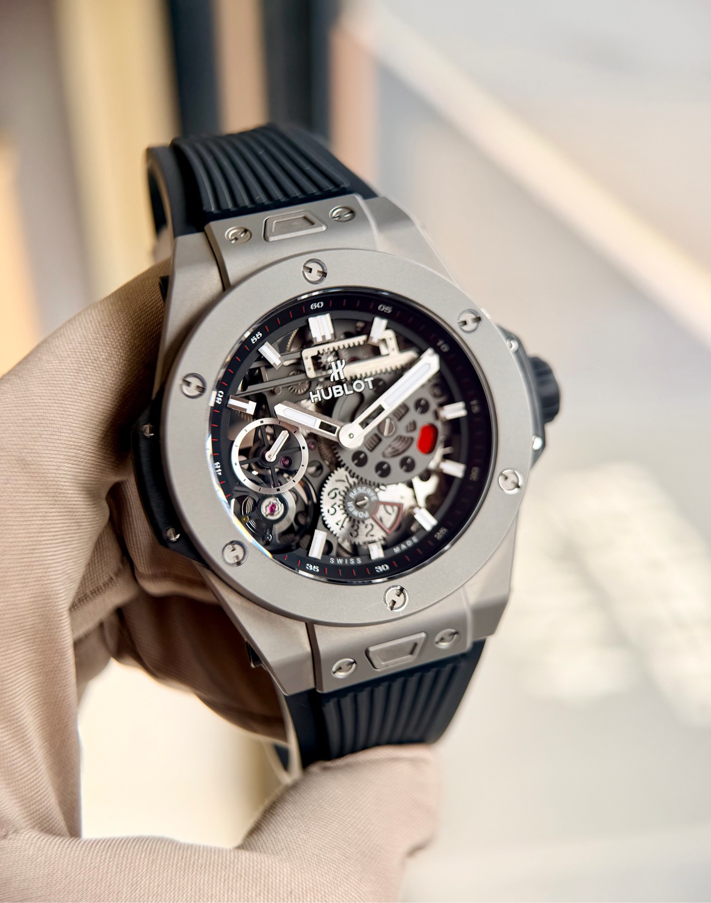 宇舶Big Bang系列414.NI1123十日链,44mm表径 钛金属材质 自产HUB1201全镂空机芯,正面三个动储设计(滑尺 储能数字盘 储能颜色盘)机芯骨架结构设计 看得到的机械层次美感 十天动力储存防水深度100米,可适配任意颜色表带 店内现货好价
