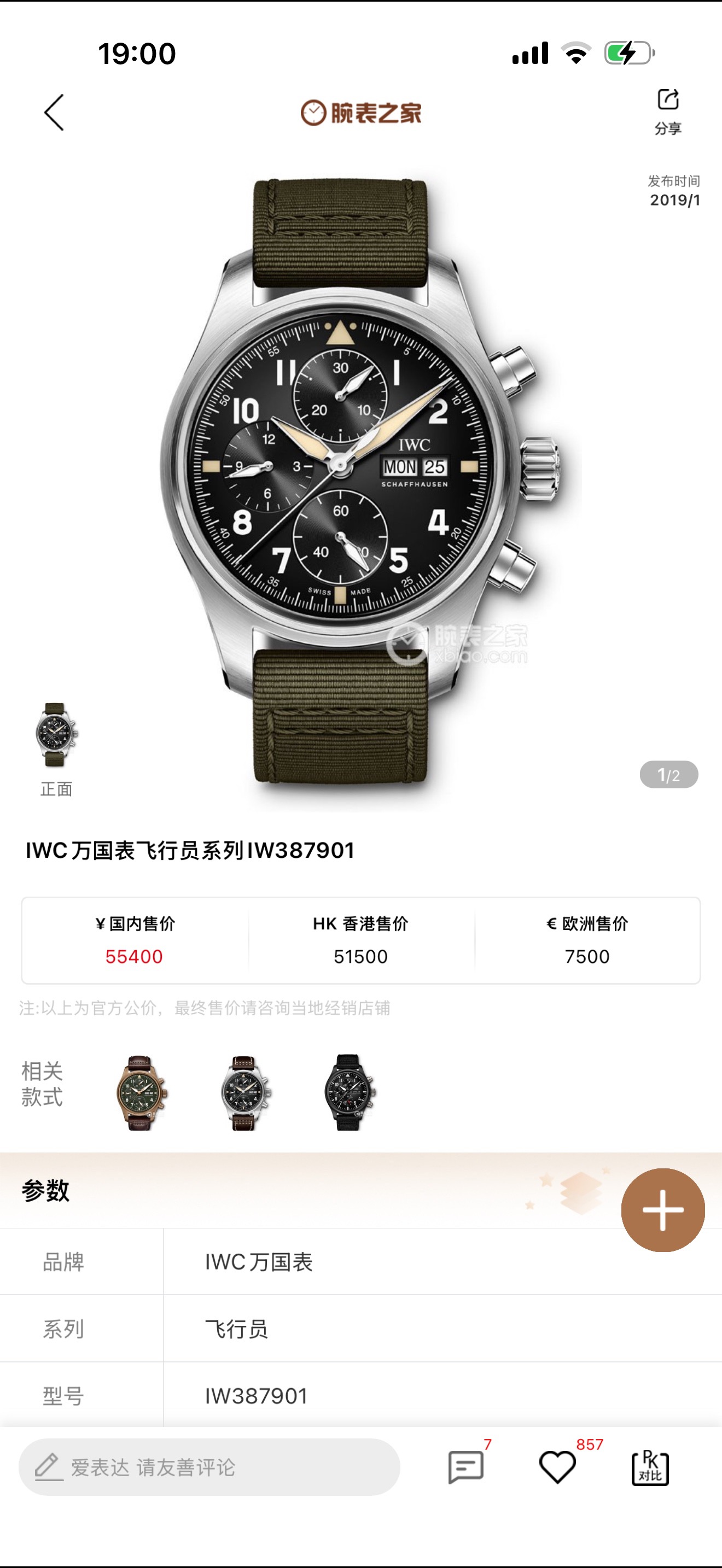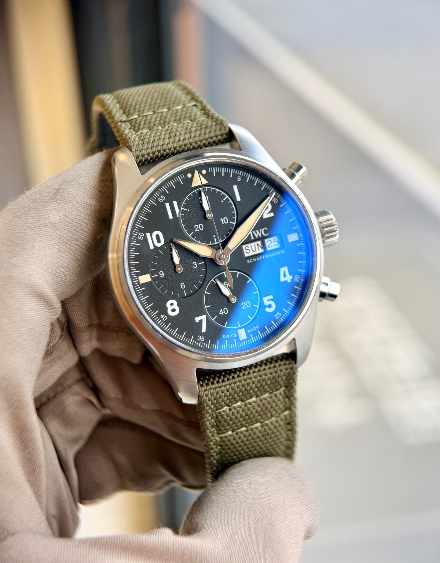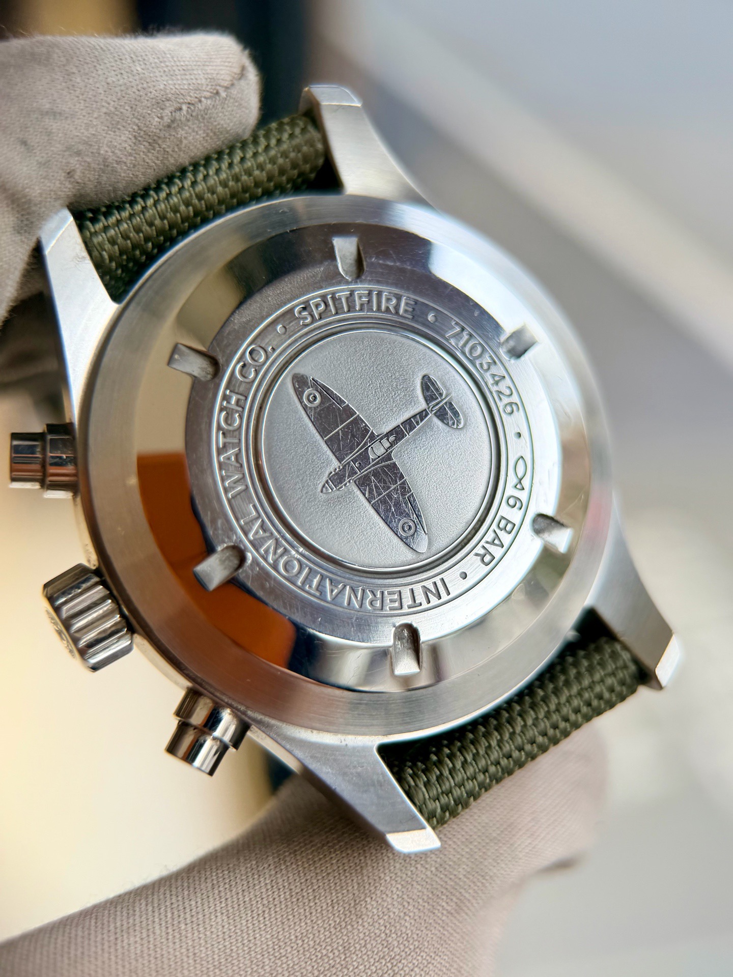 万国飞行员系列IW387901喷火战机,41mm表径 精钢材质 磨砂黑色表盘 阿拉伯数字时标 棒状指针 军绿色表带复古风十足 星期日历/计时/防磁功能完美结合,专柜55400元全套极品延保31年现货好价