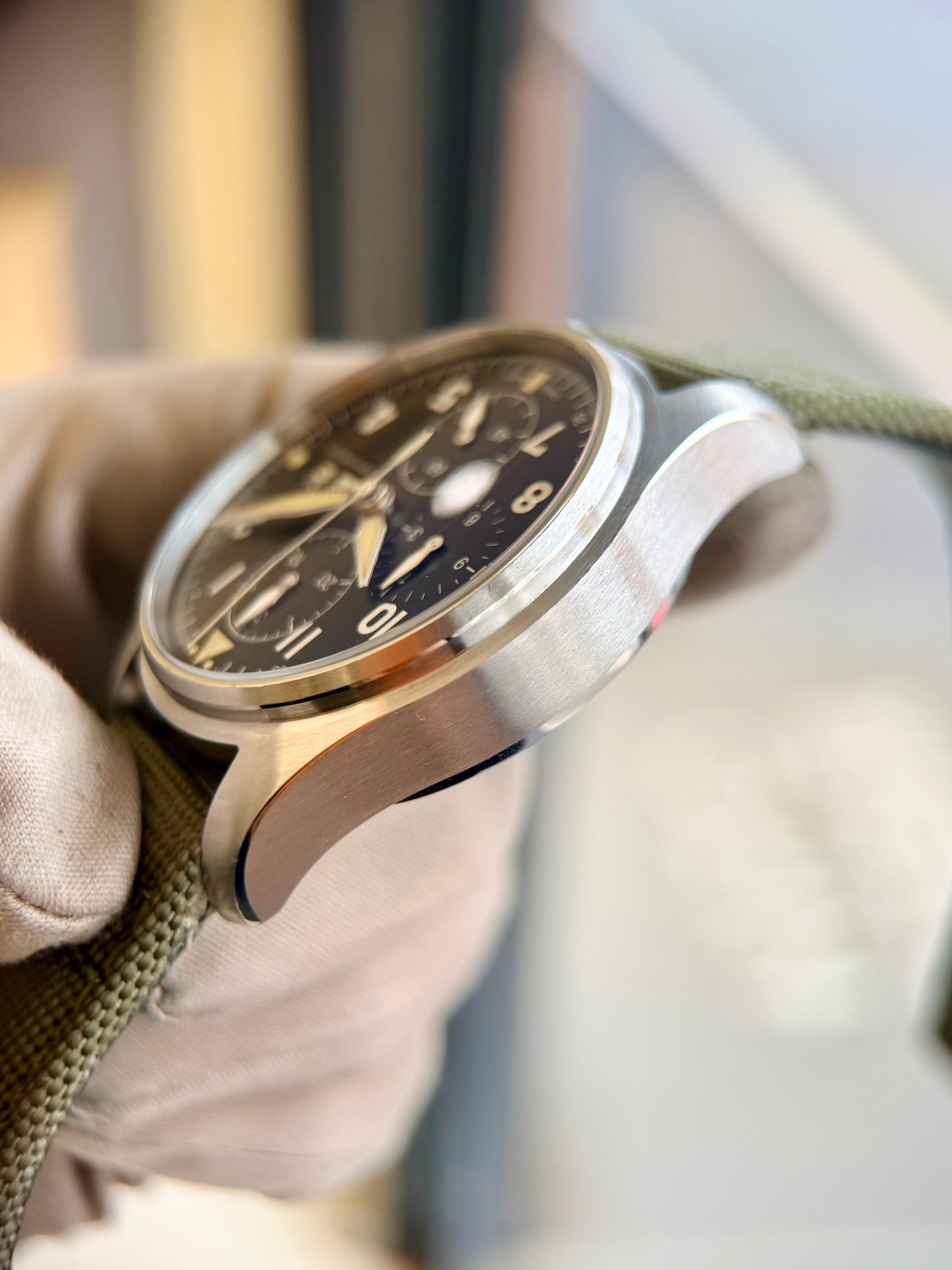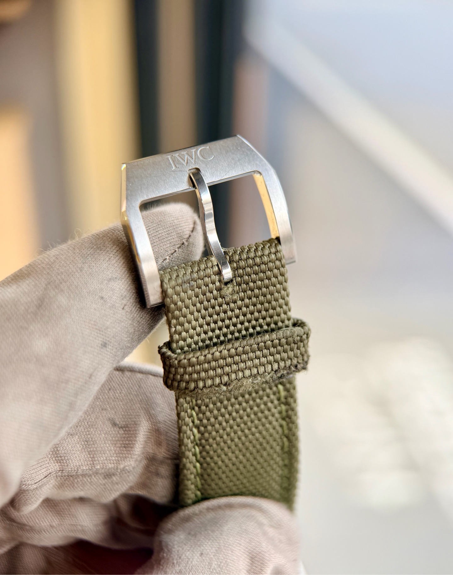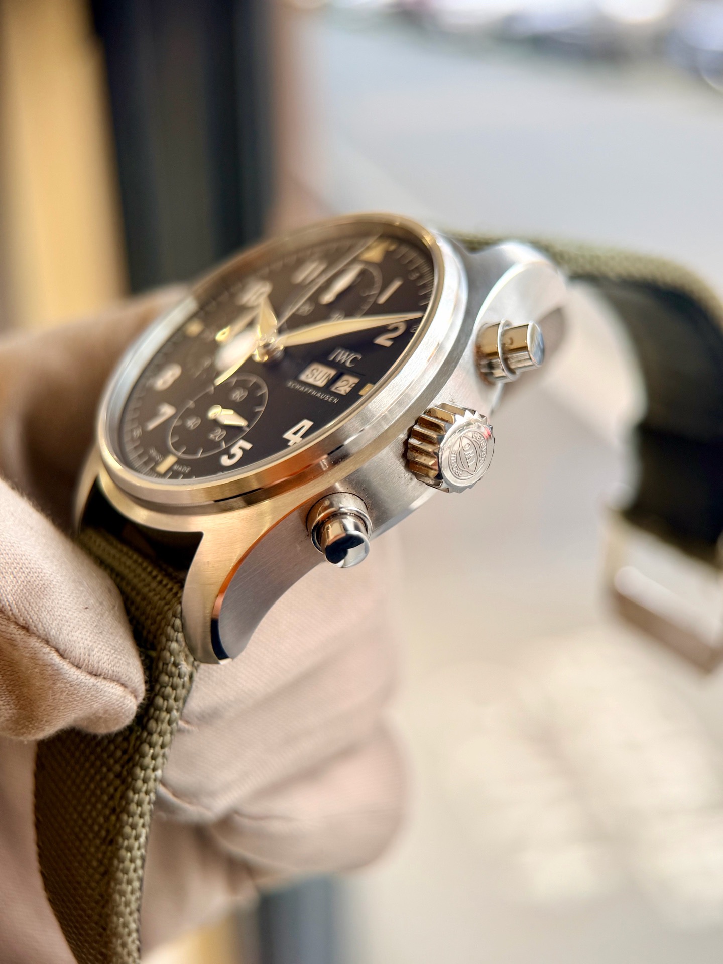 万国飞行员系列IW387901喷火战机,41mm表径 精钢材质 磨砂黑色表盘 阿拉伯数字时标 棒状指针 军绿色表带复古风十足 星期日历/计时/防磁功能完美结合,专柜55400元全套极品延保31年现货好价