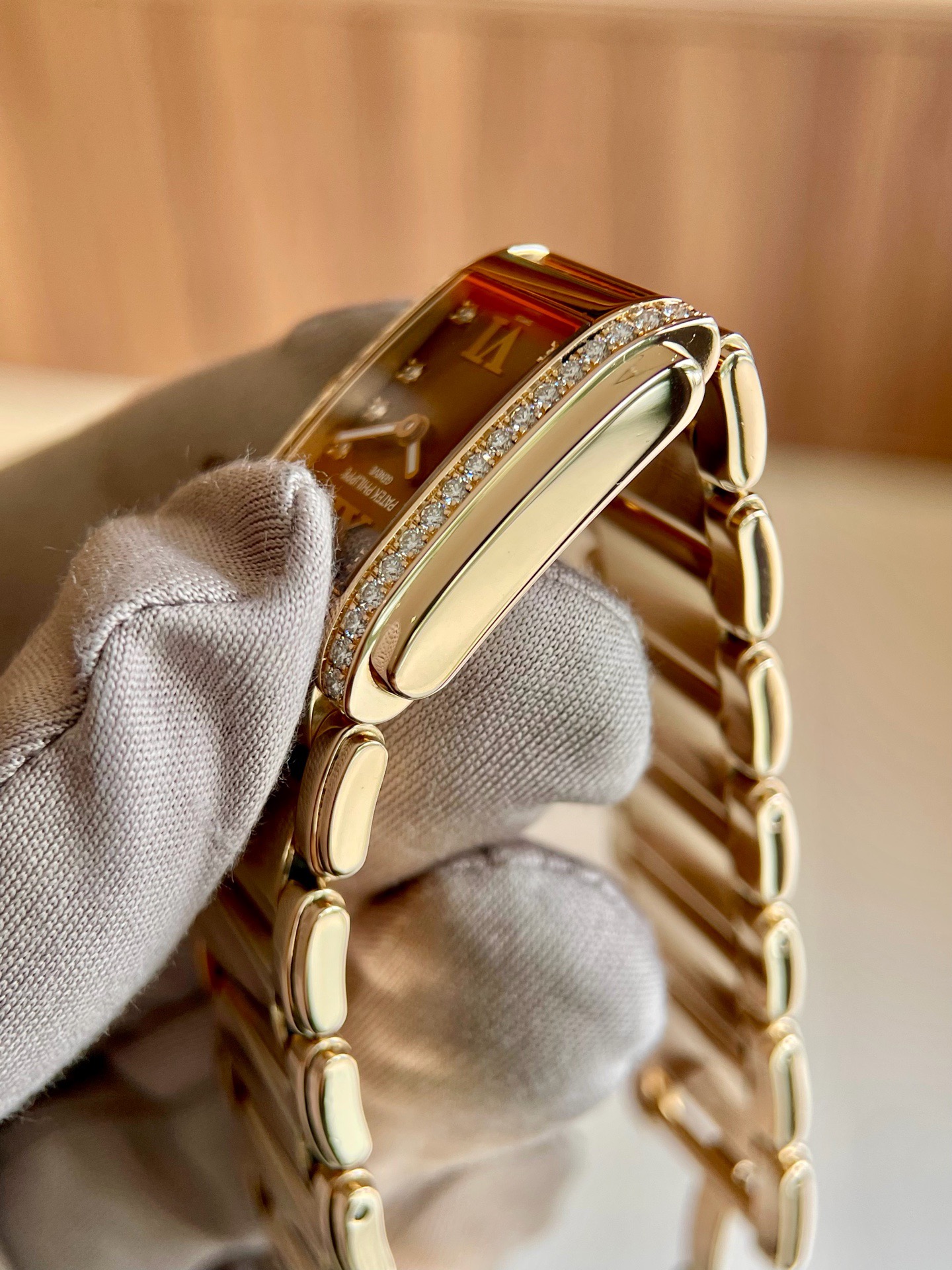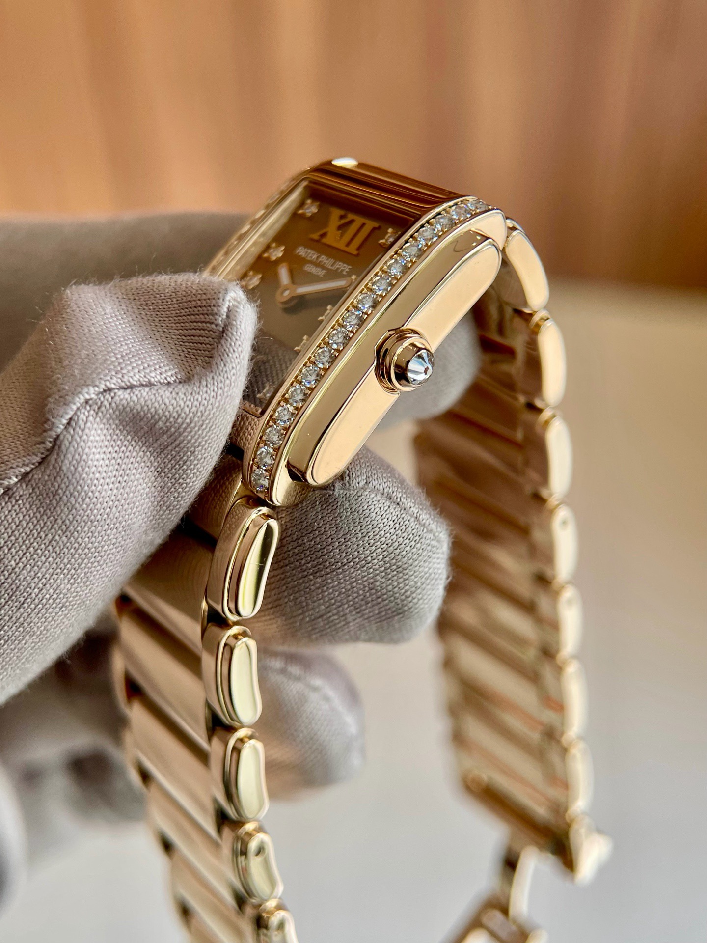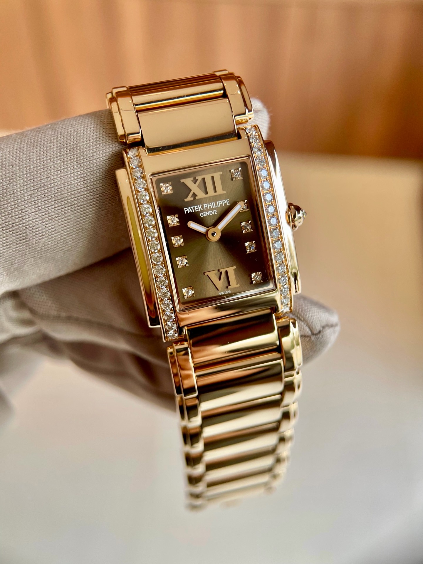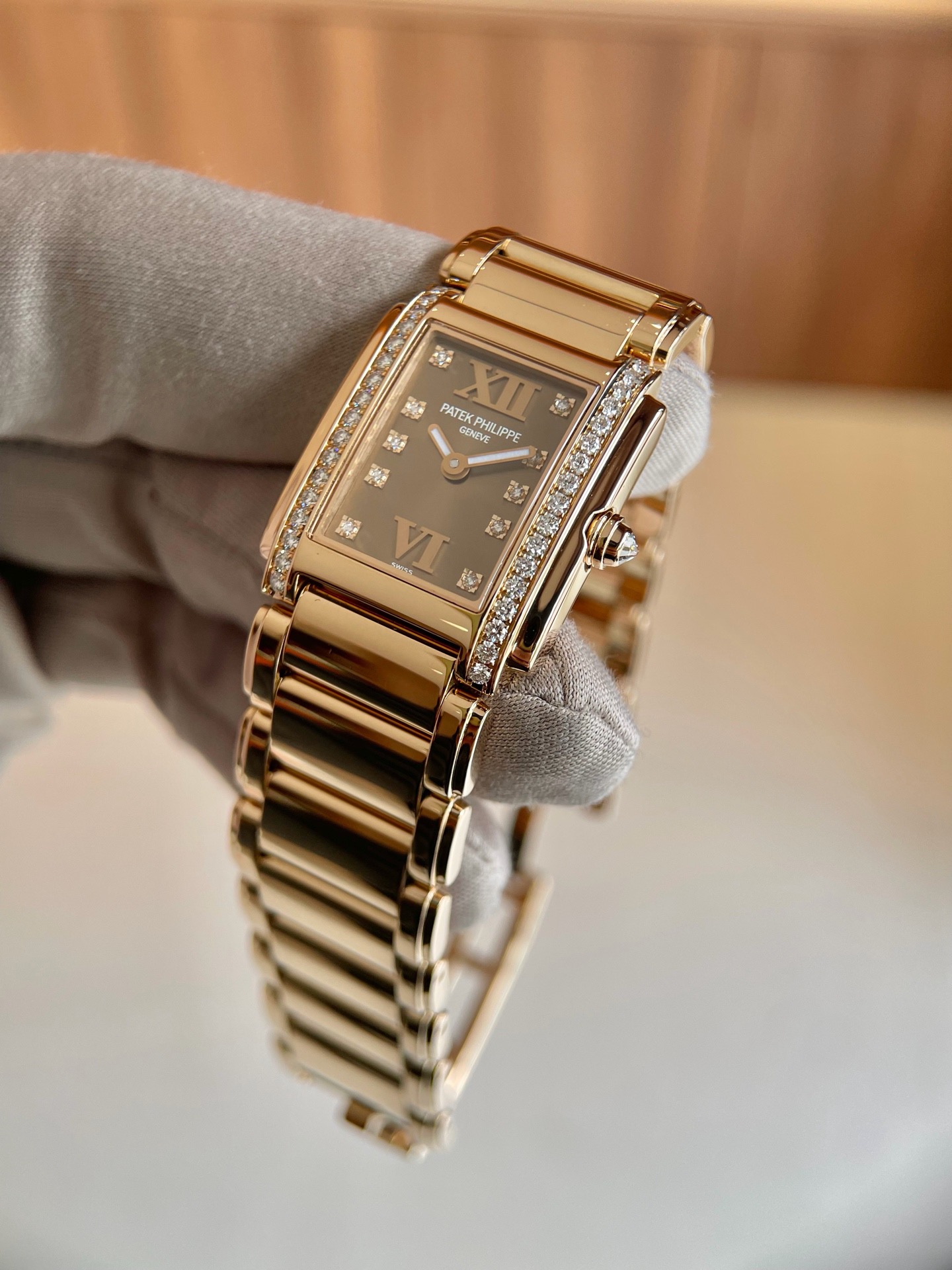 百达翡丽TWENTY-4系列4908咖啡糖,22x27mm表径 整表18k玫瑰金材质 原镶钻石表壳钻石刻度,实物巨美上手超豪 专柜30万元店内现货,全套全长