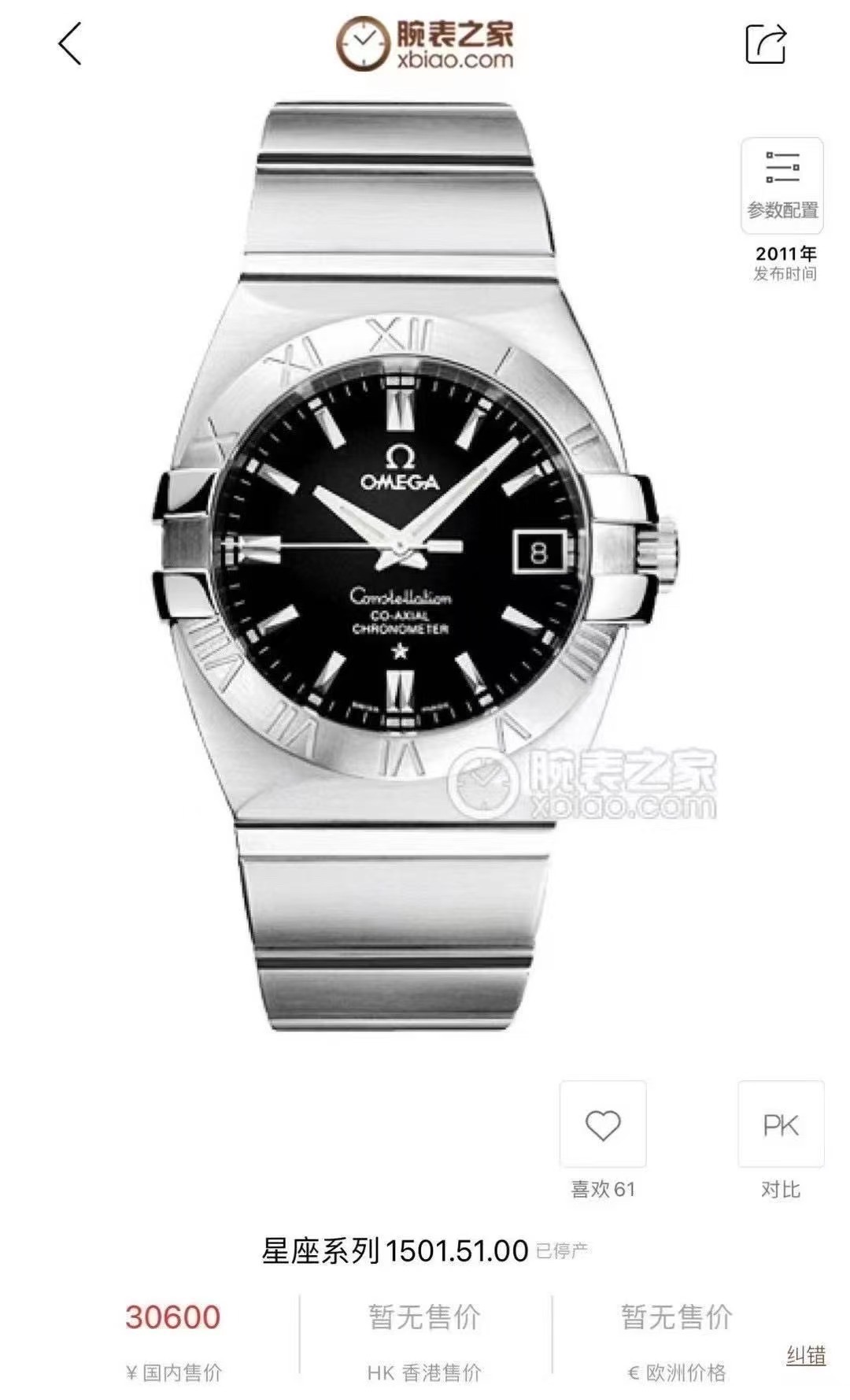 Omega 欧米茄 星座系列 1501.51.00,自动机械男表,表径35mm,腕周约180mm,59字头,二手单表,公价¥30600