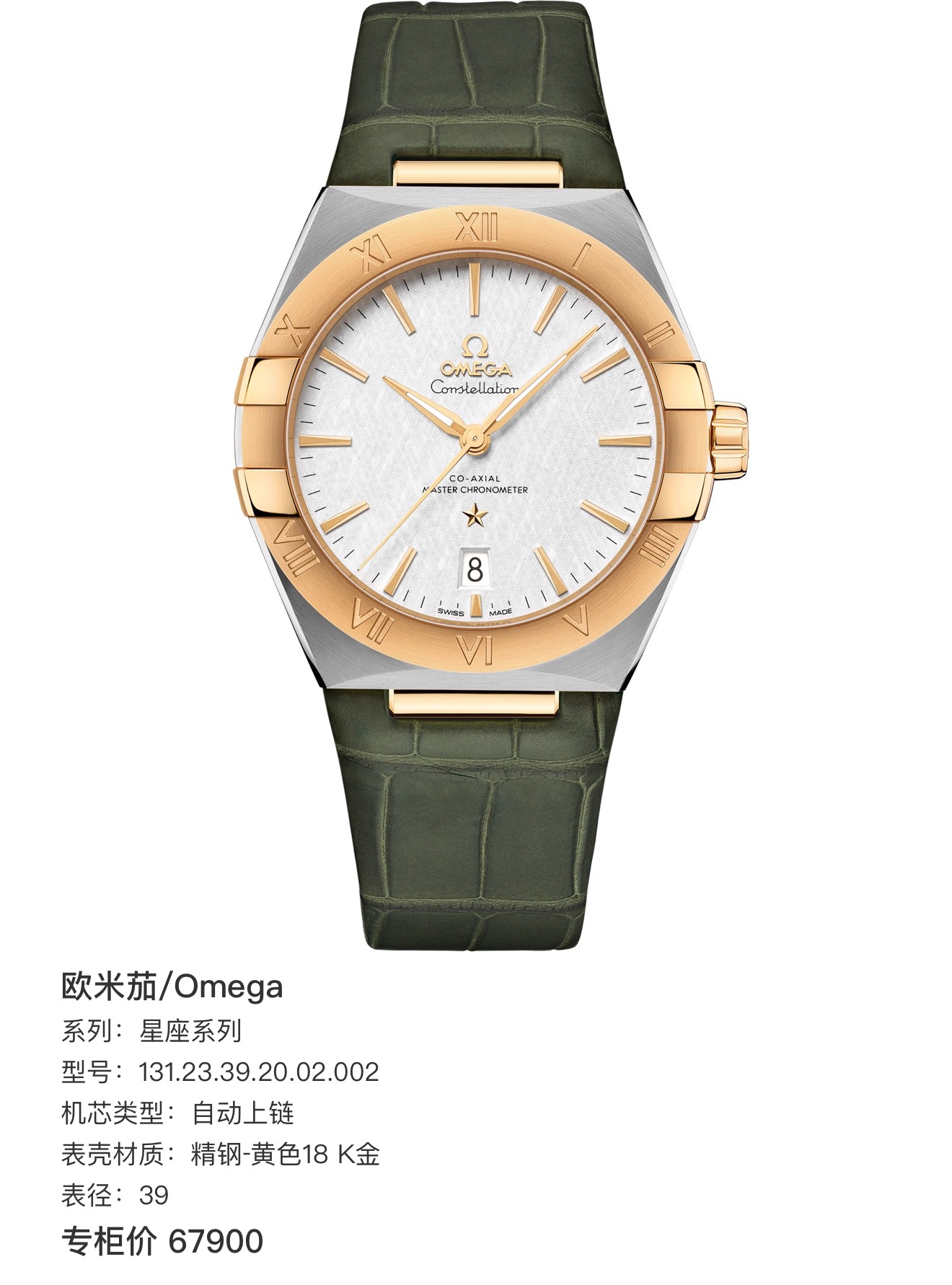 欧米茄/Omega 星座系列 131.23.39.20.02.002 自动上链 精钢‑黄色18 K金 39 专柜价67900。
