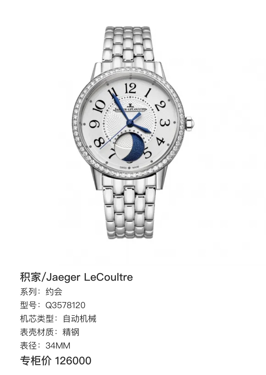 积家/Jaeger LeCoultre 约会 Q3578120 自动机械 精钢 34MM 专柜价126000。